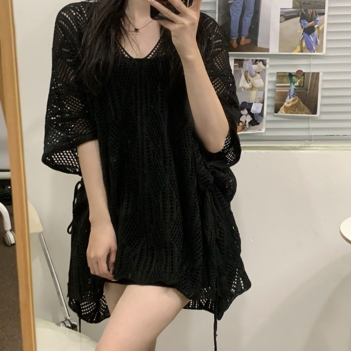 독특하고 세련된 펀칭 스타일 얇은 풀오버 니트웨어 2025 여름 루즈핏 베이스 셔츠 여성용 탑
