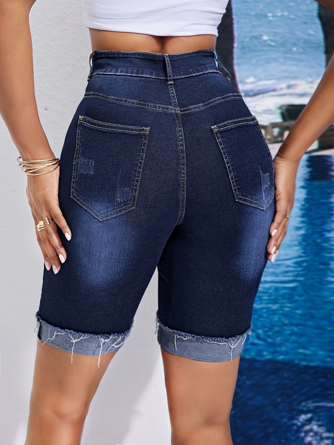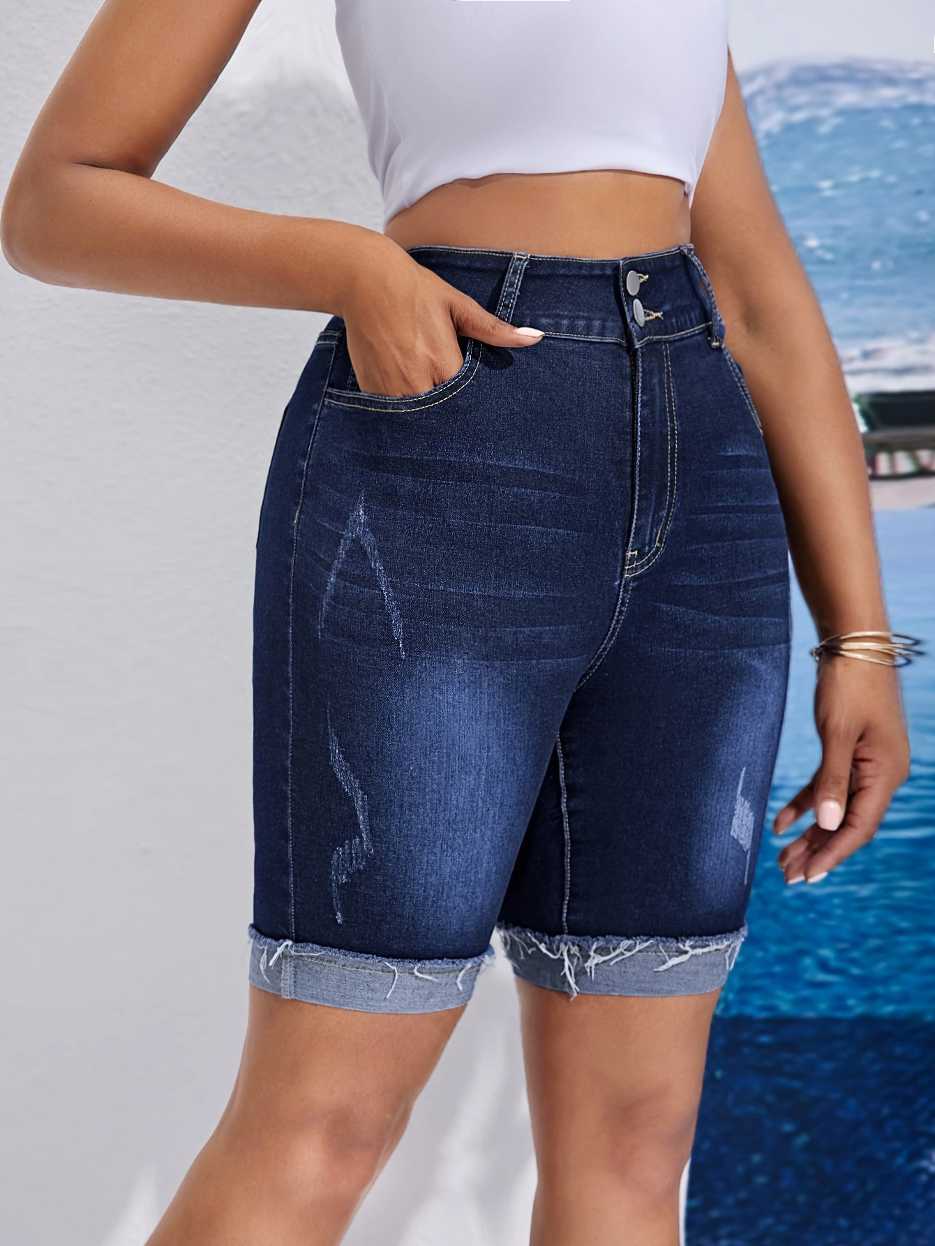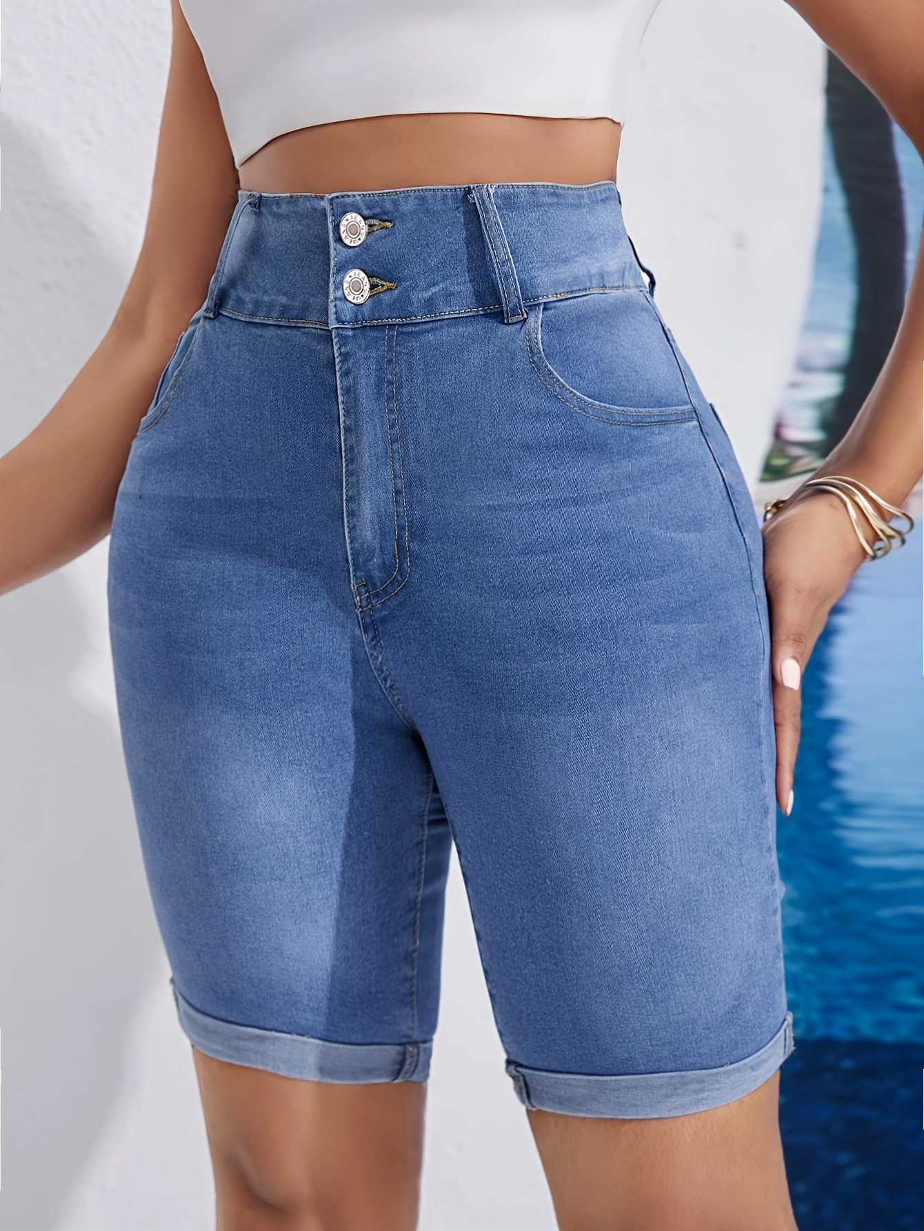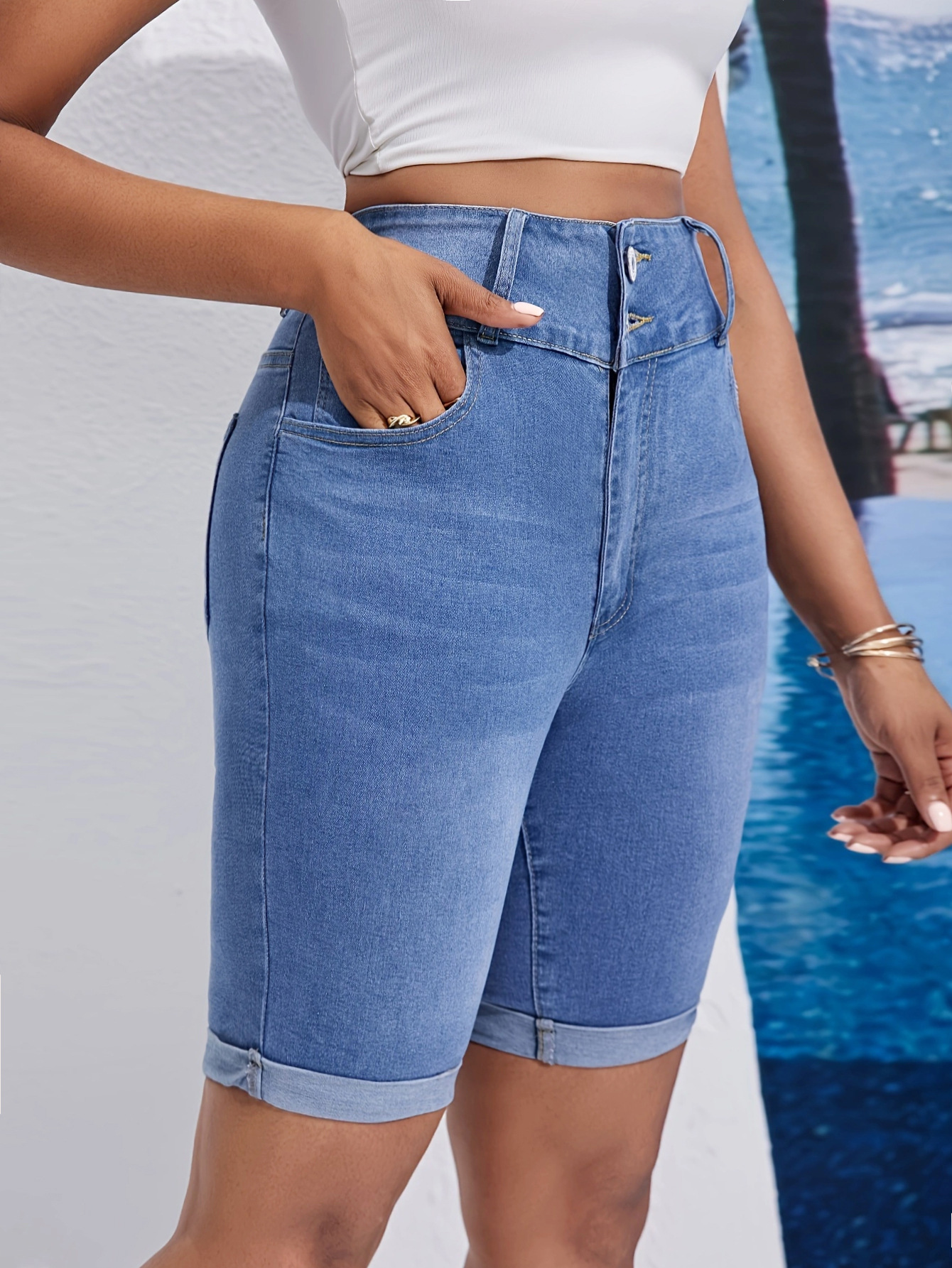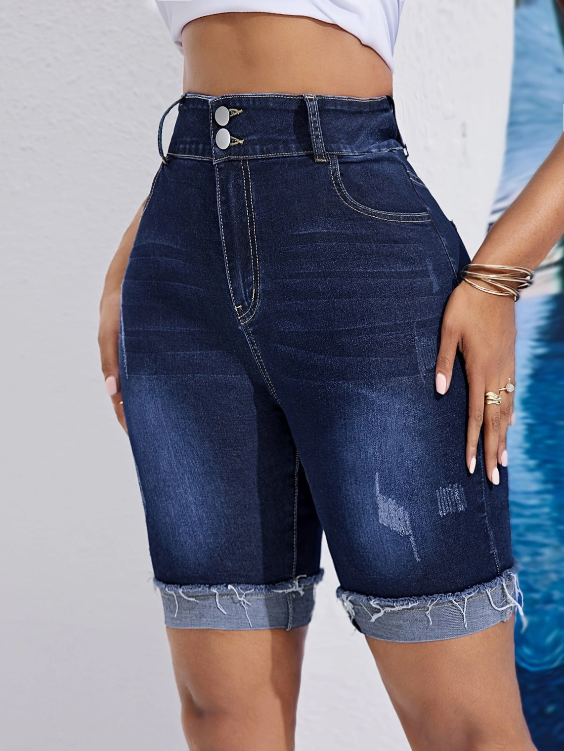 유럽과 미국 여성의 높은 허리 더블 버클 중간 길이 바지, Curled Edge 탄성 데님 바지 타기 바지