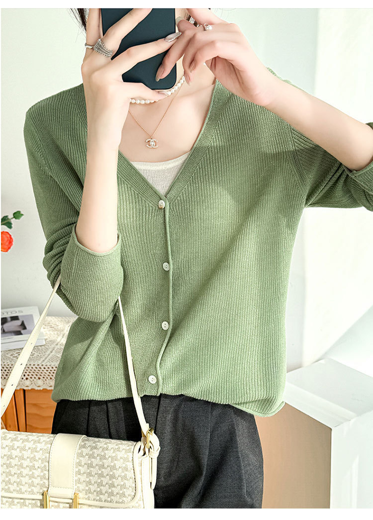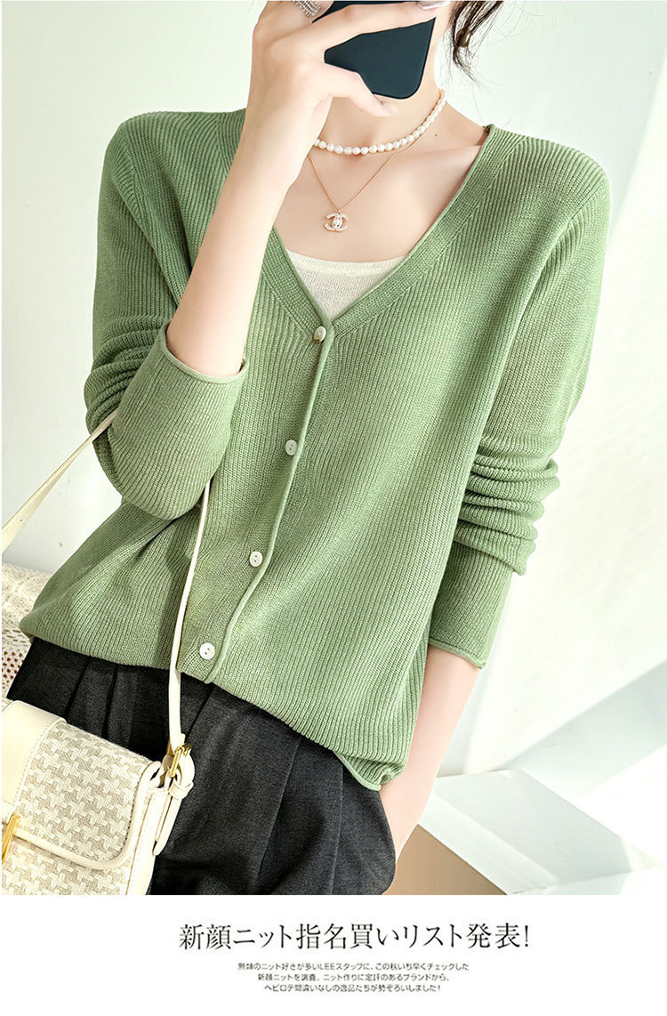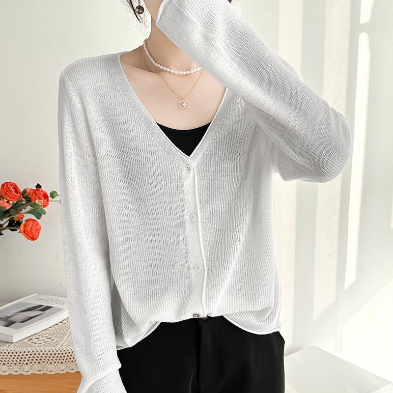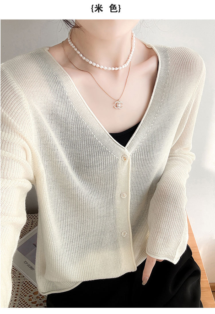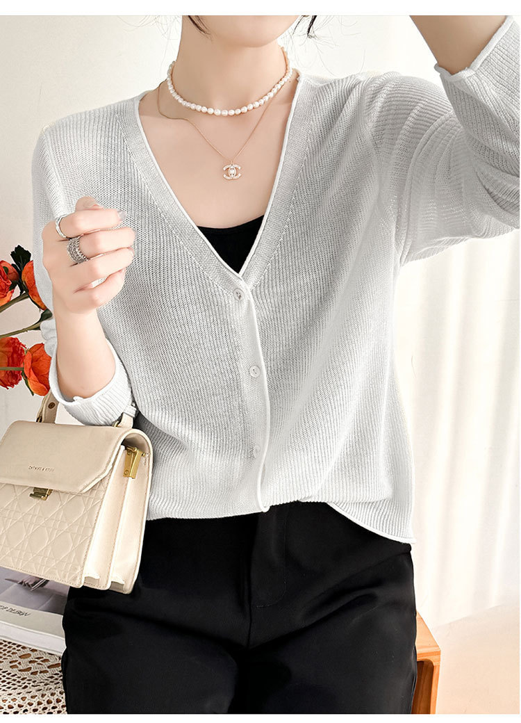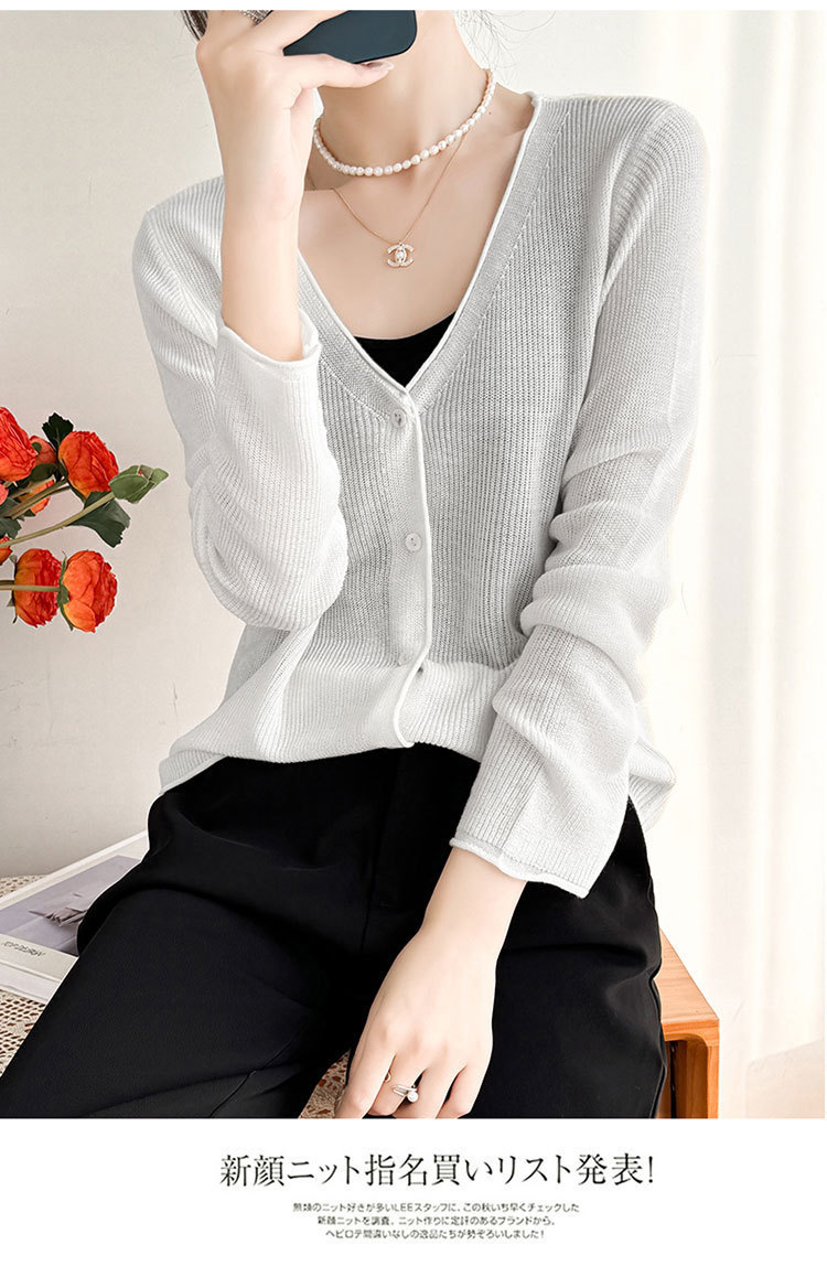 V-Neck 아이스 실크 니트 카디건 여성용 봄과 여름 얇은 롤업 긴팔 선스크린 셔츠 빈 코트 탑 에어컨 셔츠