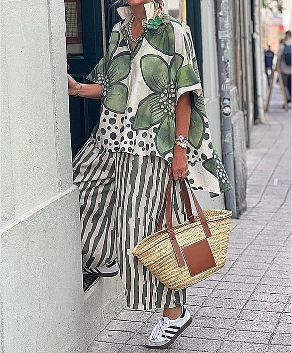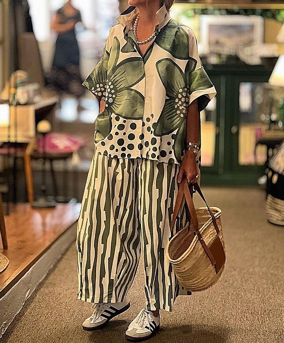 2025 새로운 유럽과 미국의 여름 국경 독립 역 아마존 여성 옷깃 느슨한 기하학적 인쇄 캐주얼 세트스토어 가기