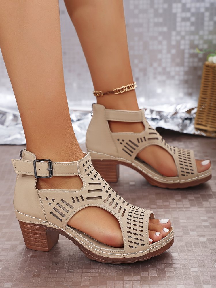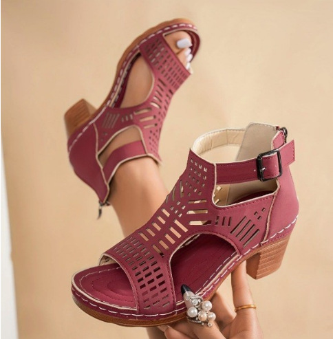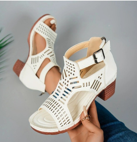 국경 간 플러스 사이즈 두꺼운 힐 샌들 여성 2025 년 여름 새로운 TEUM 폭발 한 단어 할로우 샌들 여성스토어 가기