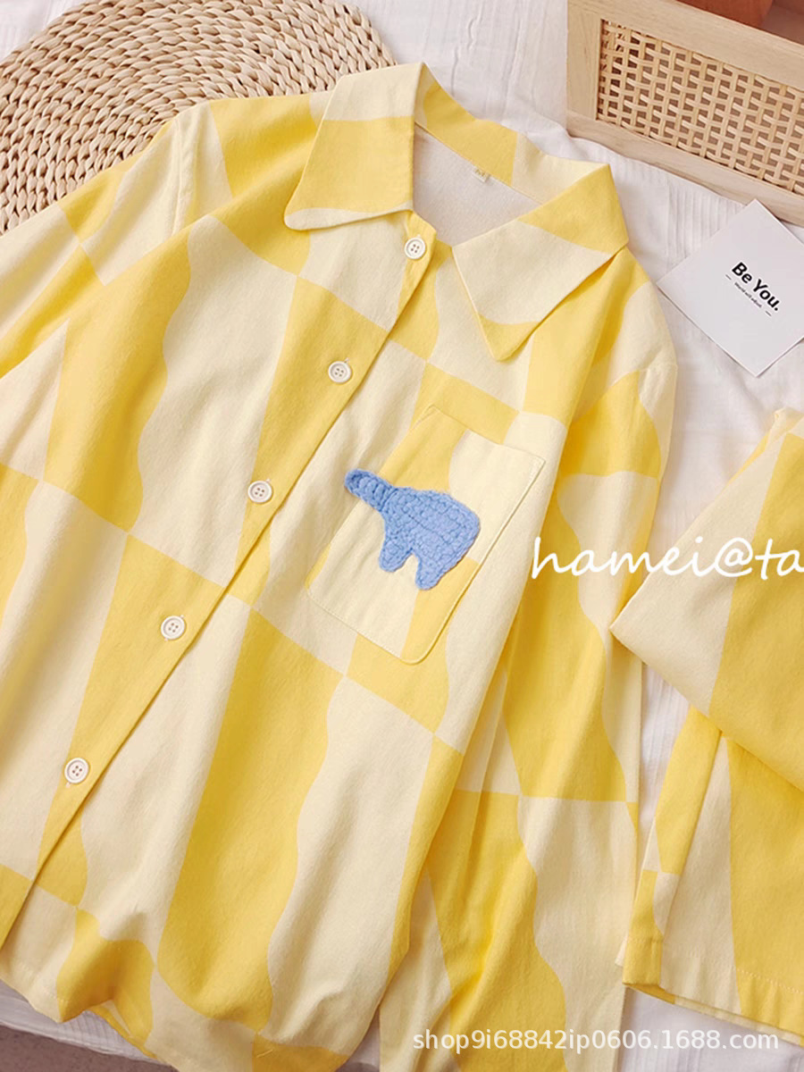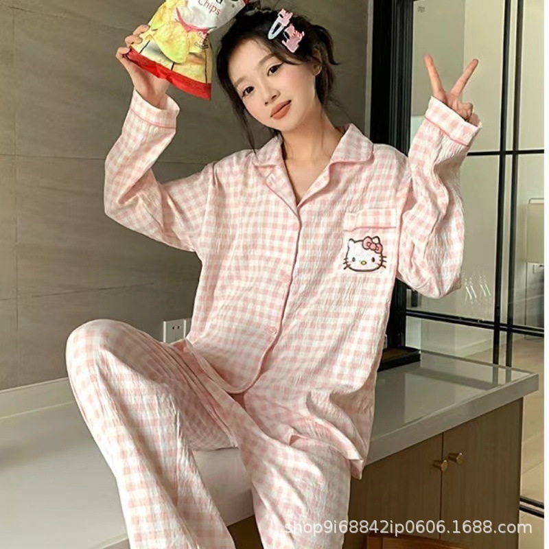 2025년 신상 여성용 클라우드 코튼 잠옷, 봄/가을 체크무늬 루즈핏 얇은 긴팔 홈웨어 세트, 레이지 스타일