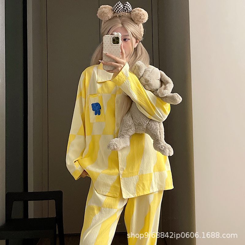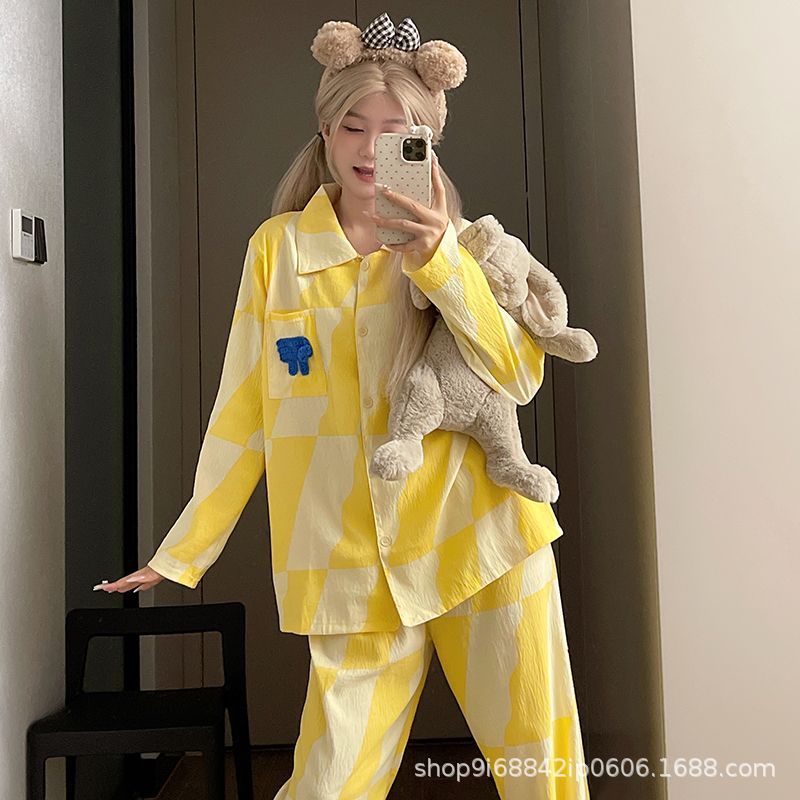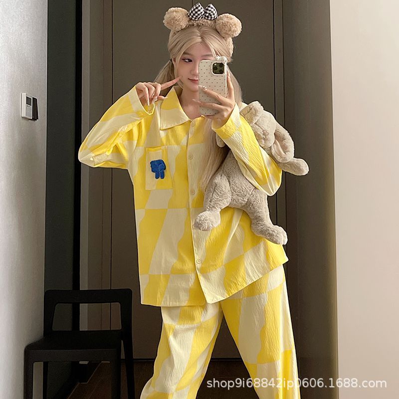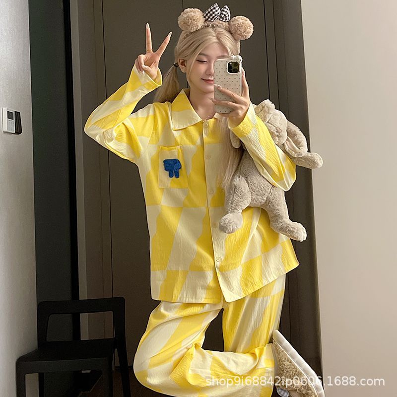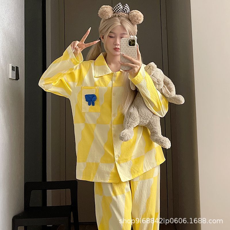 2025년 신상 여성용 클라우드 코튼 잠옷, 봄/가을 체크무늬 루즈핏 얇은 긴팔 홈웨어 세트, 레이지 스타일스토어 가기
