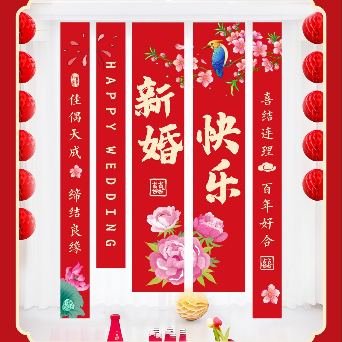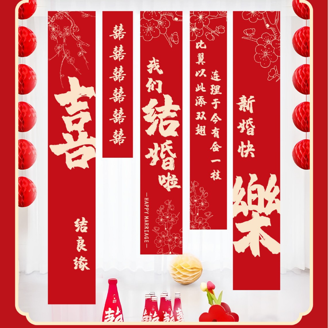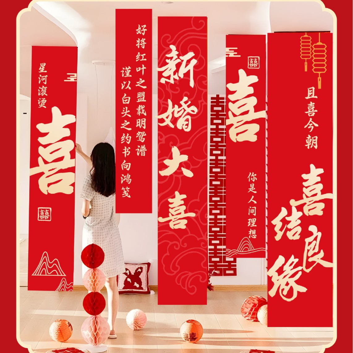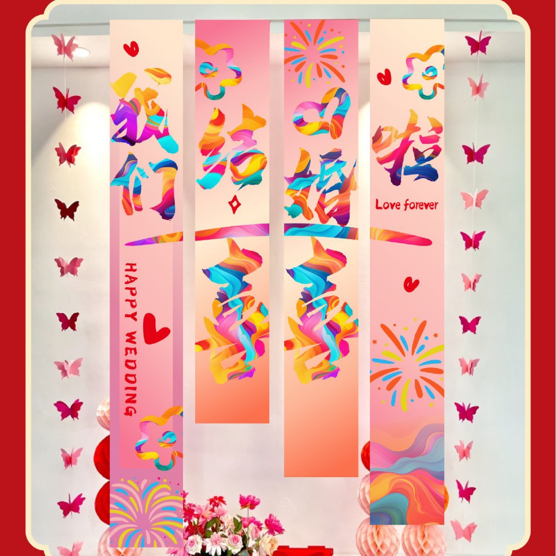 웨딩 배너 웨딩 교수형 천 여자 웨딩 룸 장식 용품 세트 Xi 캐릭터 그리기 꽃 커튼 배경 벽 Xi