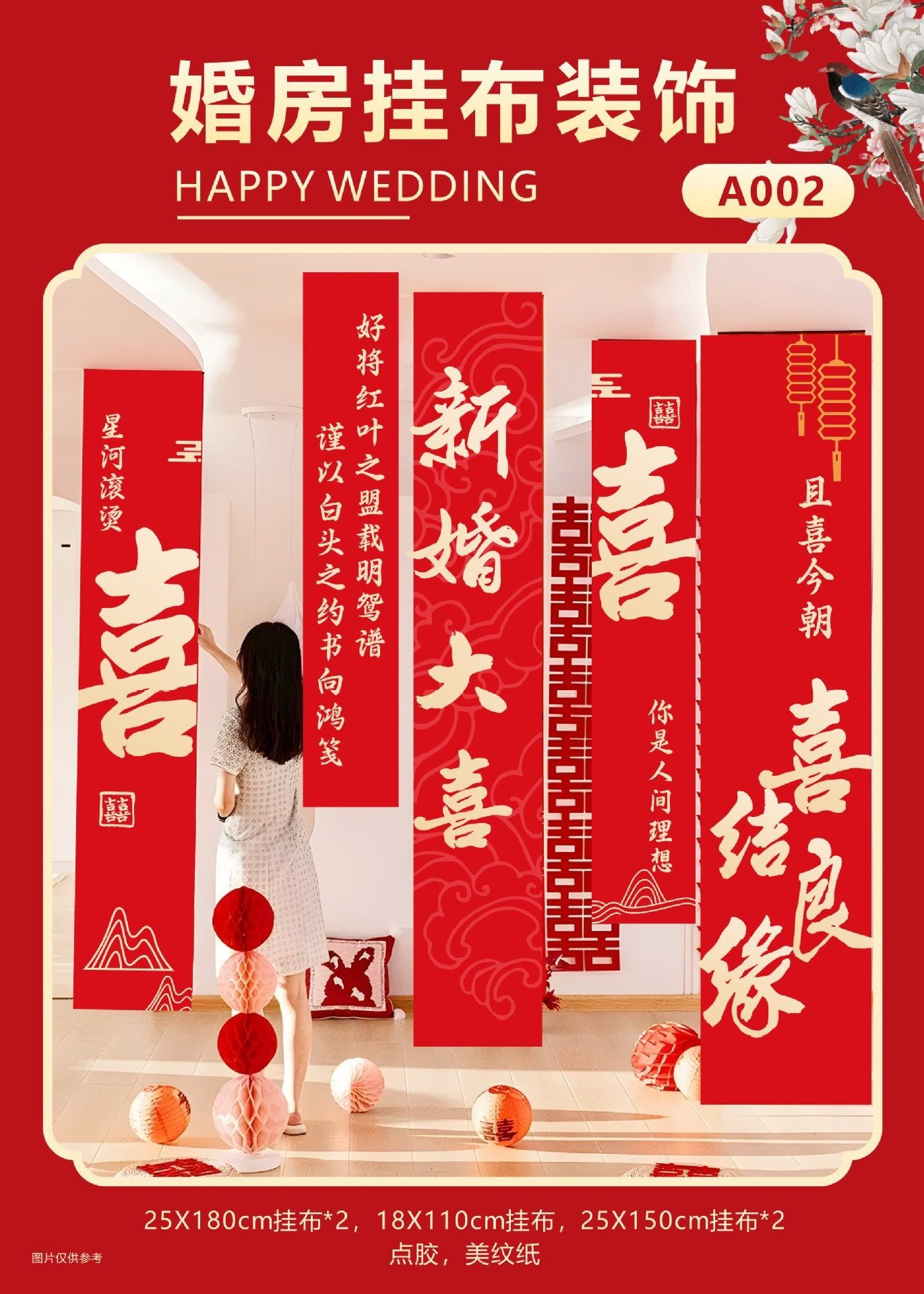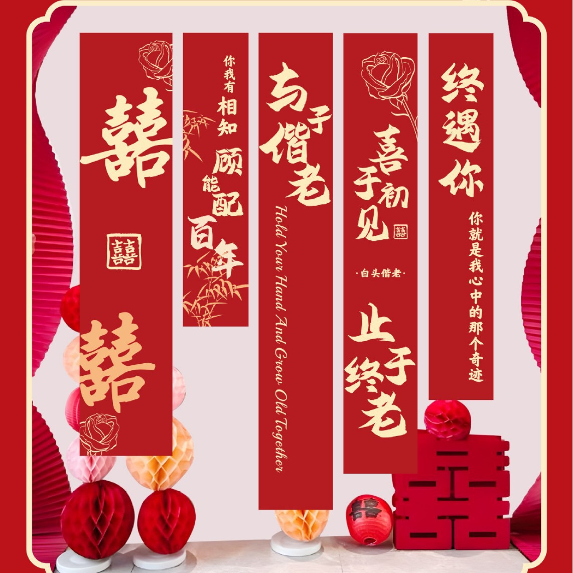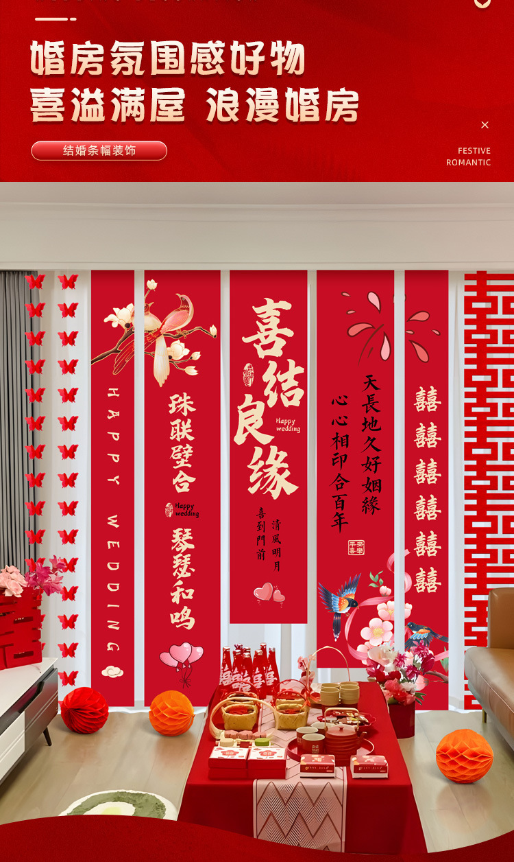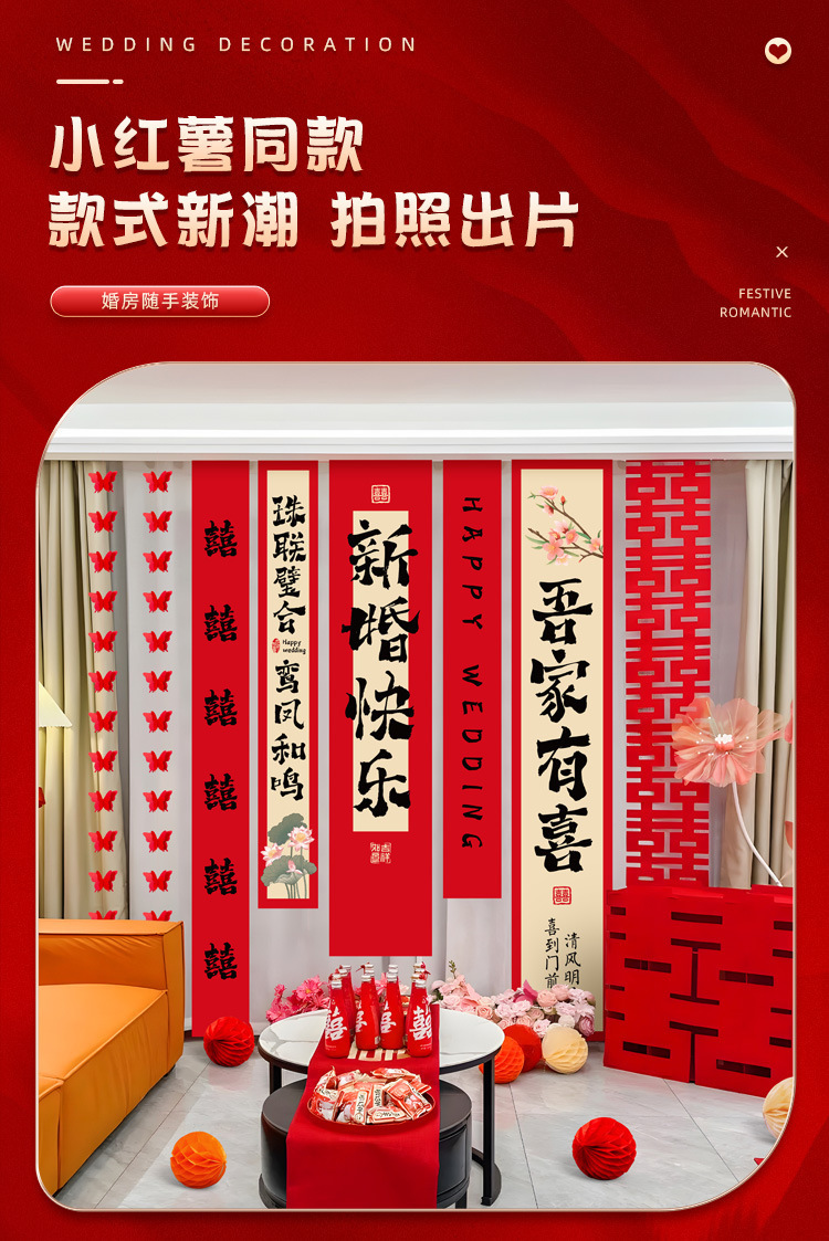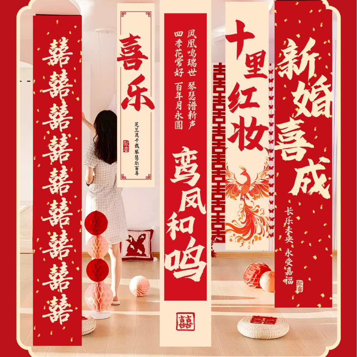 웨딩 배너 웨딩 교수형 천 여자 웨딩 룸 장식 용품 세트 Xi 캐릭터 그리기 꽃 커튼 배경 벽 Xi