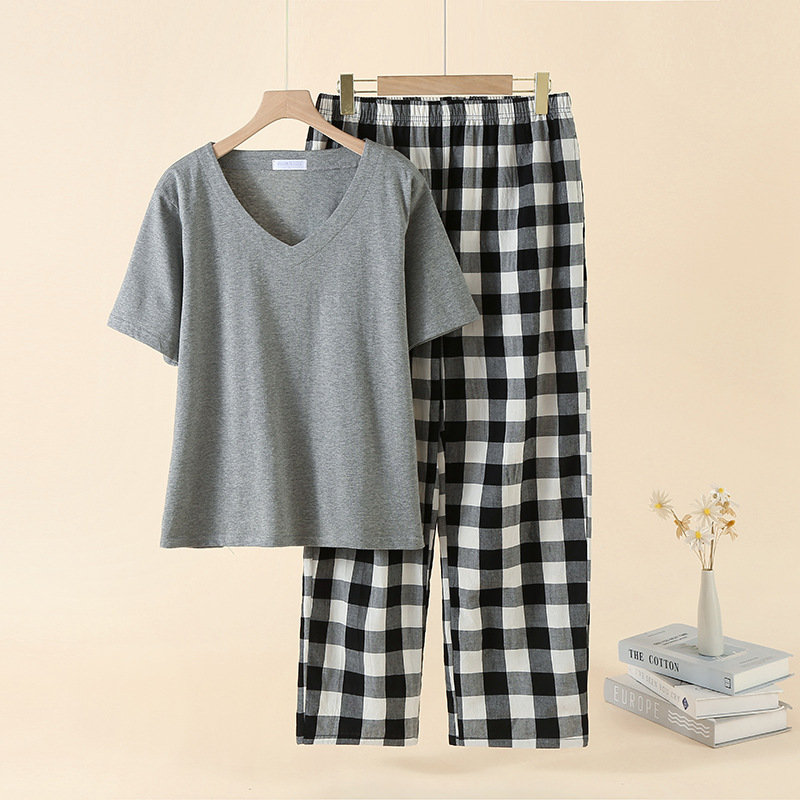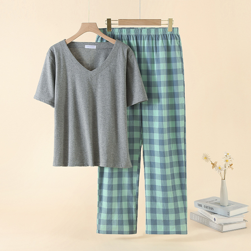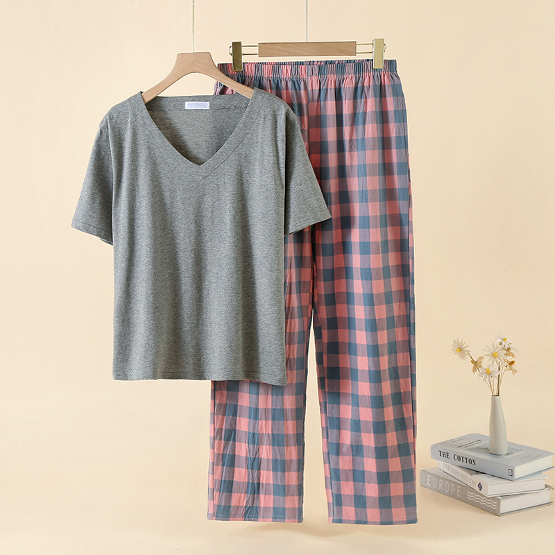 女款针织精梳棉 V领短袖T恤衫上衣+绉纹水洗棉格子长裤休闲家居套装