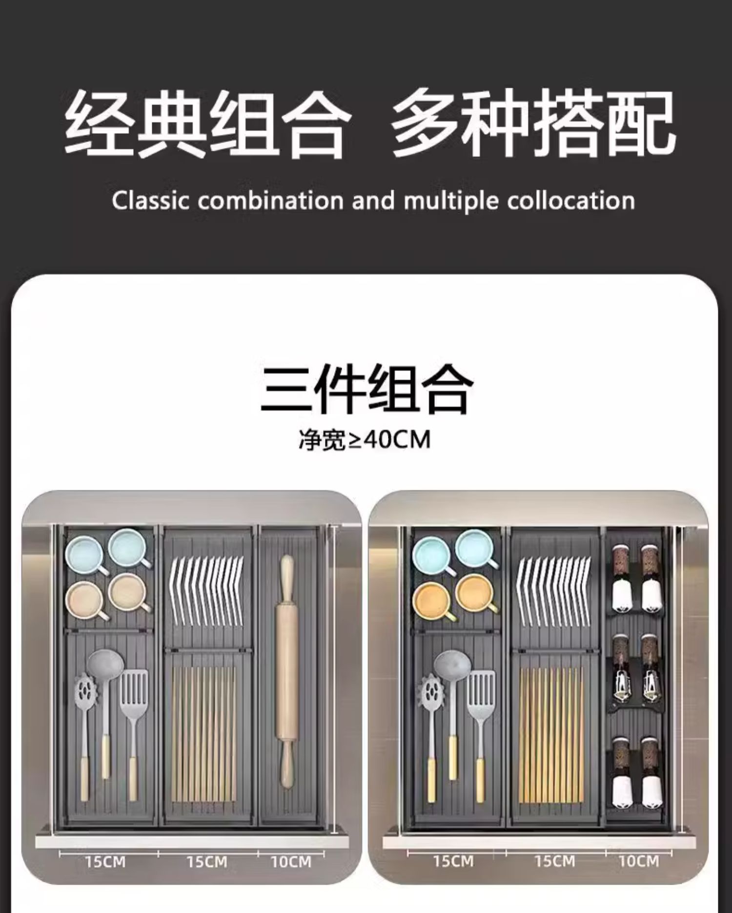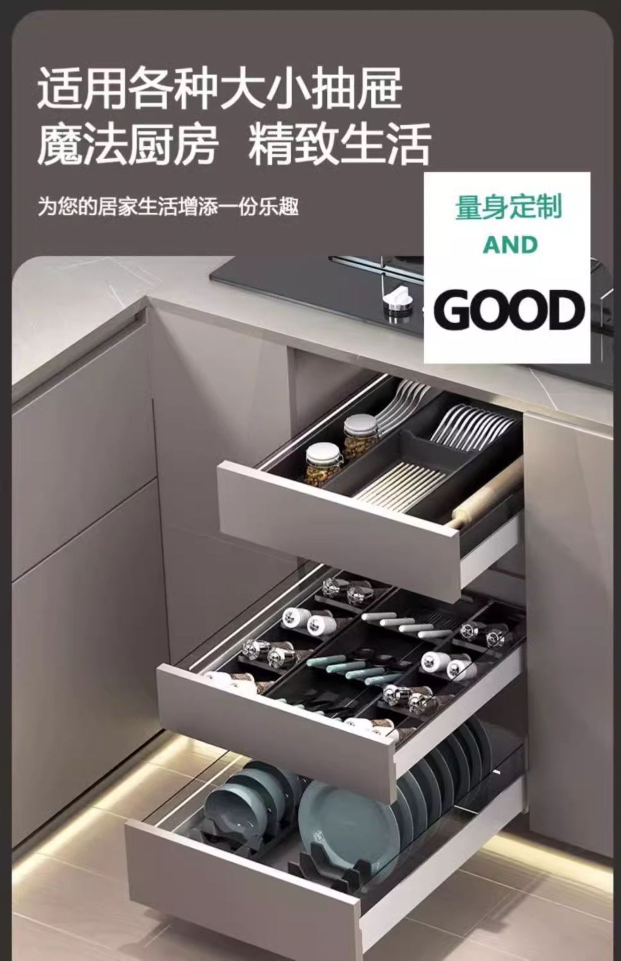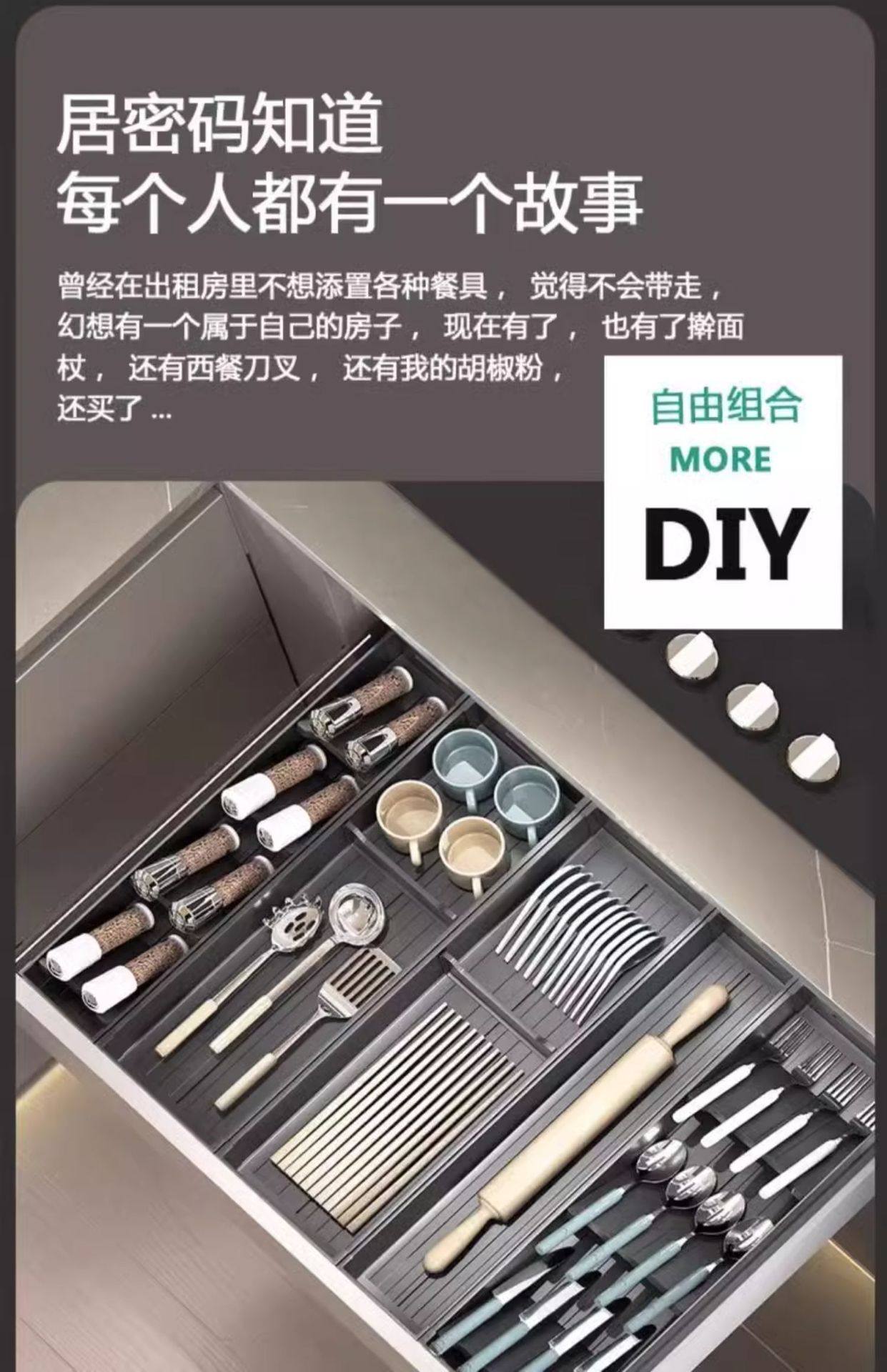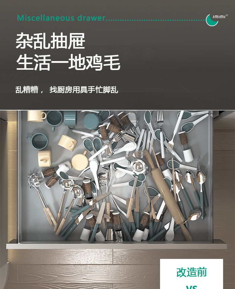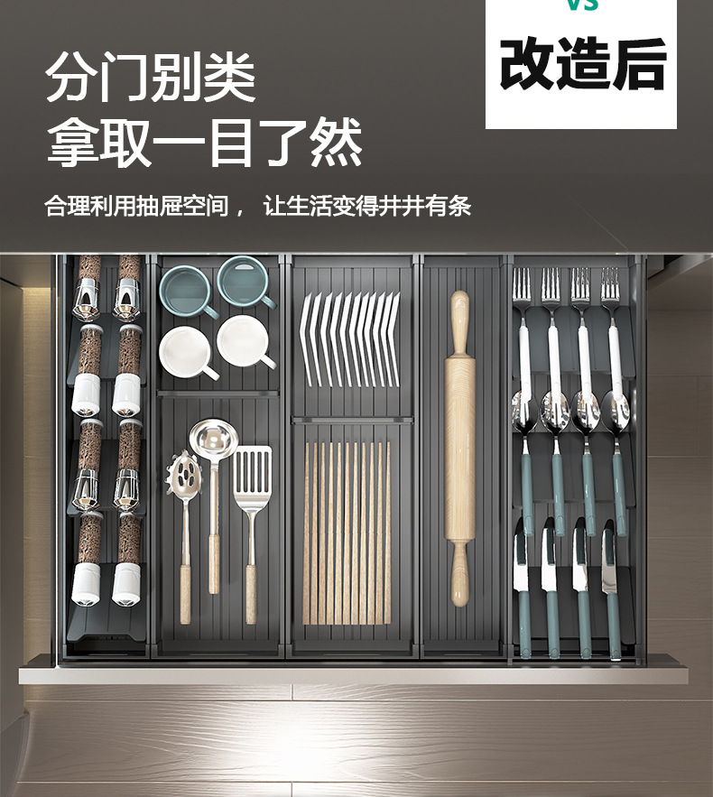 주방 서랍 수납 분리형 캐비닛 내장형 칼, 포크, 식기, 그릇, 젓가락, 숟가락 다용도 공간 알루미늄