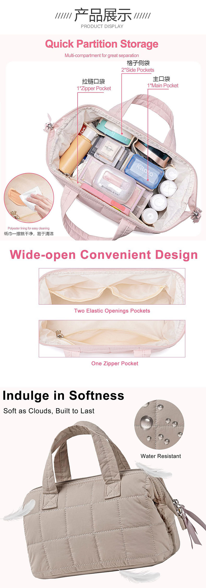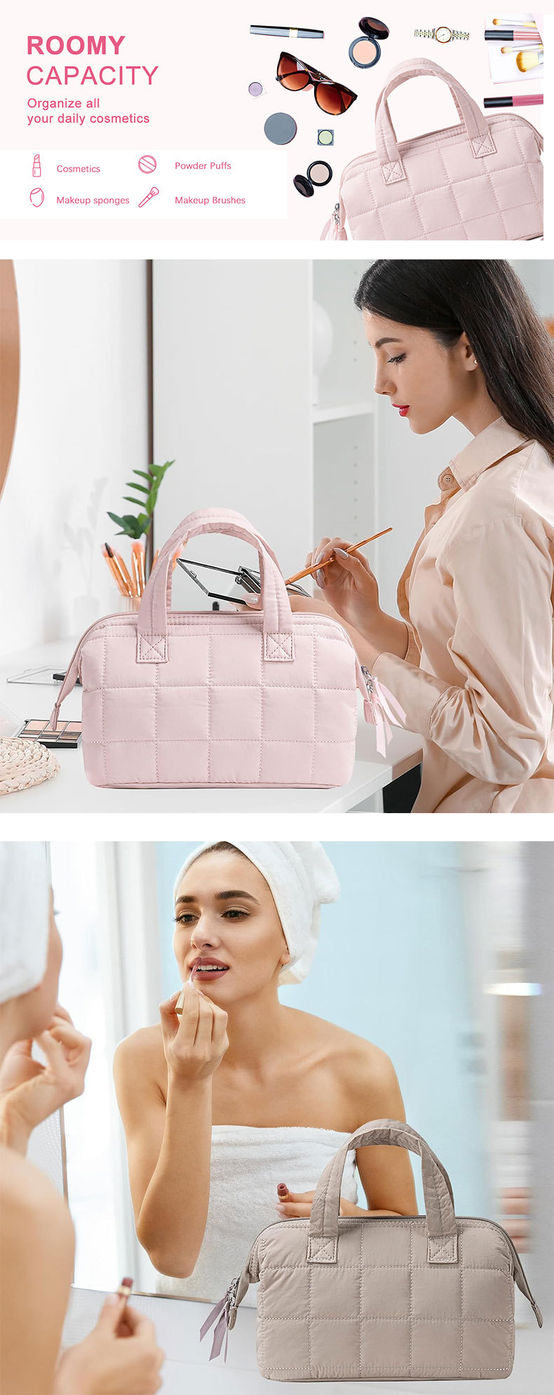 맞춤형 Amazon 퀼트 수납 화장품 가방, 여행용 휴대용 세면도구 가방, 대형 수납 가방, 대형 오프닝