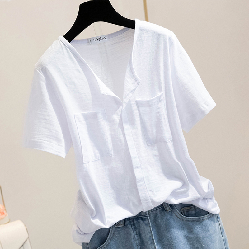 슬럽 코튼 반팔 티셔츠 여성용 루즈 플러스 사이즈 캐주얼 포켓 반소매 솔리드 컬러 웨스턴 스타일 탑베이스