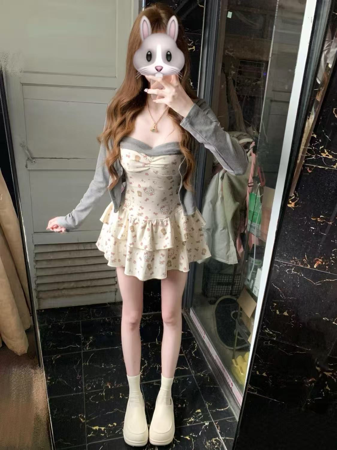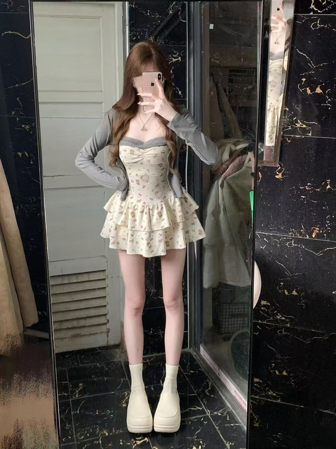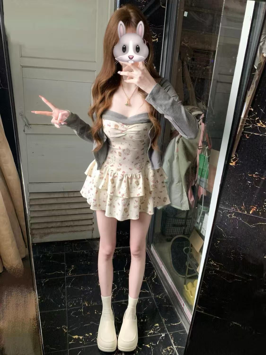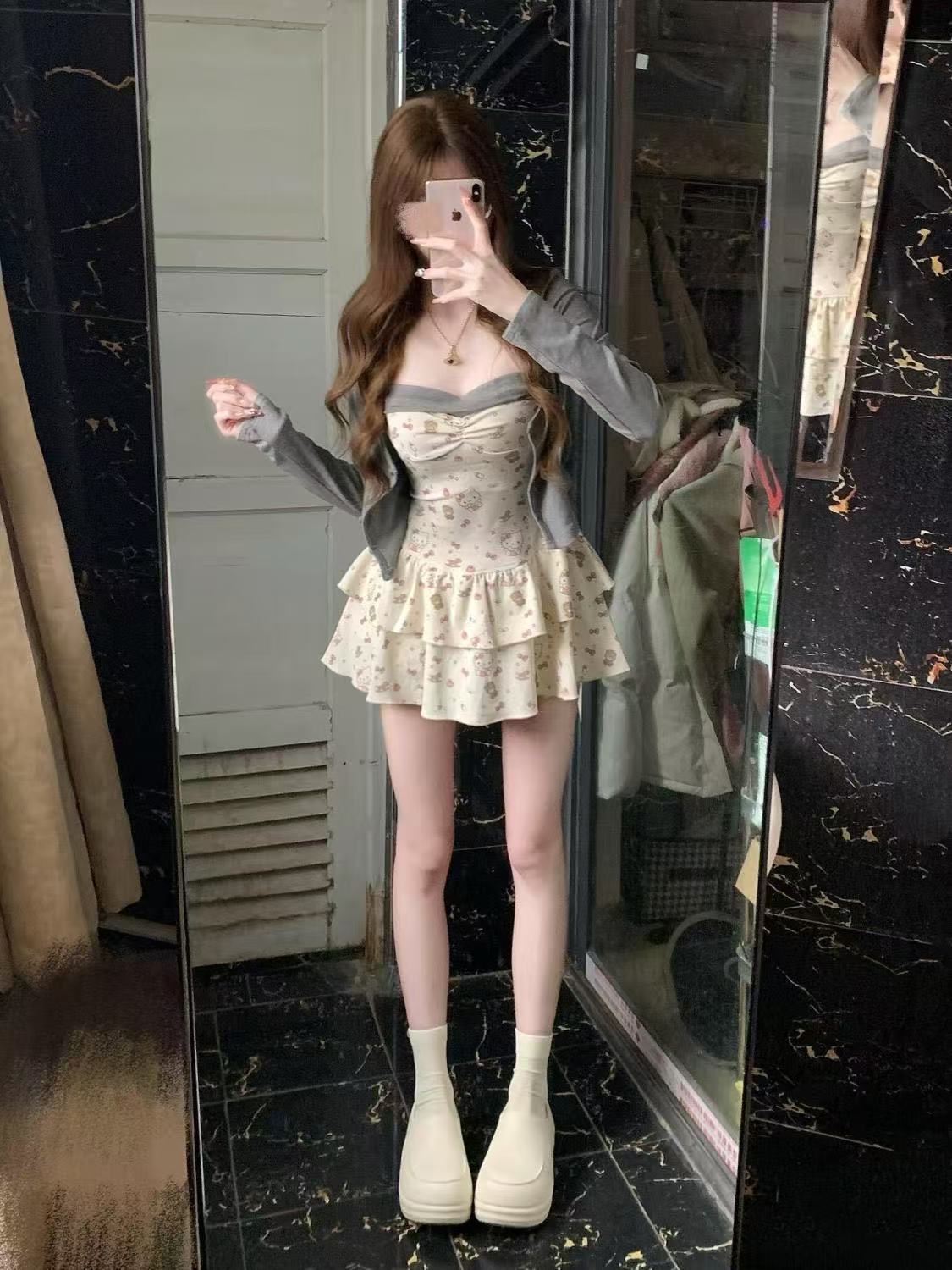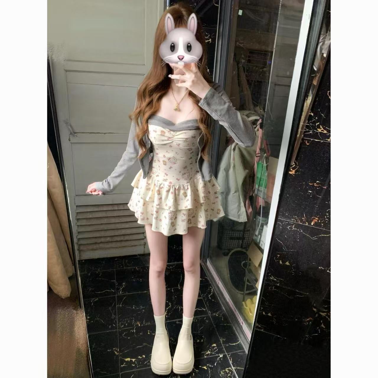 새로운 봄과 여름 카디건 달콤하고 매운 꽃 슬림 핏 투피스 세트 슬리밍 젠틀 우아한 순수한 욕망 세트 슬링 원피스스토어 가기