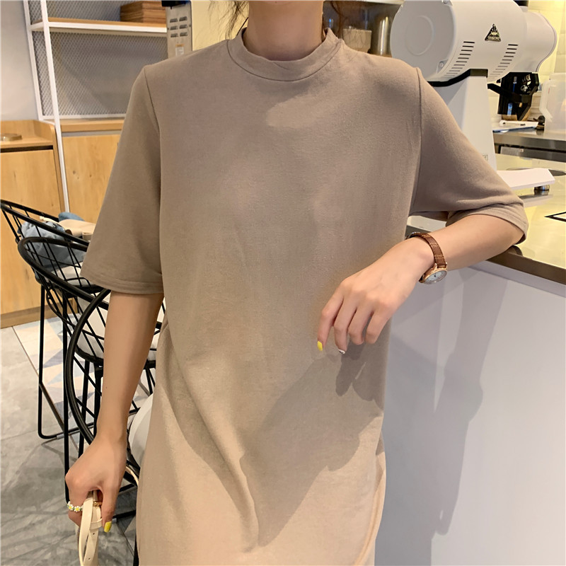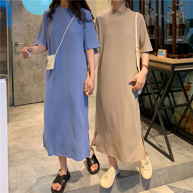 긴 분할 슬림 핏 원피스 2025 새로운 여름 한국 스타일 오버 무릎 솔리드 컬러 캐주얼 반팔 여성용 홈 잠옷