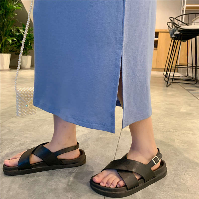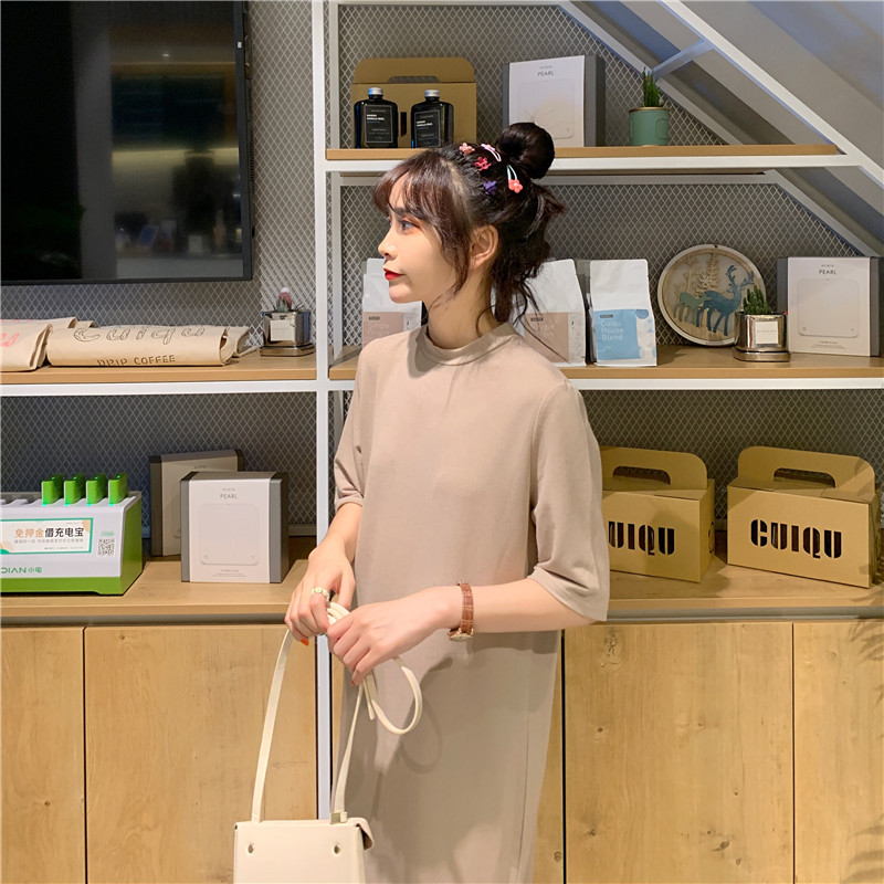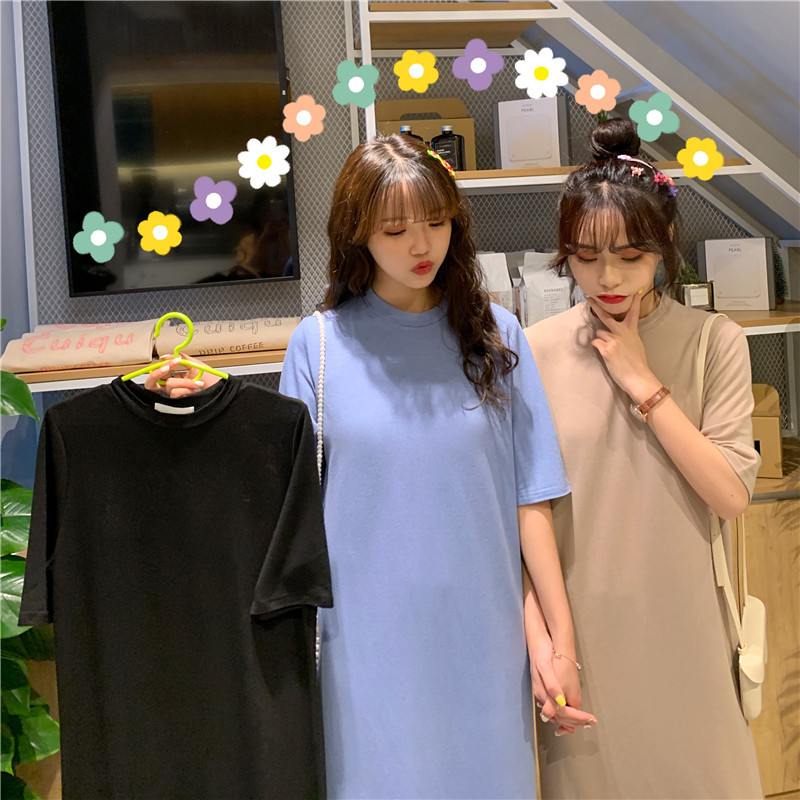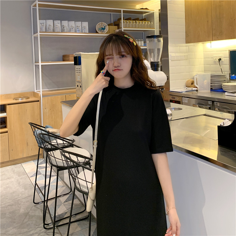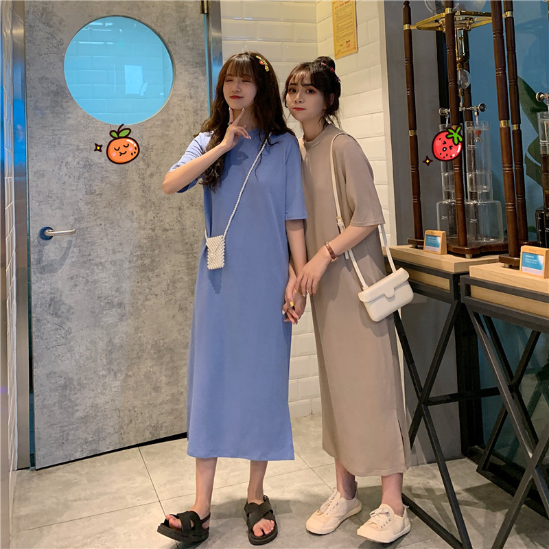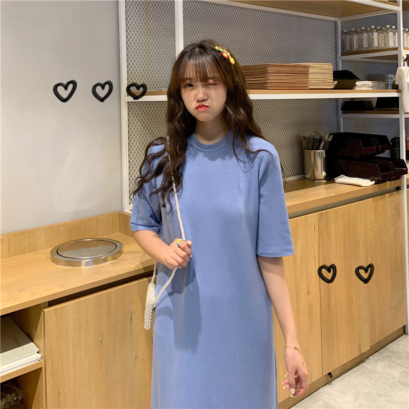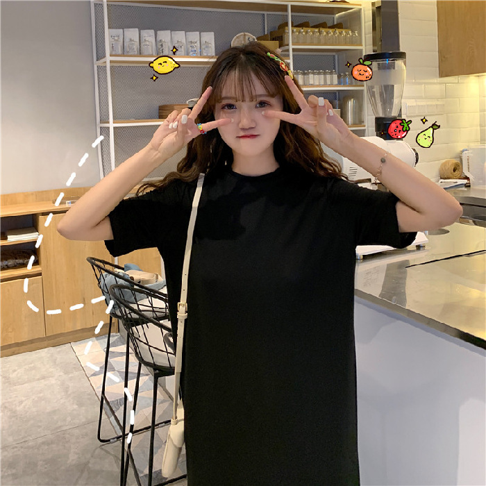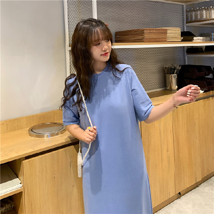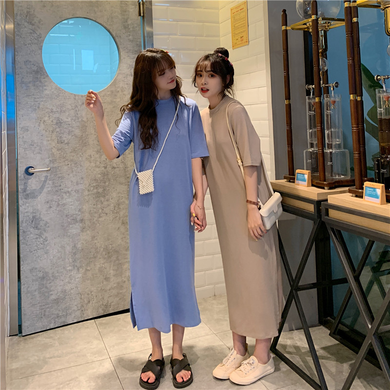 긴 분할 슬림 핏 원피스 2025 새로운 여름 한국 스타일 오버 무릎 솔리드 컬러 캐주얼 반팔 여성용 홈 잠옷스토어 가기