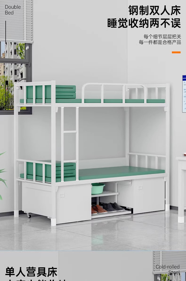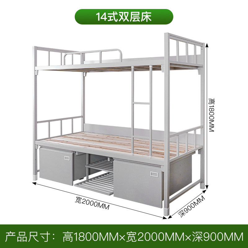 14형 침대, 캠프용 침구, 이층침대, 철제 프레임 침대, 직원 기숙사, 상단 침대, 하단 책상, 내부 수납장, 학습 테이블, 기숙사 침대