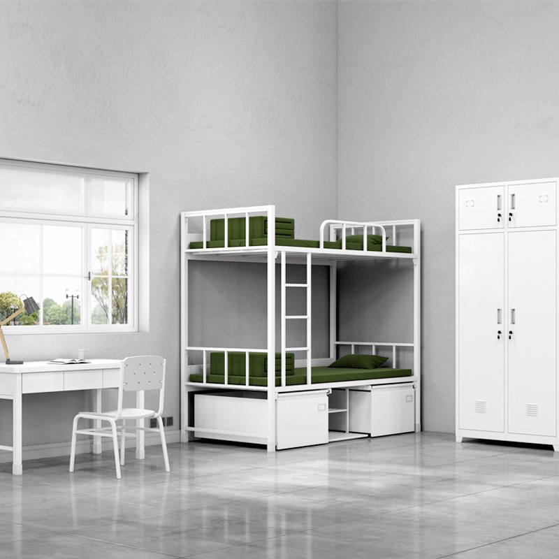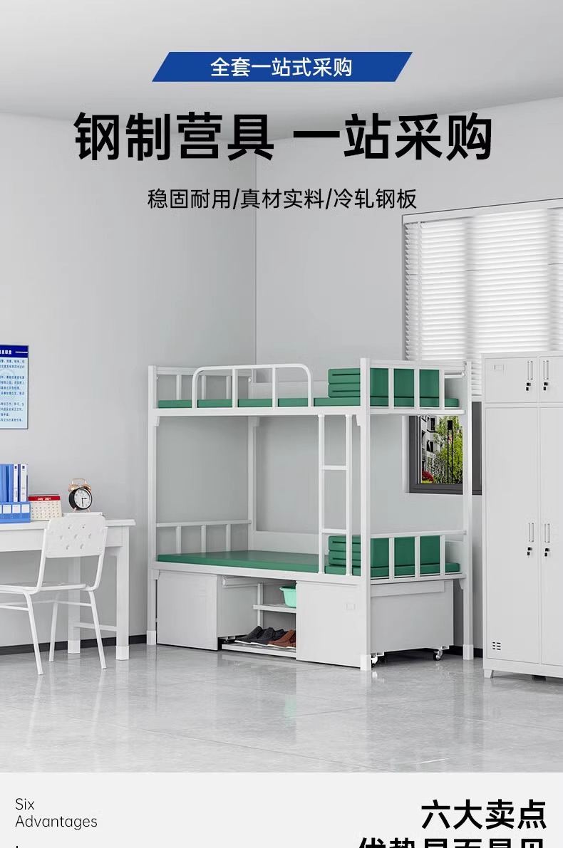 14형 침대, 캠프용 침구, 이층침대, 철제 프레임 침대, 직원 기숙사, 상단 침대, 하단 책상, 내부 수납장, 학습 테이블, 기숙사 침대스토어 가기