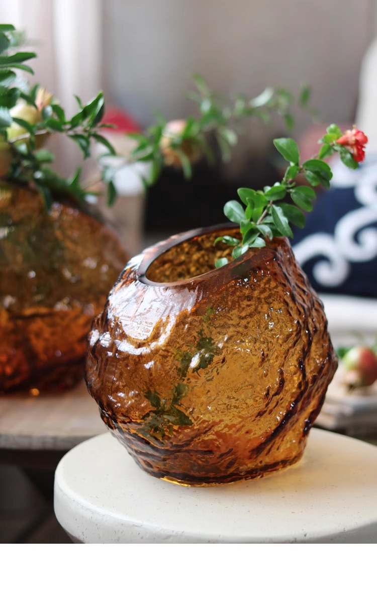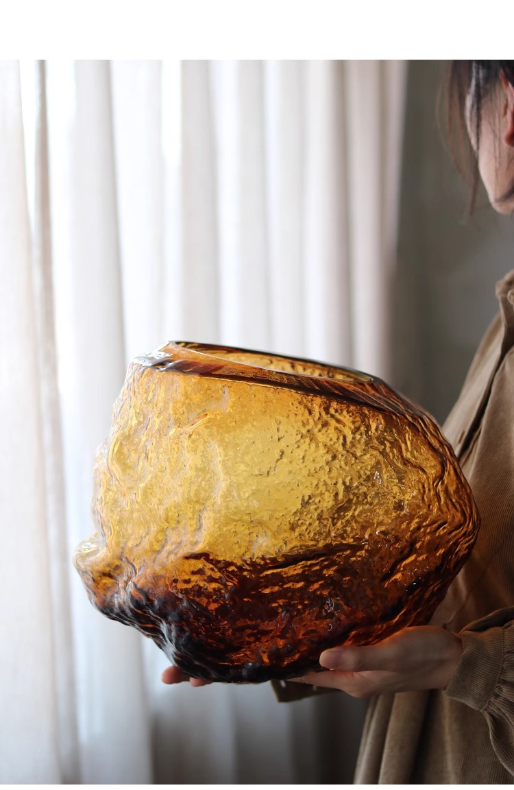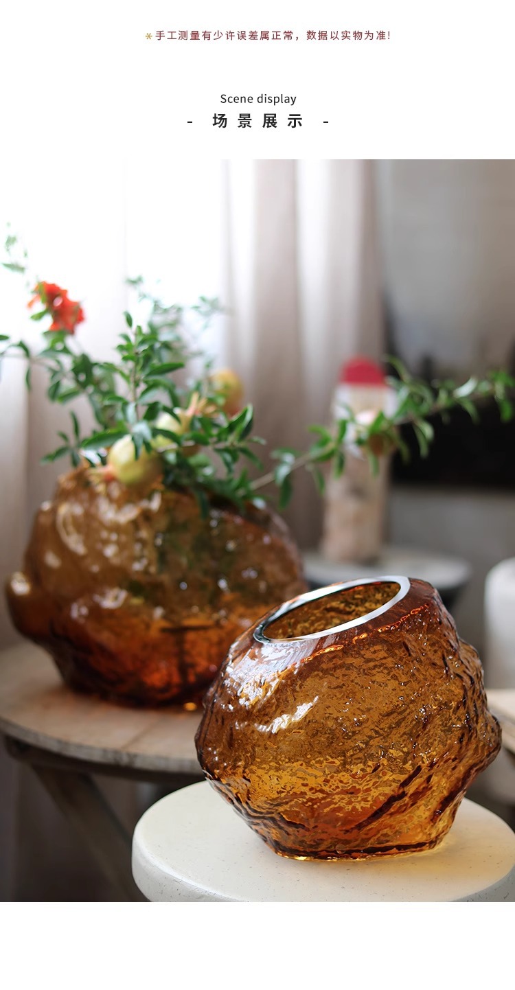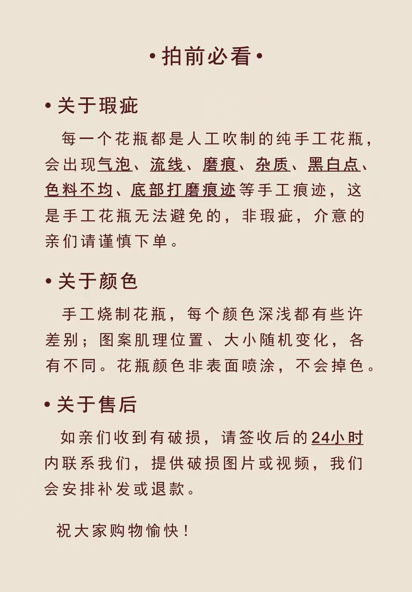 每一个花瓶都是人工吹制的纯手工花瓶会出现气泡、流线、磨痕、杂质、黑白点:色料不均、底部打磨痕迹等手工痕迹,这是手工花瓶无法避免的,非瑕疵,介意的亲们请谨慎下单。