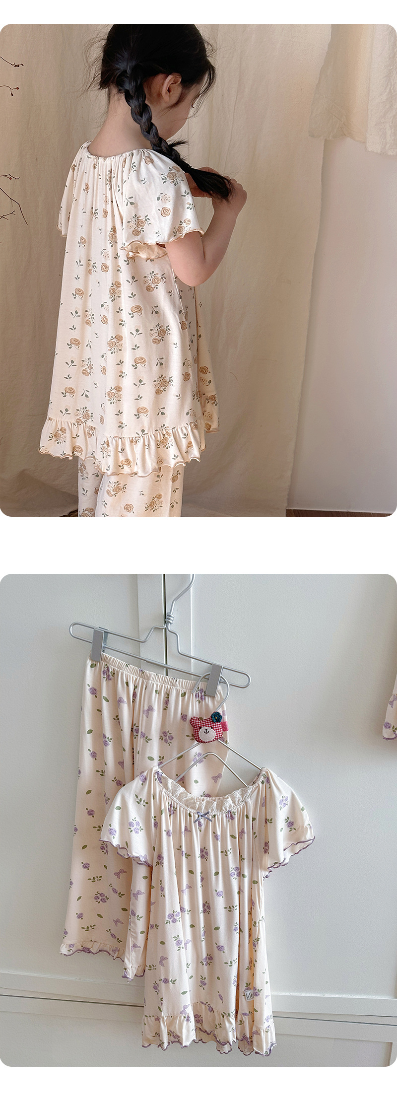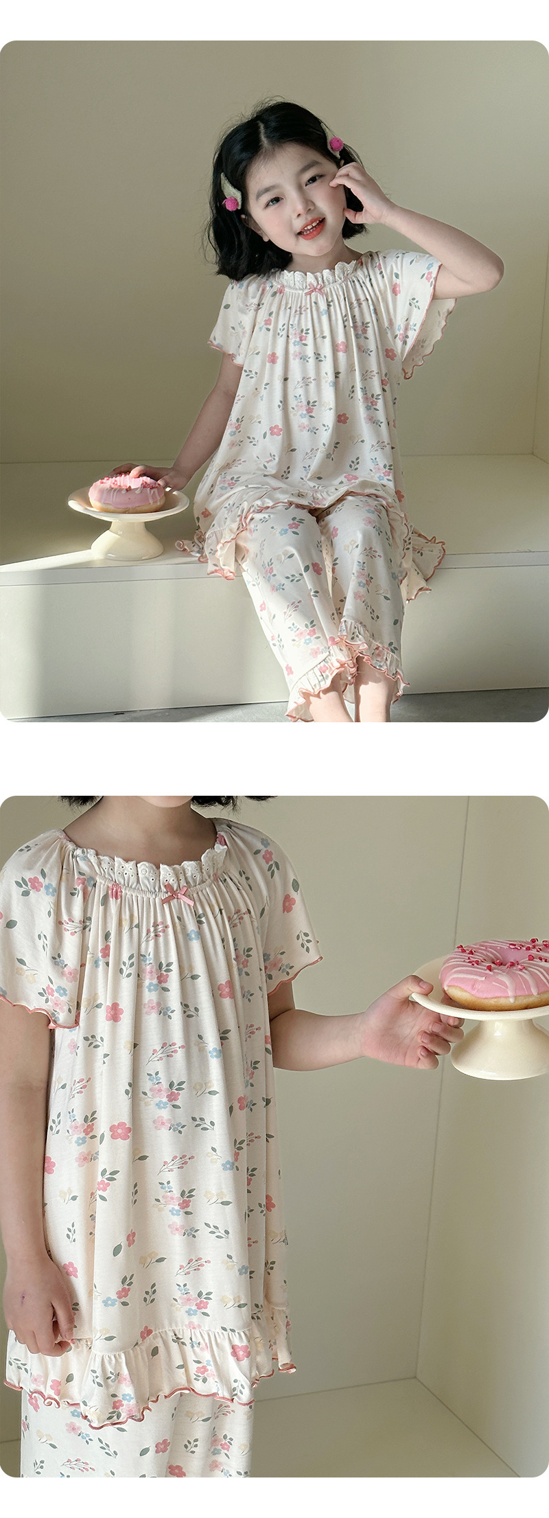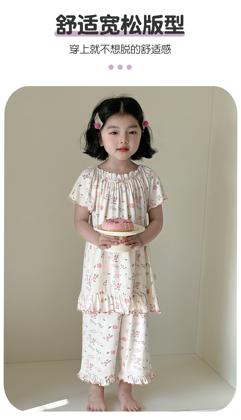 빵 토끼 2025 여름 새 소녀 잠옷 세트 아기 꽃 귀여운 짧은 소매 레이스 홈 옷 세트스토어 가기