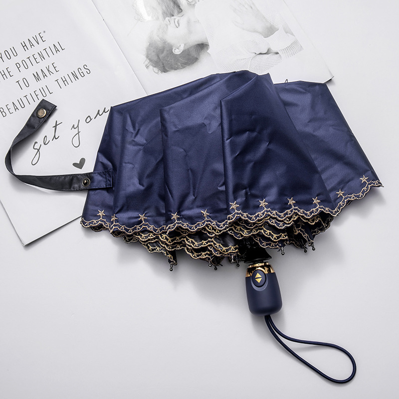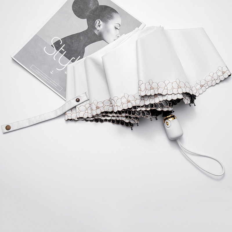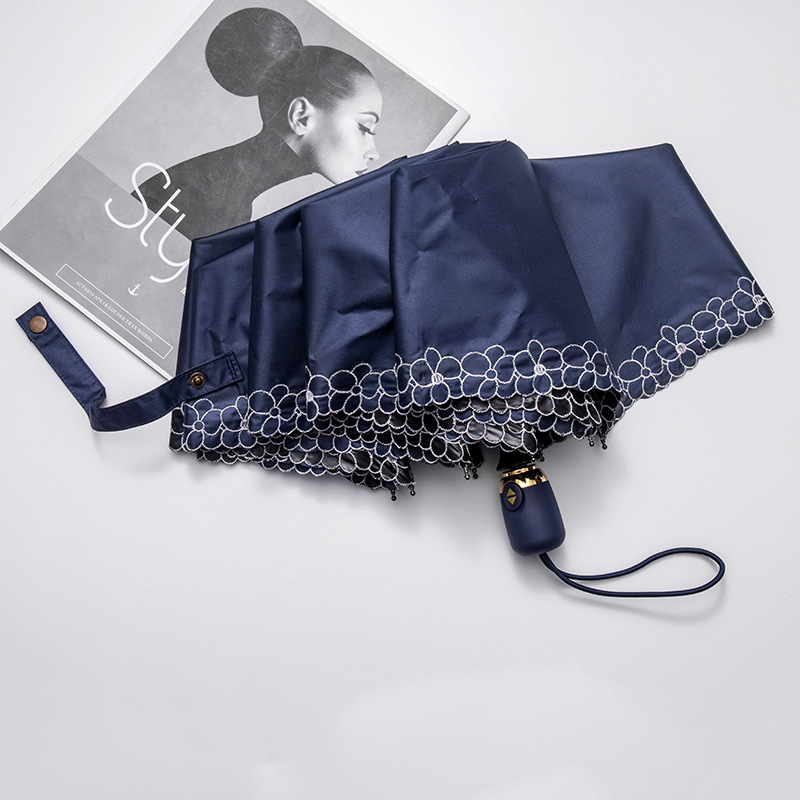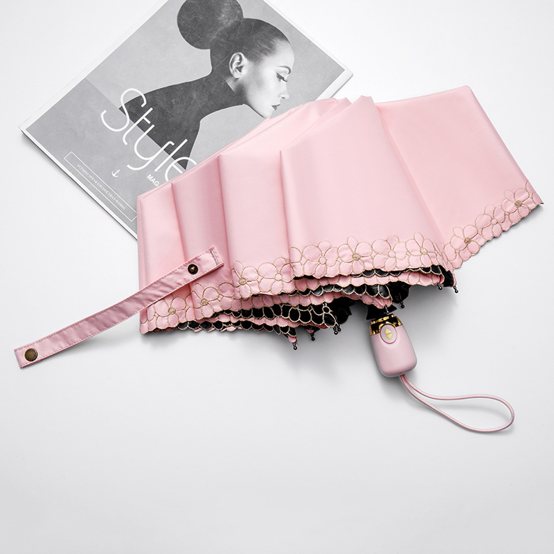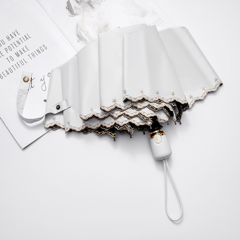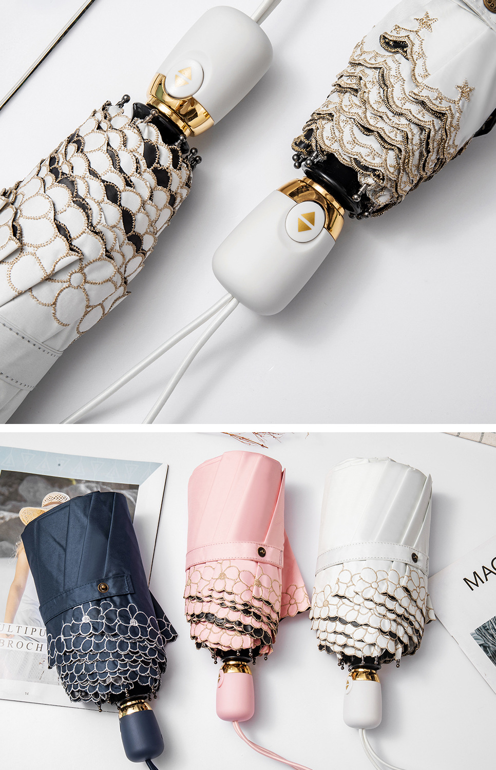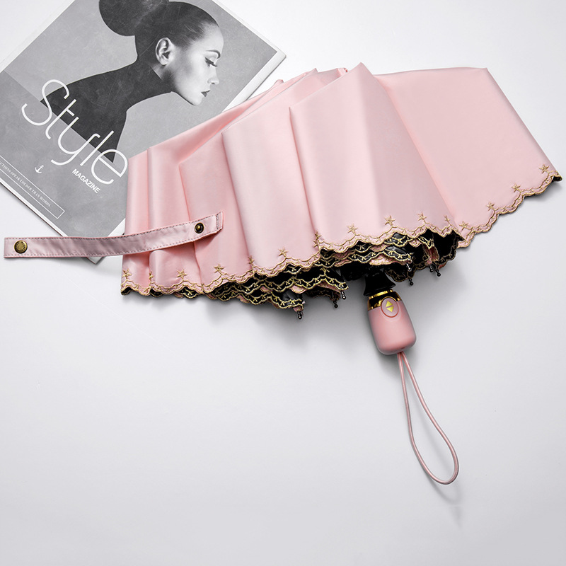 태양 우산 선 스크린 UV 보호 자동 원 버튼 열기 접는 이중 사용 우산 여성의 자수 햇빛 우산