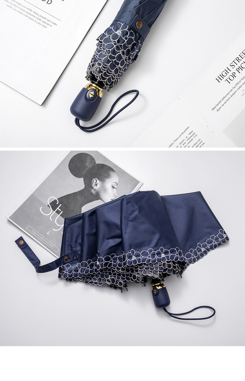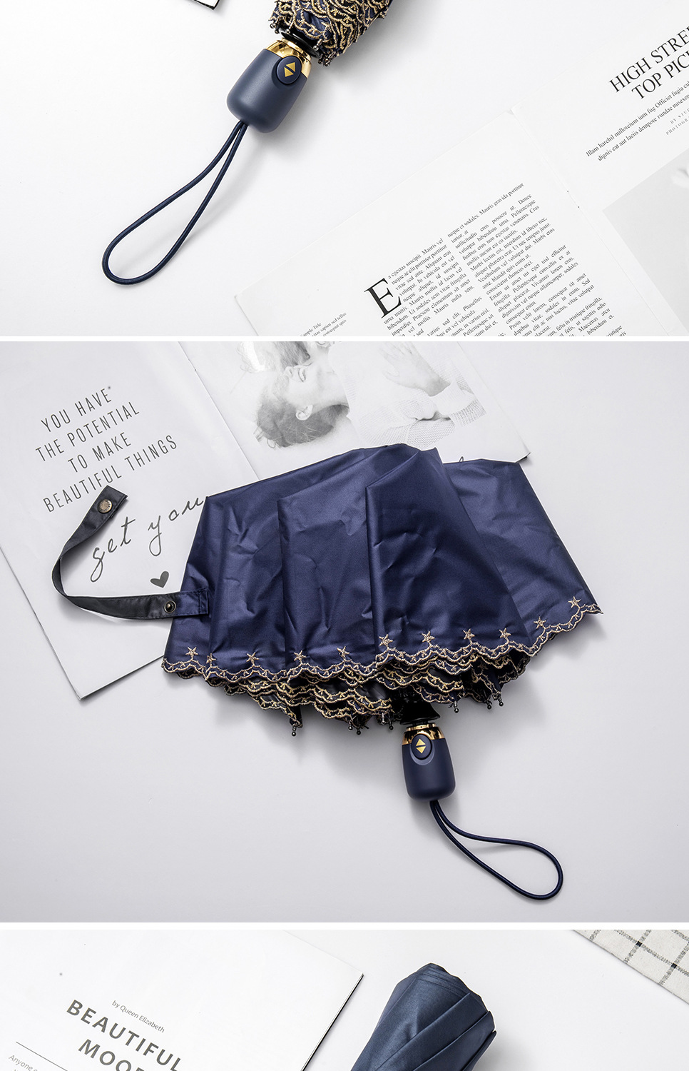 태양 우산 선 스크린 UV 보호 자동 원 버튼 열기 접는 이중 사용 우산 여성의 자수 햇빛 우산스토어 가기