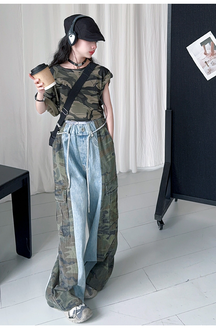 여아용 2025 봄 여름 작업복 바지 아메리칸 캐주얼 데님 스플라이싱 스트리트 댄스 스타일 기능성 와이드 레그 스포츠 롱 팬츠