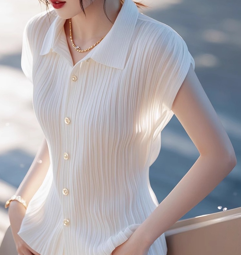 프랑스 스타일 우아한 슈퍼 잘 생긴 화이트 라펠 반팔 셔츠 여성의 여름 세련된 슈퍼 잘 생긴 우아한 얇은 탑스토어 가기