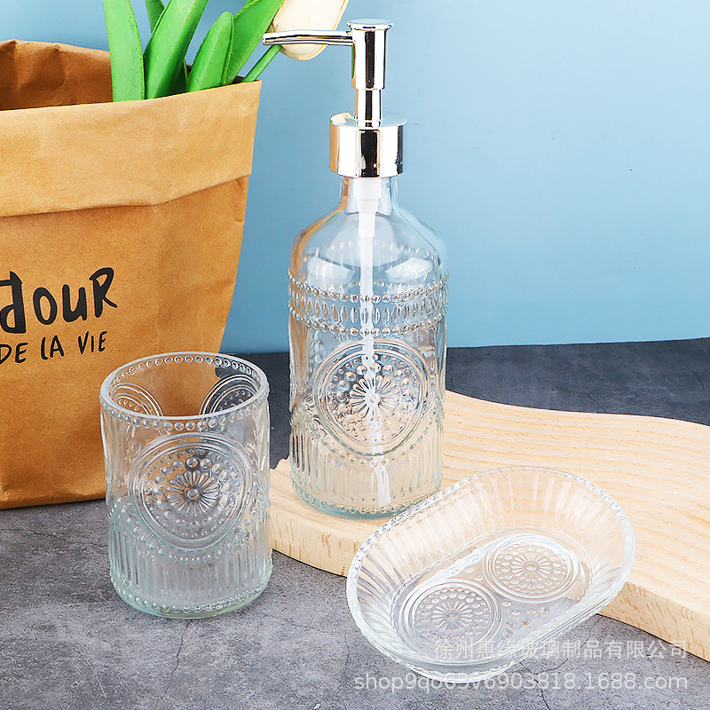 맞춤형 유리 치과 컵 비누 접시 세트 호텔 프레스 라운드 손 소독제 비누 디스펜서 병 빈 병