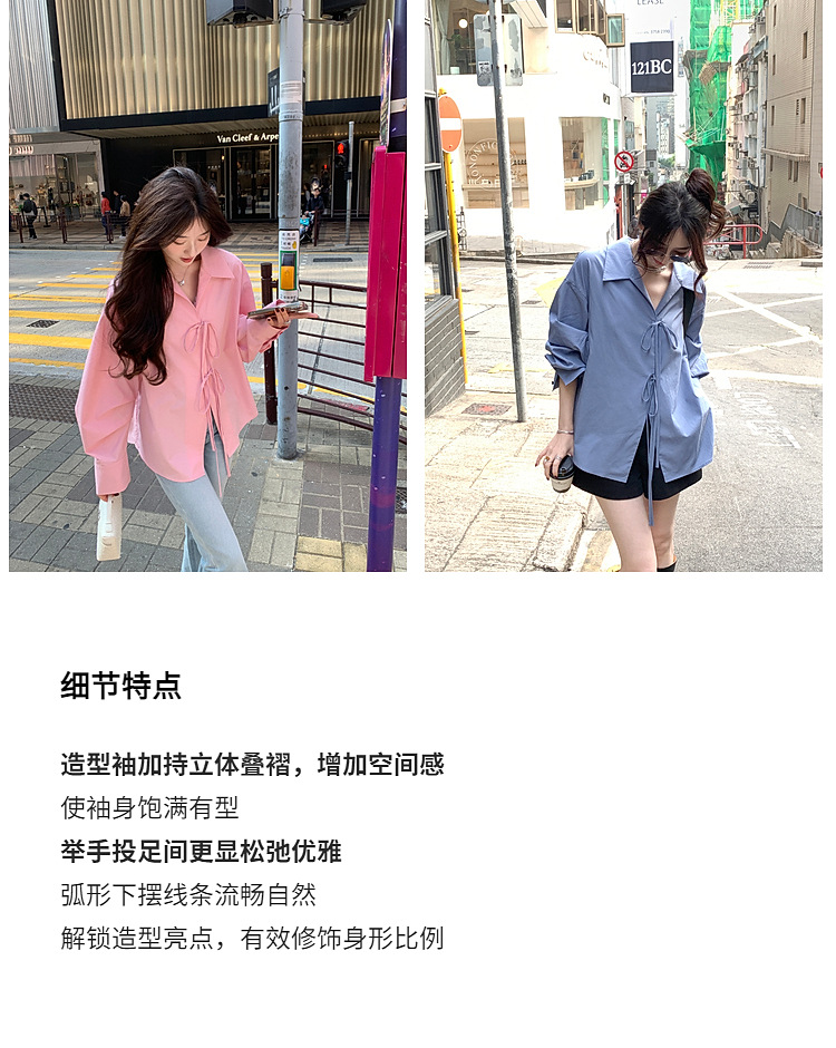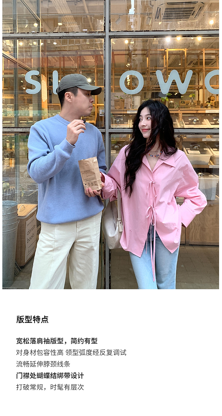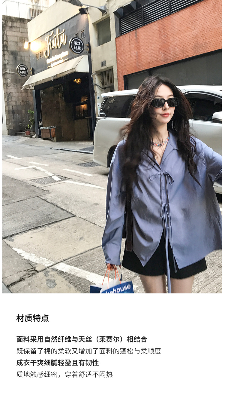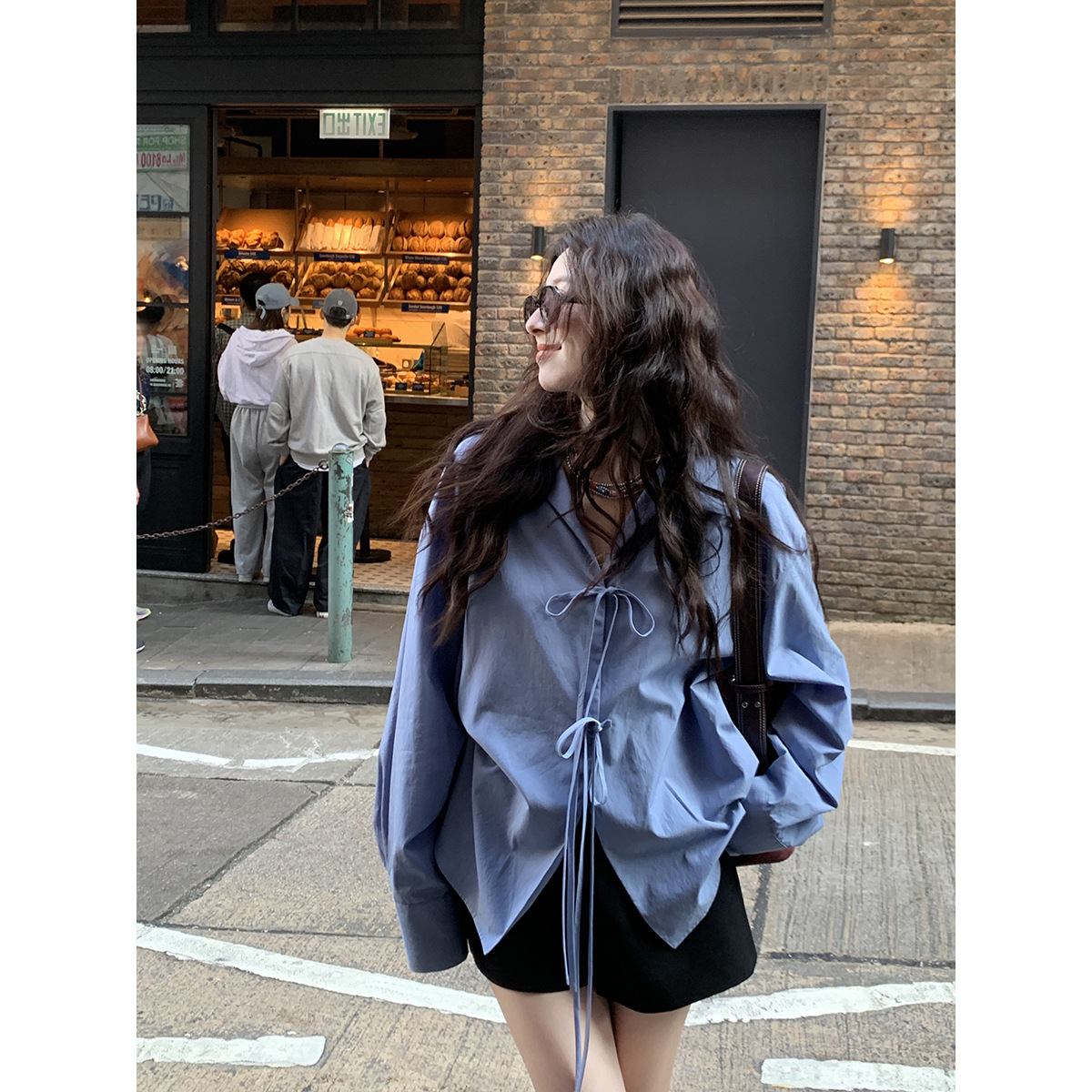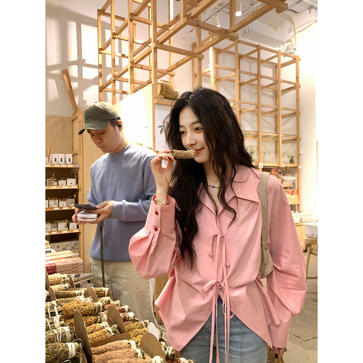 텐셀 라이셀 코튼 디자인 라펠 리본 레이스업 셔츠 여성 프렌치 레트로 탑 봄 긴팔스토어 가기