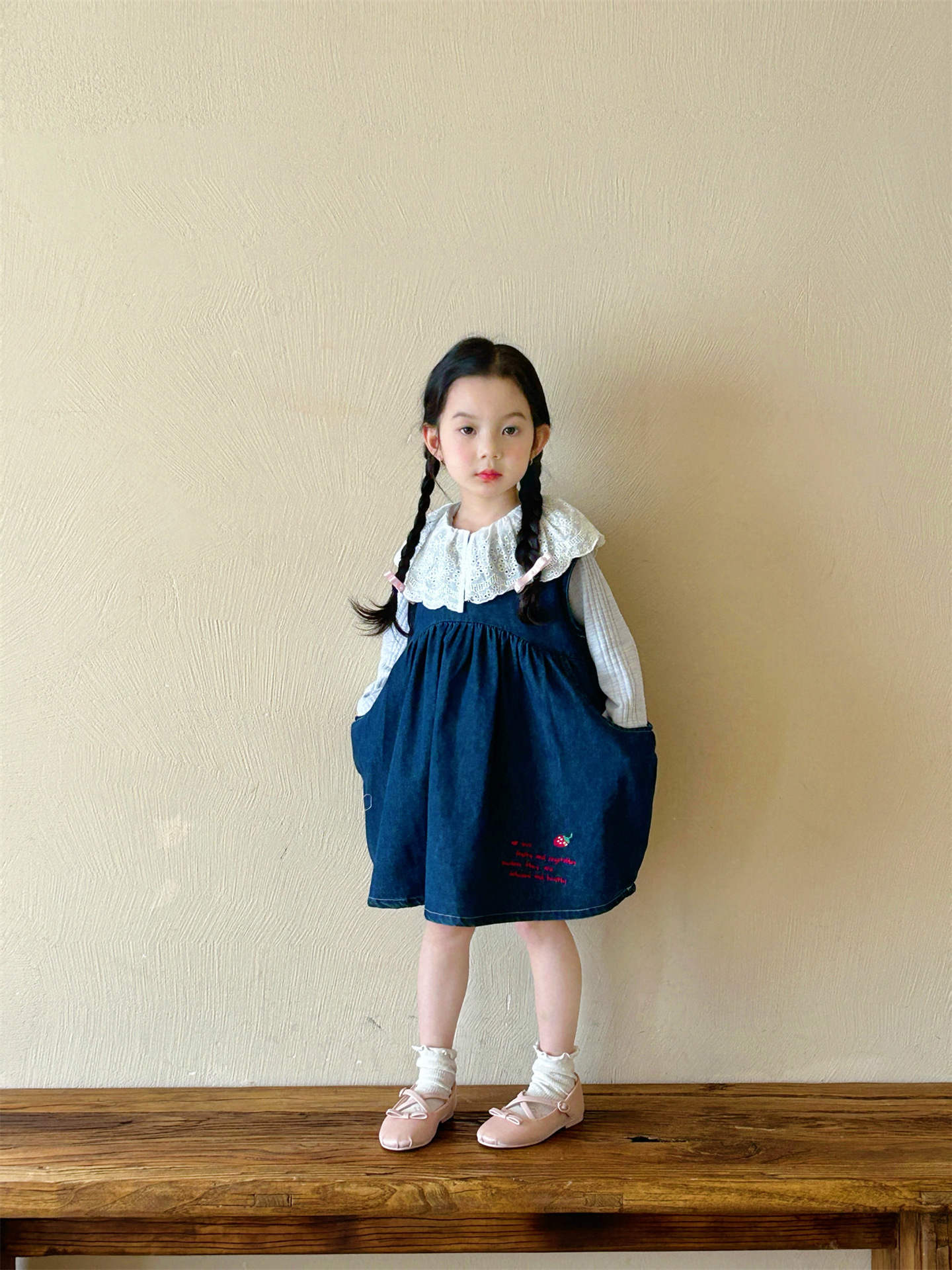 2025 새로운 가을 스타일 여자 스타일 대형 옷깃 레이스 바닥 셔츠 + 딸기 데님 조끼 스커트 투피스 세트스토어 가기