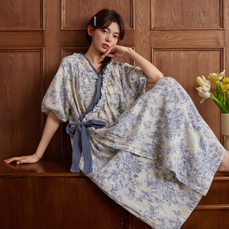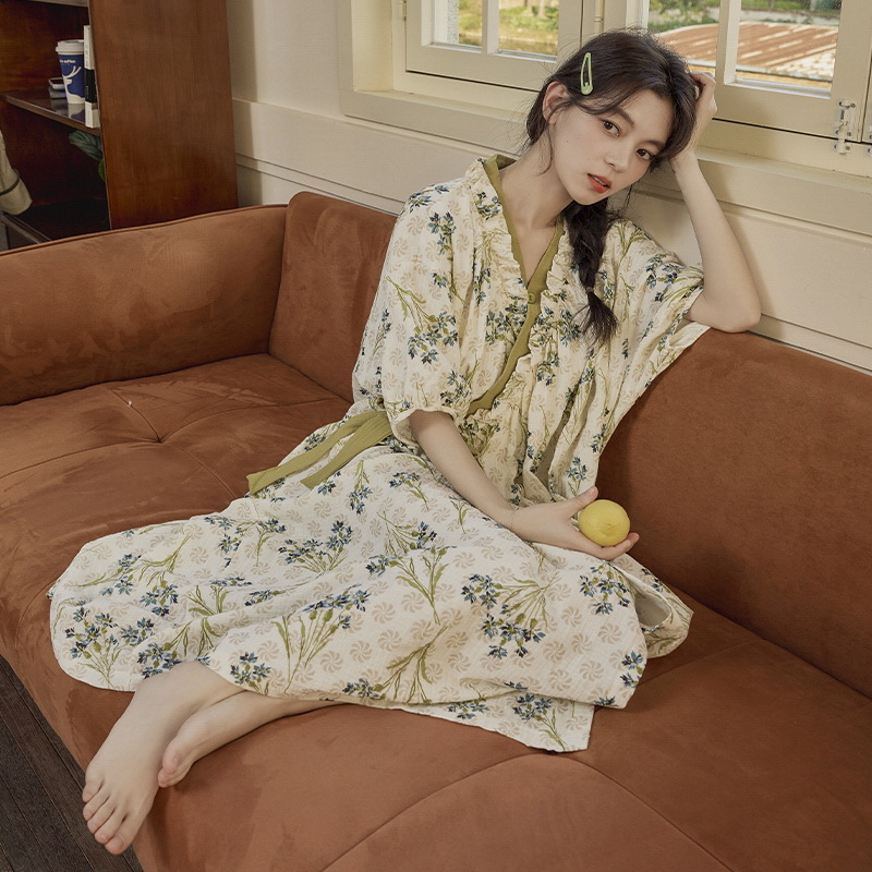 클라우드 코튼 레이스 업 나이트 가운 여성의 여름 달콤한 반팔 나이트 가운 얇은 기모노 긴 파자마, 가슴 패드 홈 옷스토어 가기