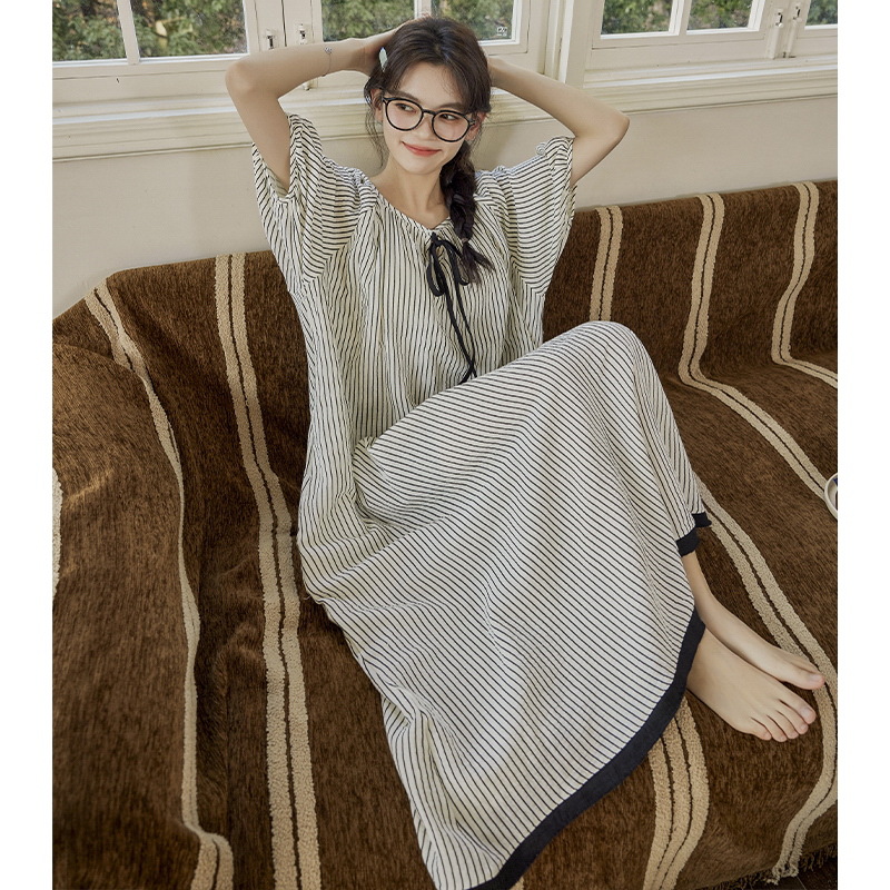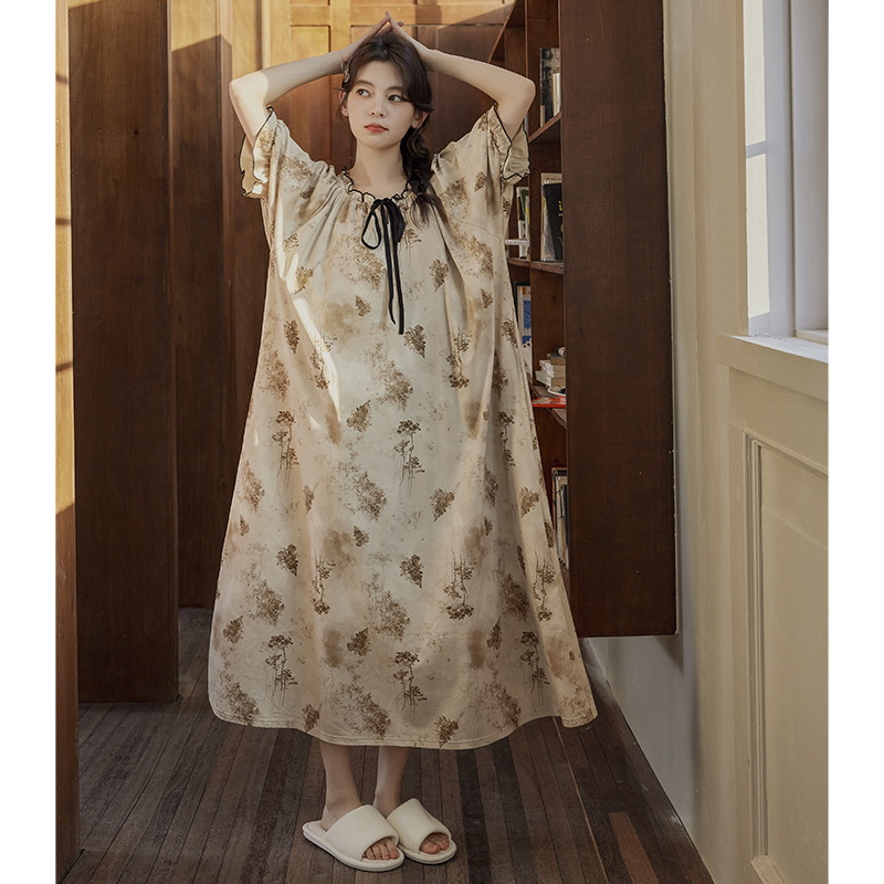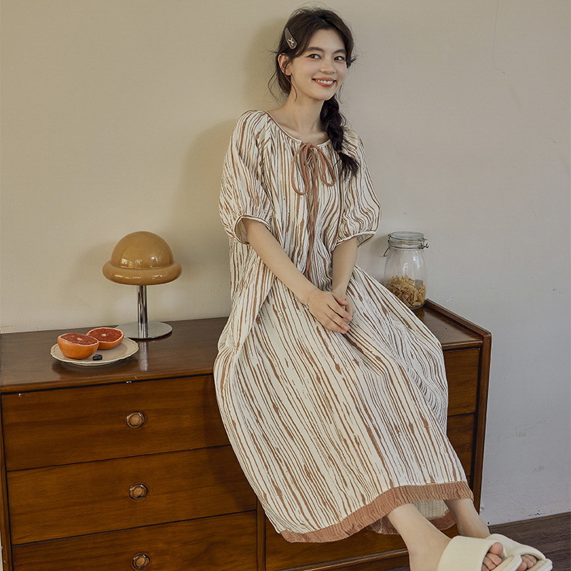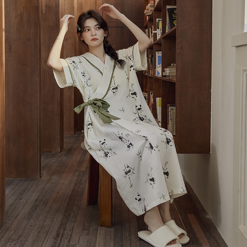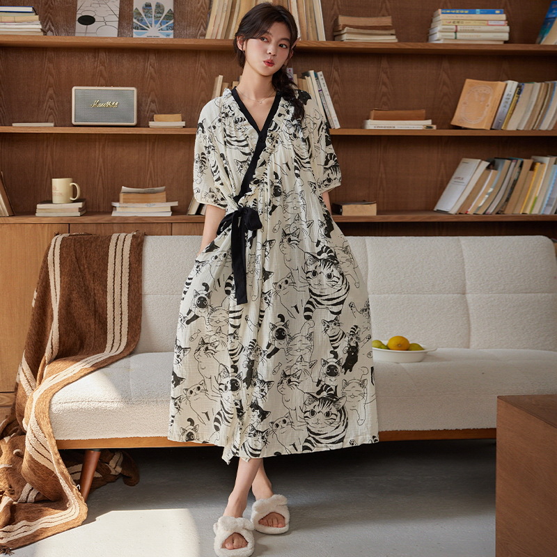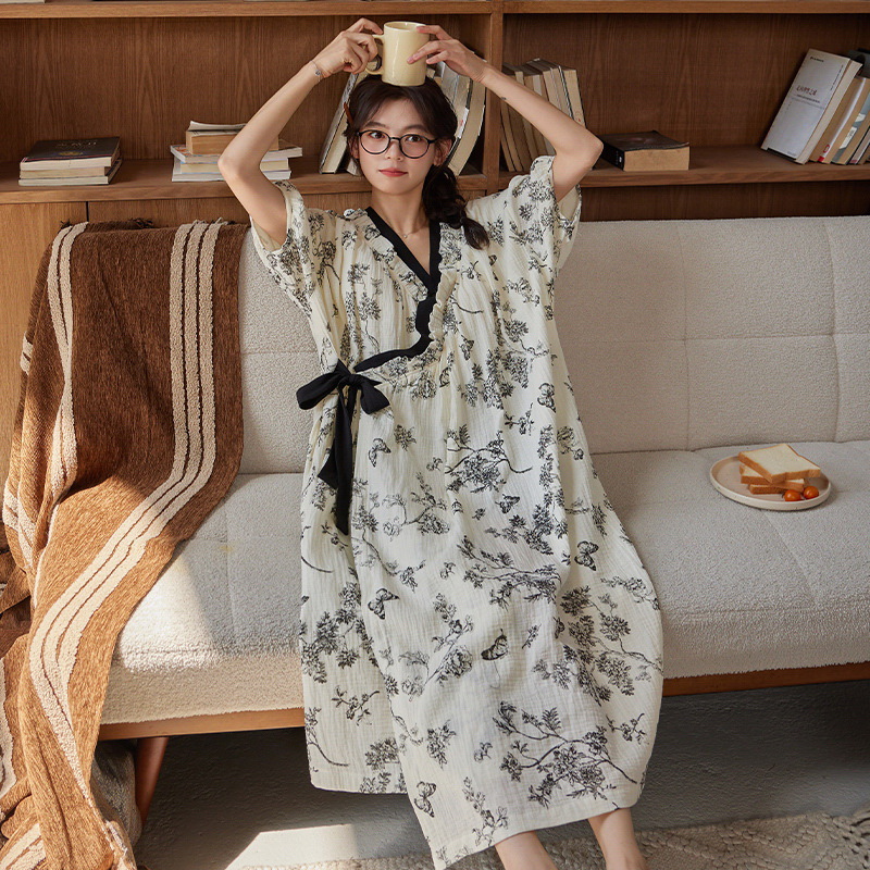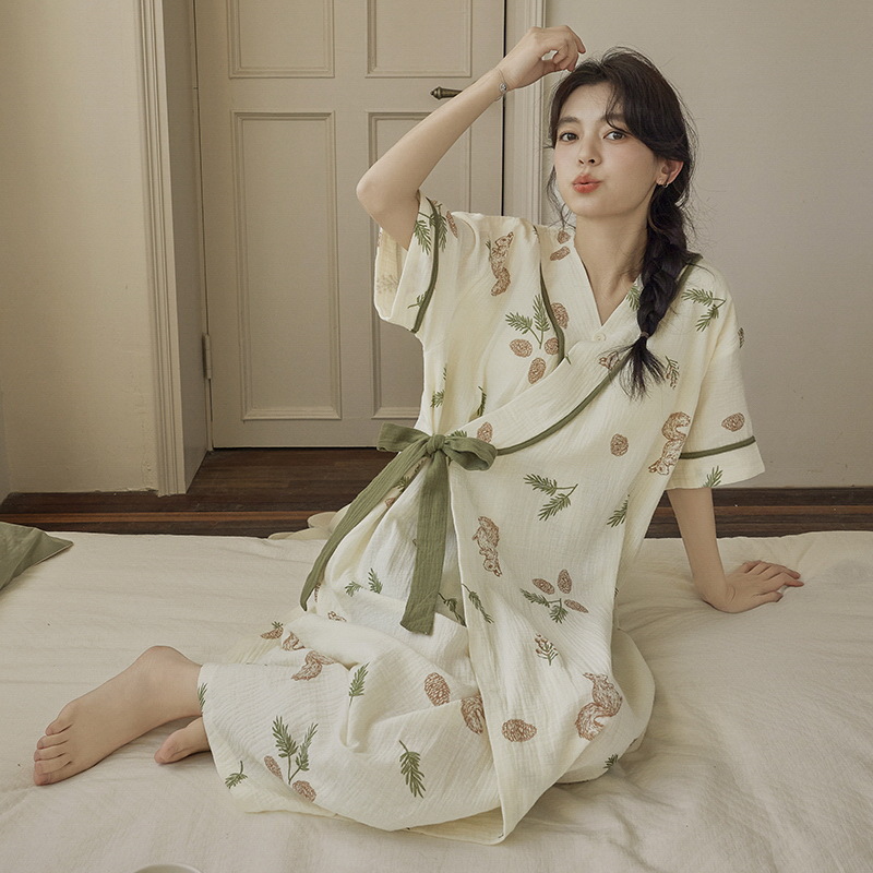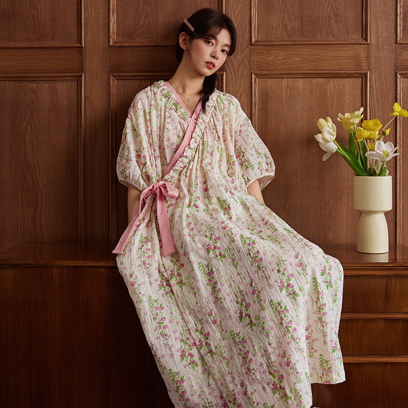 클라우드 코튼 레이스 업 나이트 가운 여성의 여름 달콤한 반팔 나이트 가운 얇은 기모노 긴 파자마, 가슴 패드 홈 옷