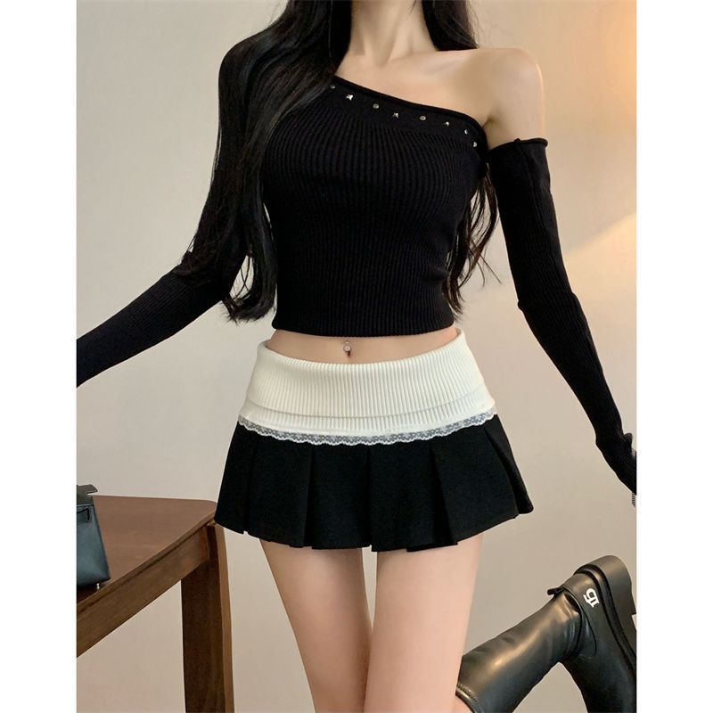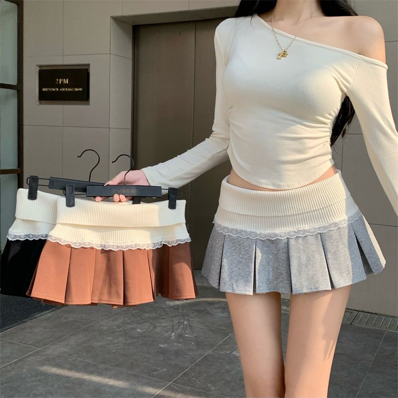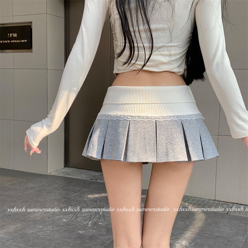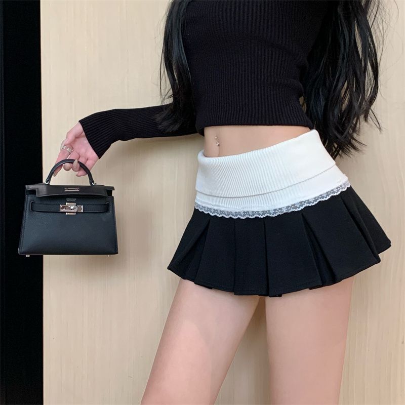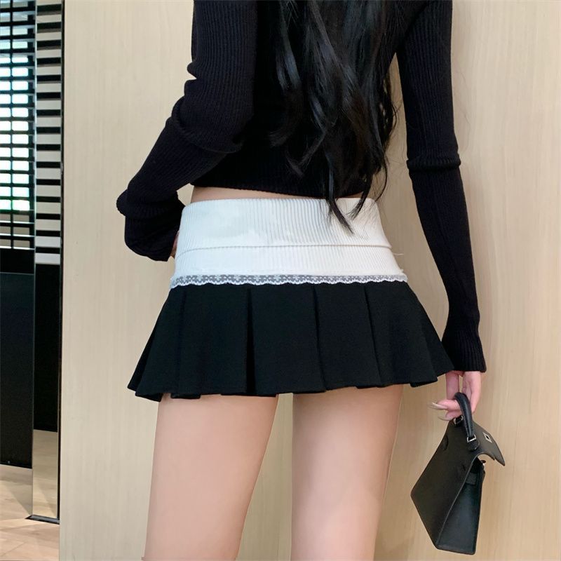 줄이없는 주름 치마 새 2025 여름 달콤한 매운 레이스 가장자리 대비 컬러 스티칭 높은 허리 A-라인 섹시한 짧은 치마