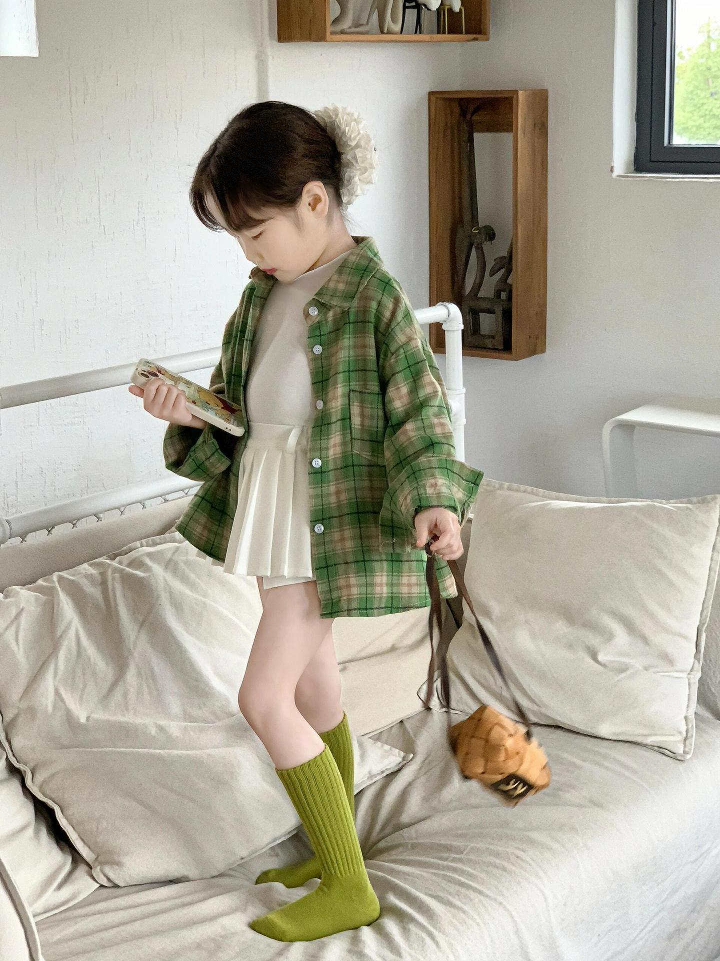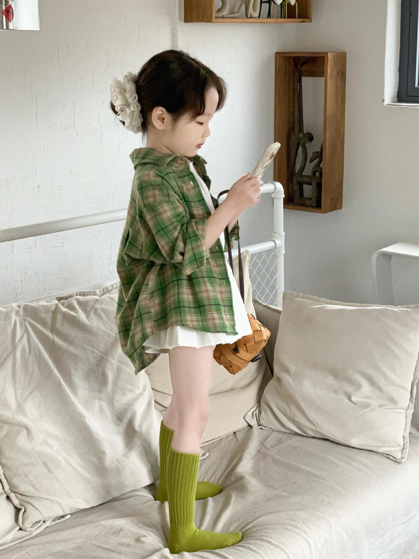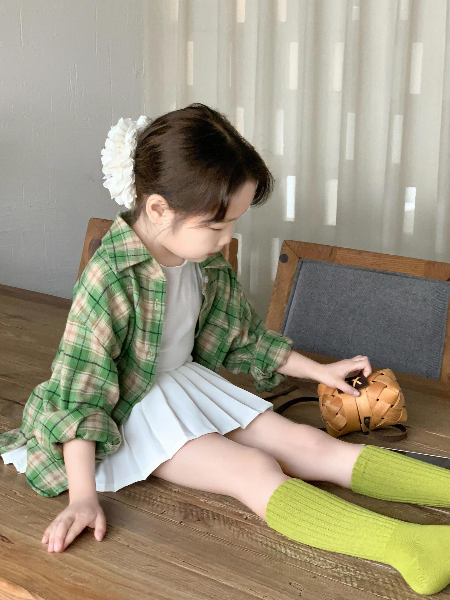 소녀 2025 봄 새로운 한국 스타일 소녀 미디 그린 격자 무늬 긴 소매 셔츠 세련된 주름 치마스토어 가기
