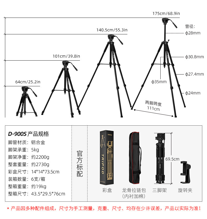 • 1.75m 사진 카메라 삼각대 - 튜브 직경 31MM, 내하중 6KG