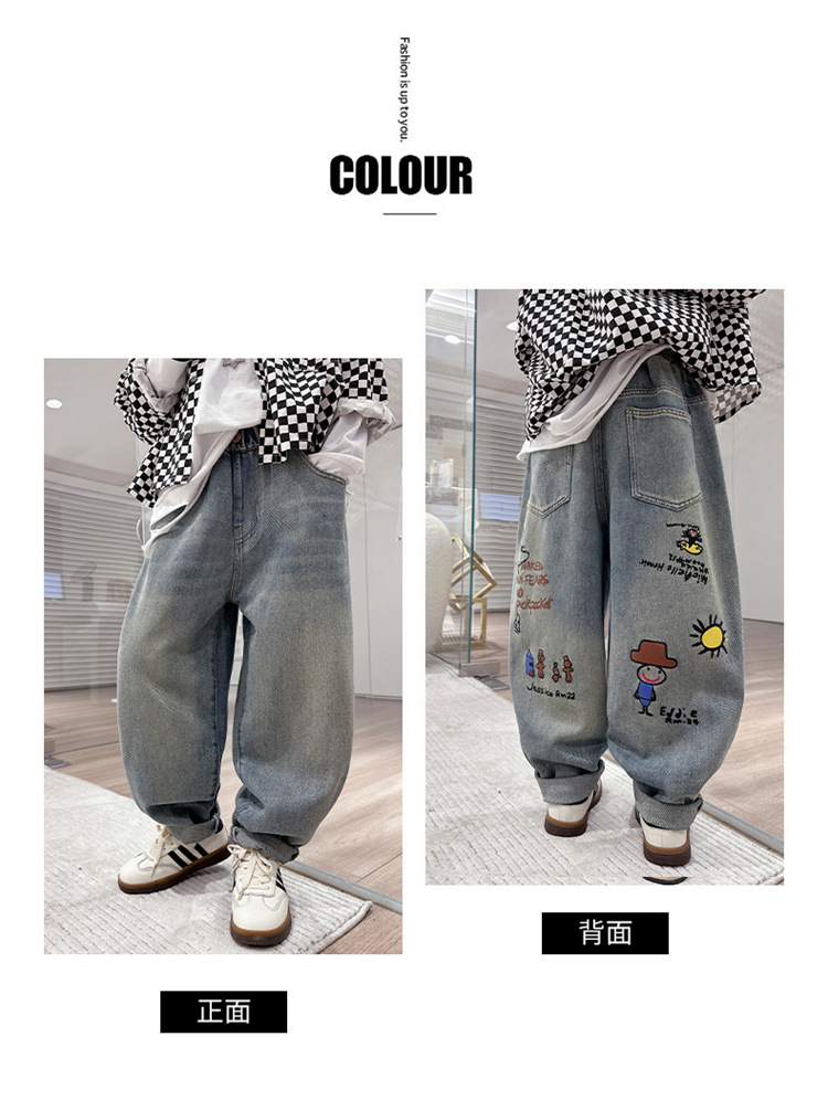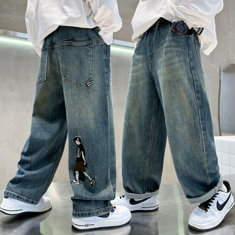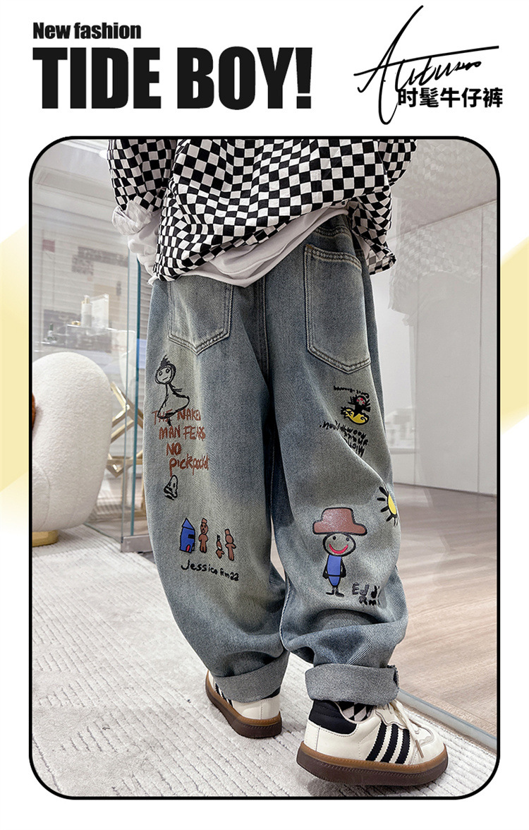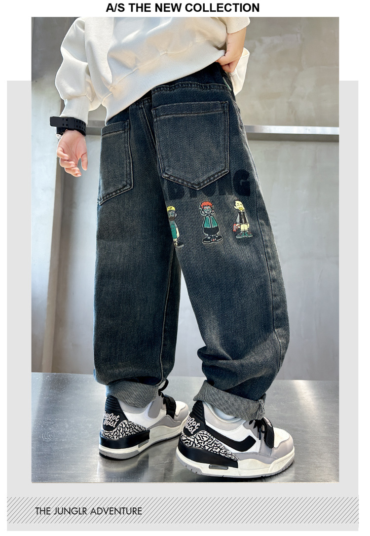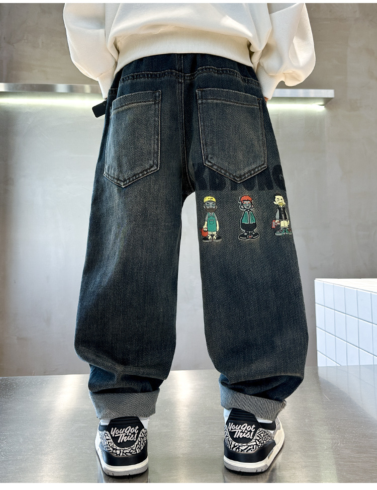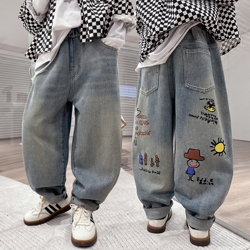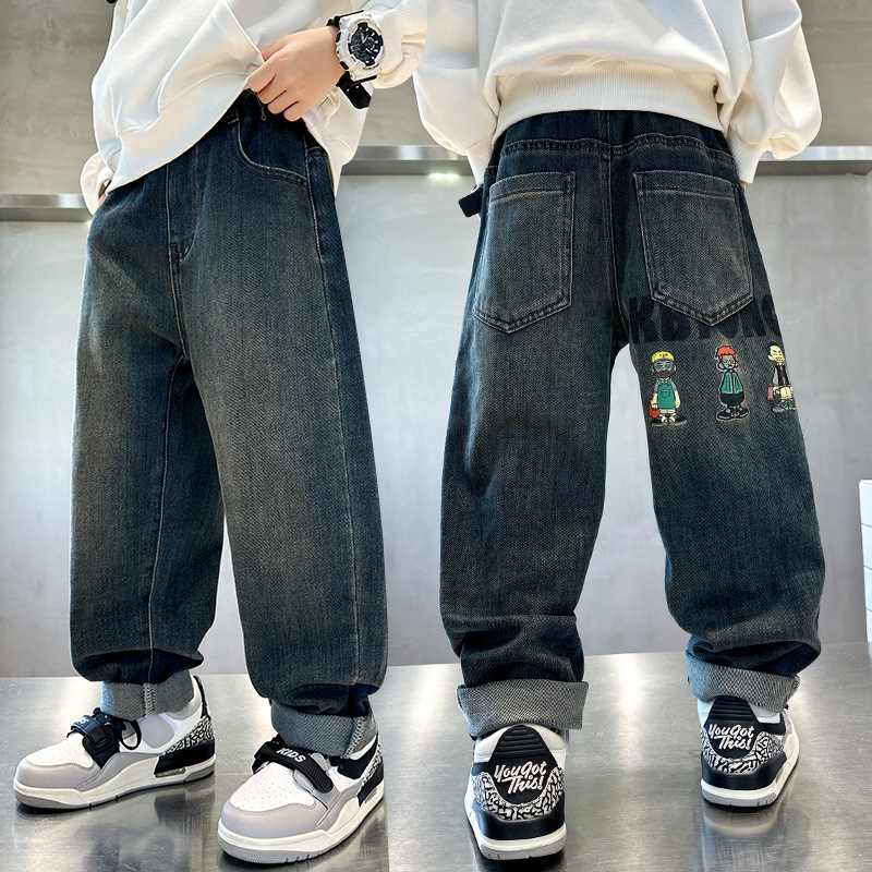 아동용 데님 팬츠 봄 가을 신상품 스트레이트 핏 부드러운 남아 바지 중대형 아동용 만화 캐릭터 봄 얇은 바지 2026 봄 남아용스토어 가기