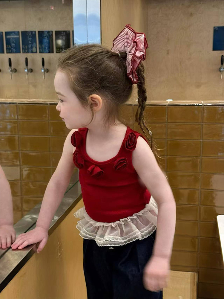 한국 소녀의 우아한 입체 꽃 조끼 2025 여름 아기 소녀의 새로운 달콤한 서양 스타일 빨간 카미솔 셔츠
