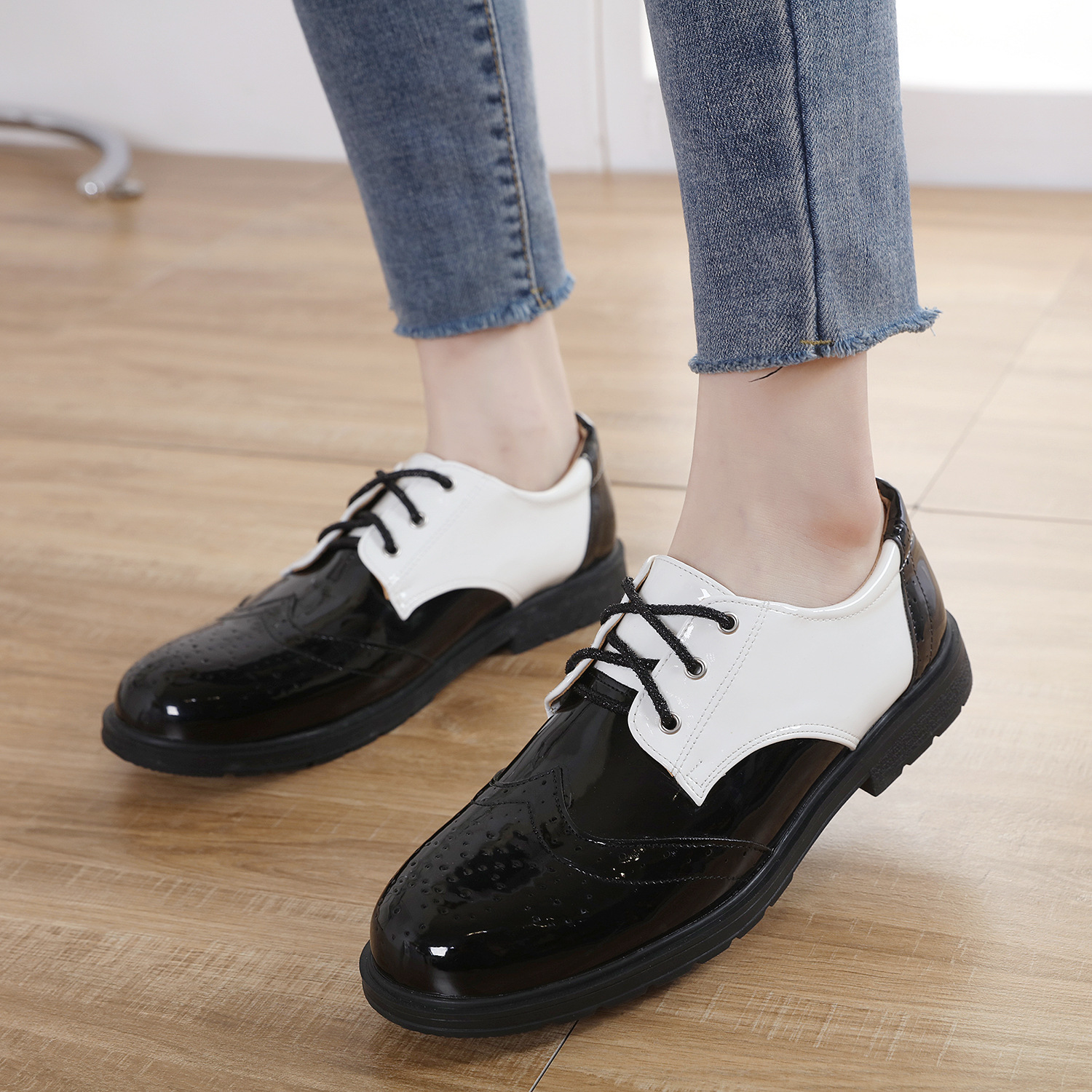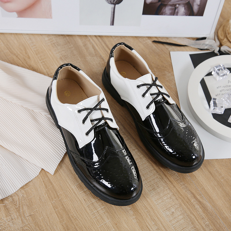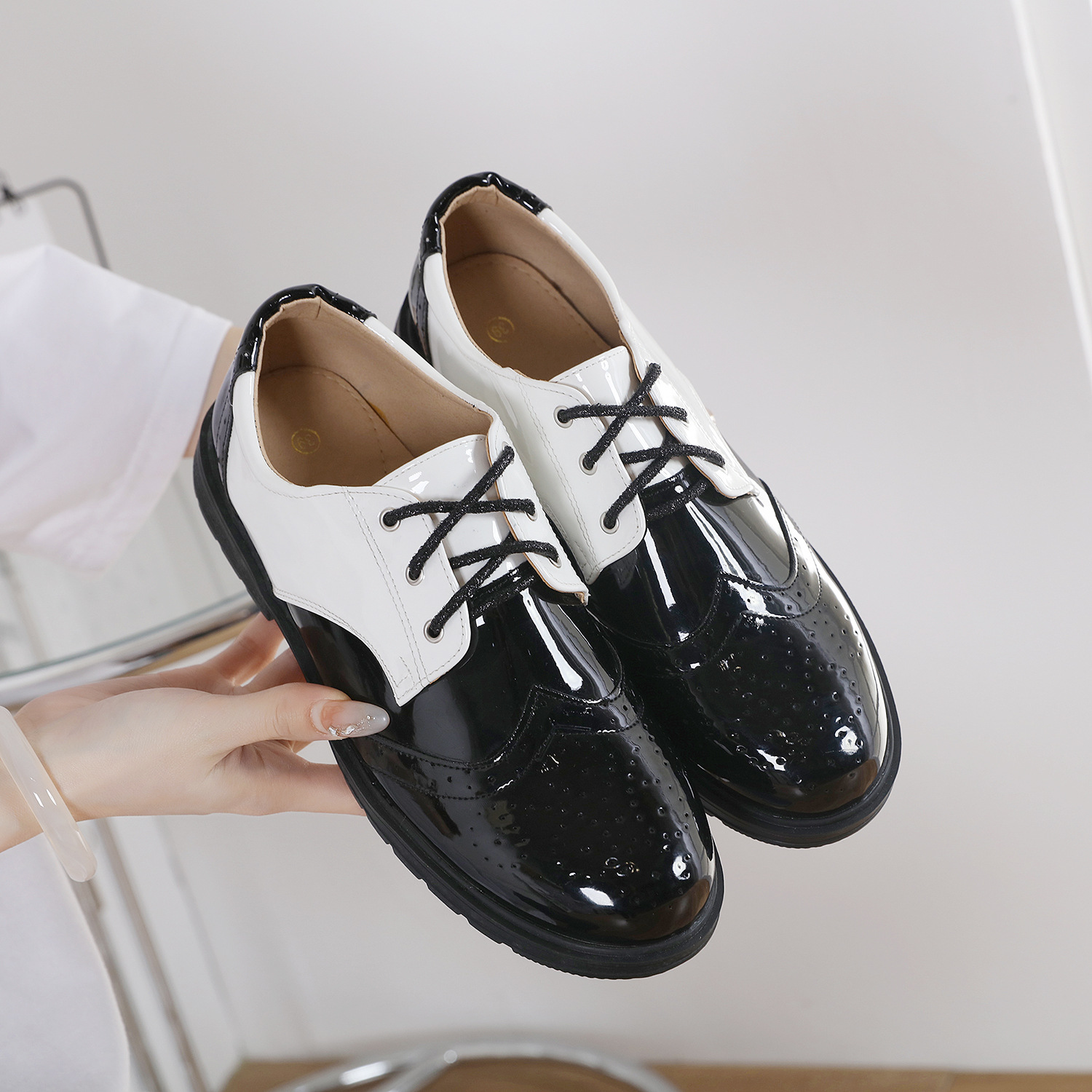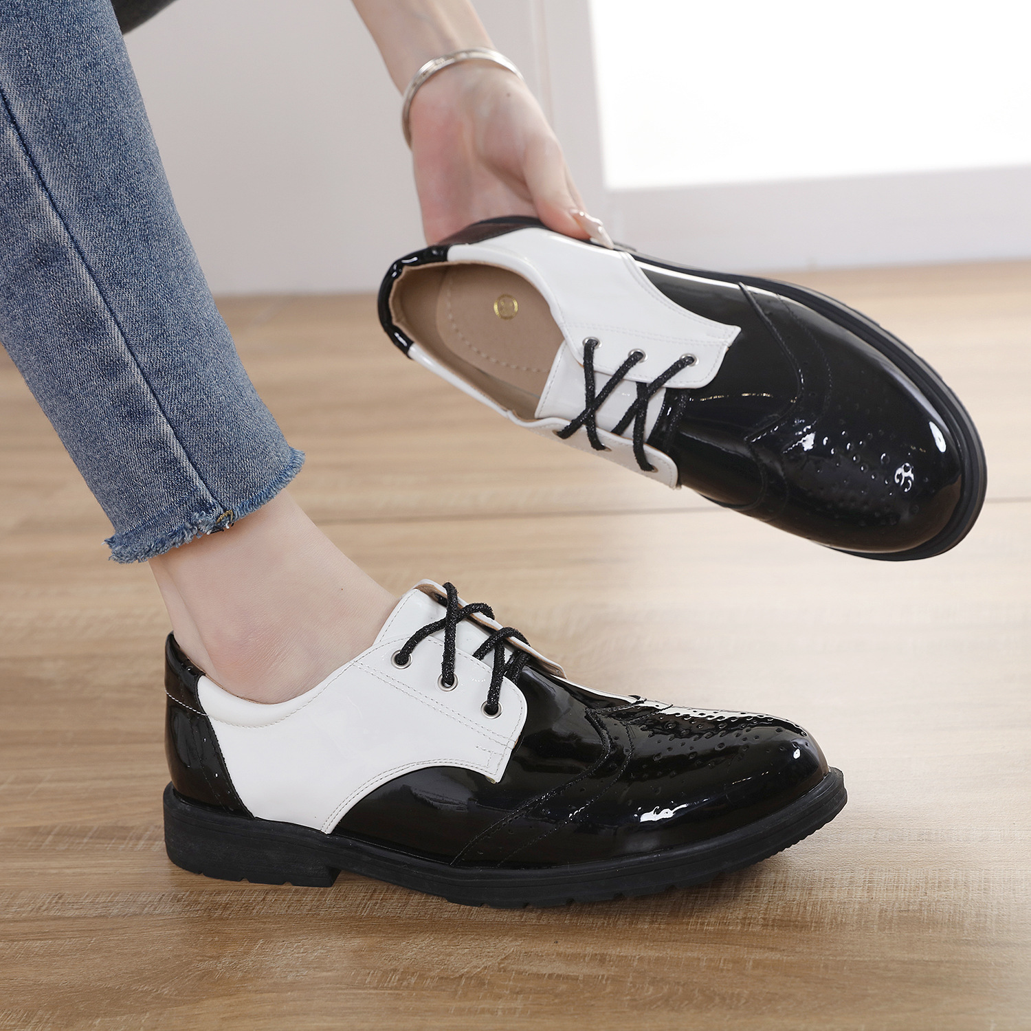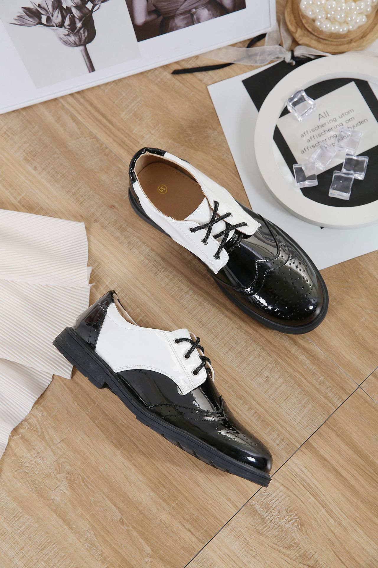 영국 스타일의 작은 가죽 신발 흑백 컬러 블록 브로그 여성 신발 조각 가죽 플랫 힐 부드러운 바닥 레이스 깊은 입 단일 신발