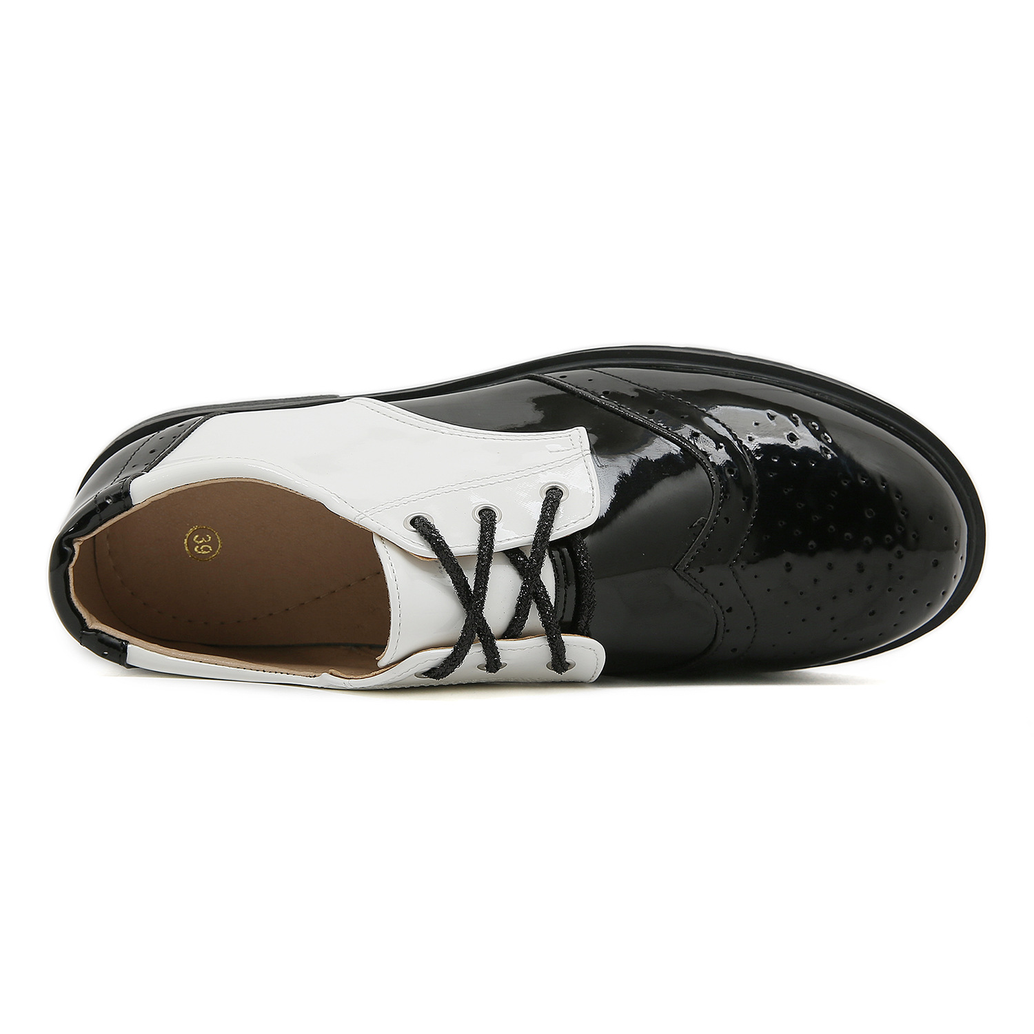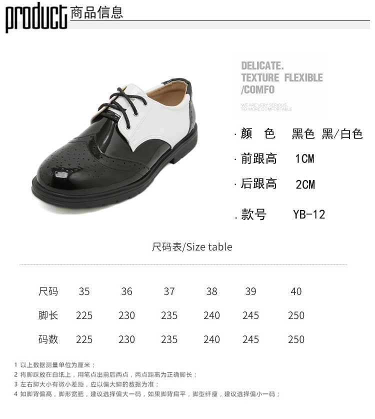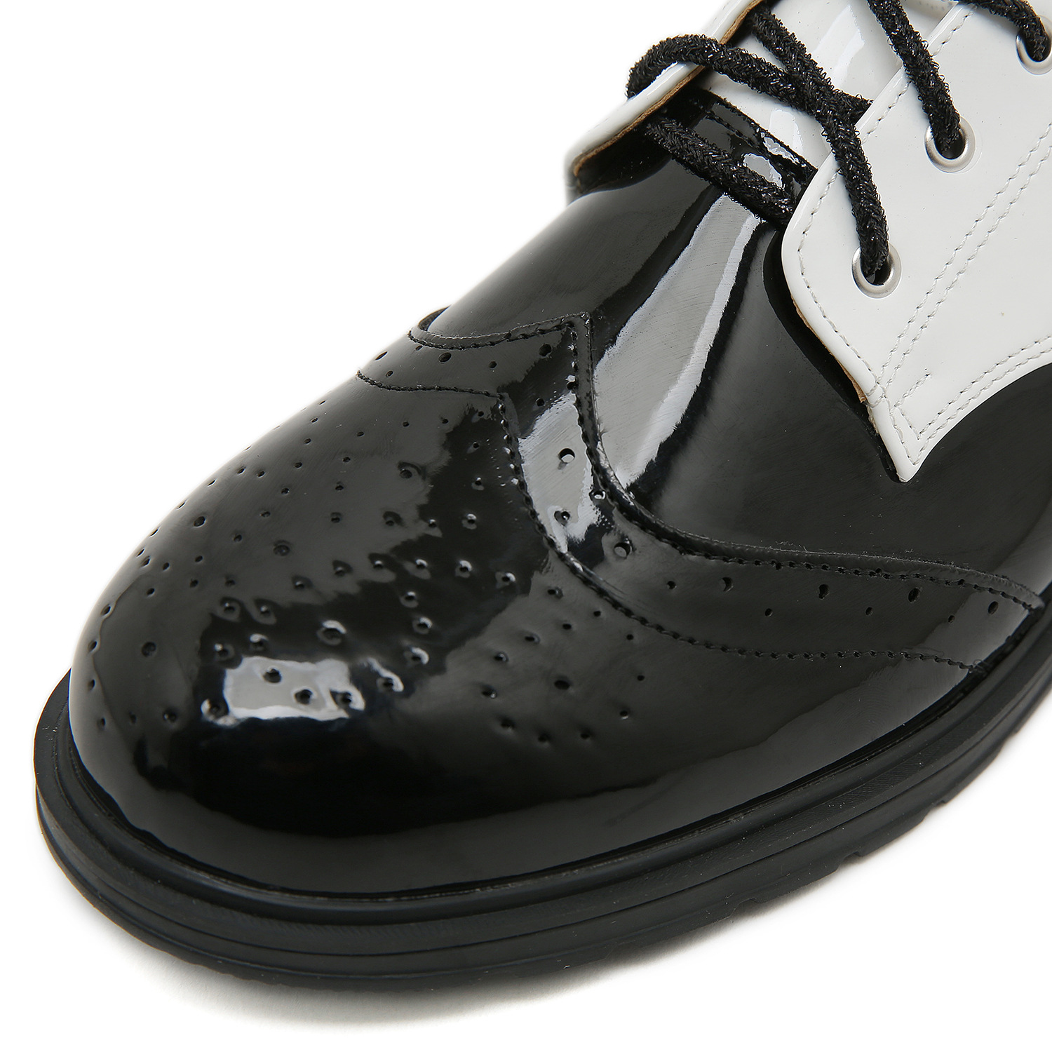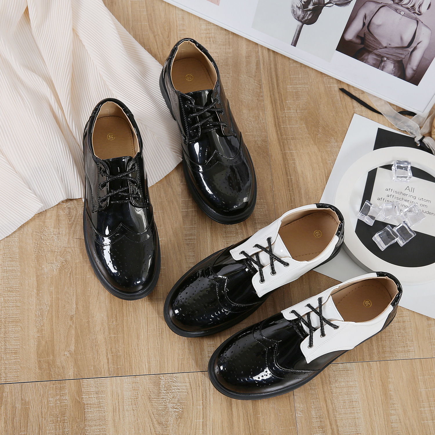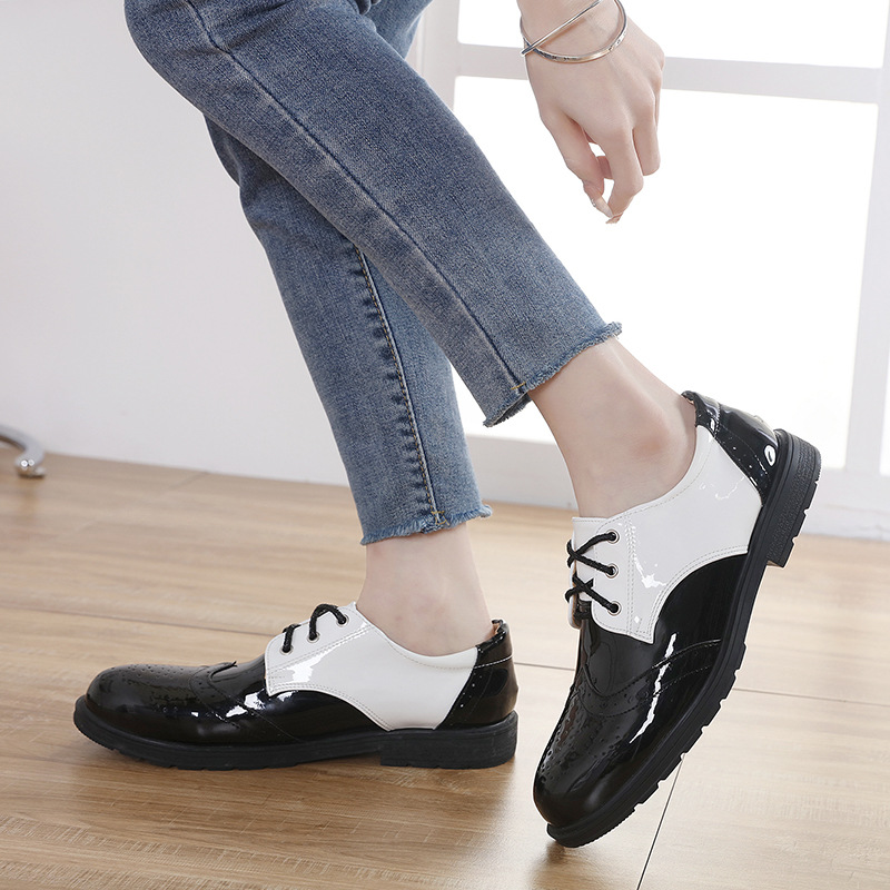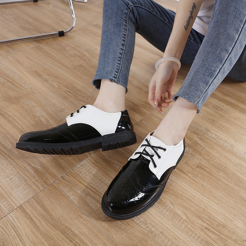 영국 스타일의 작은 가죽 신발 흑백 컬러 블록 브로그 여성 신발 조각 가죽 플랫 힐 부드러운 바닥 레이스 깊은 입 단일 신발