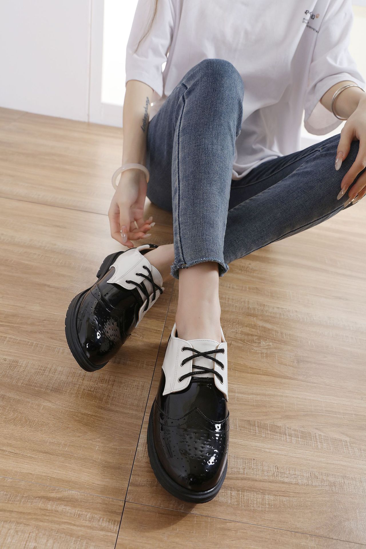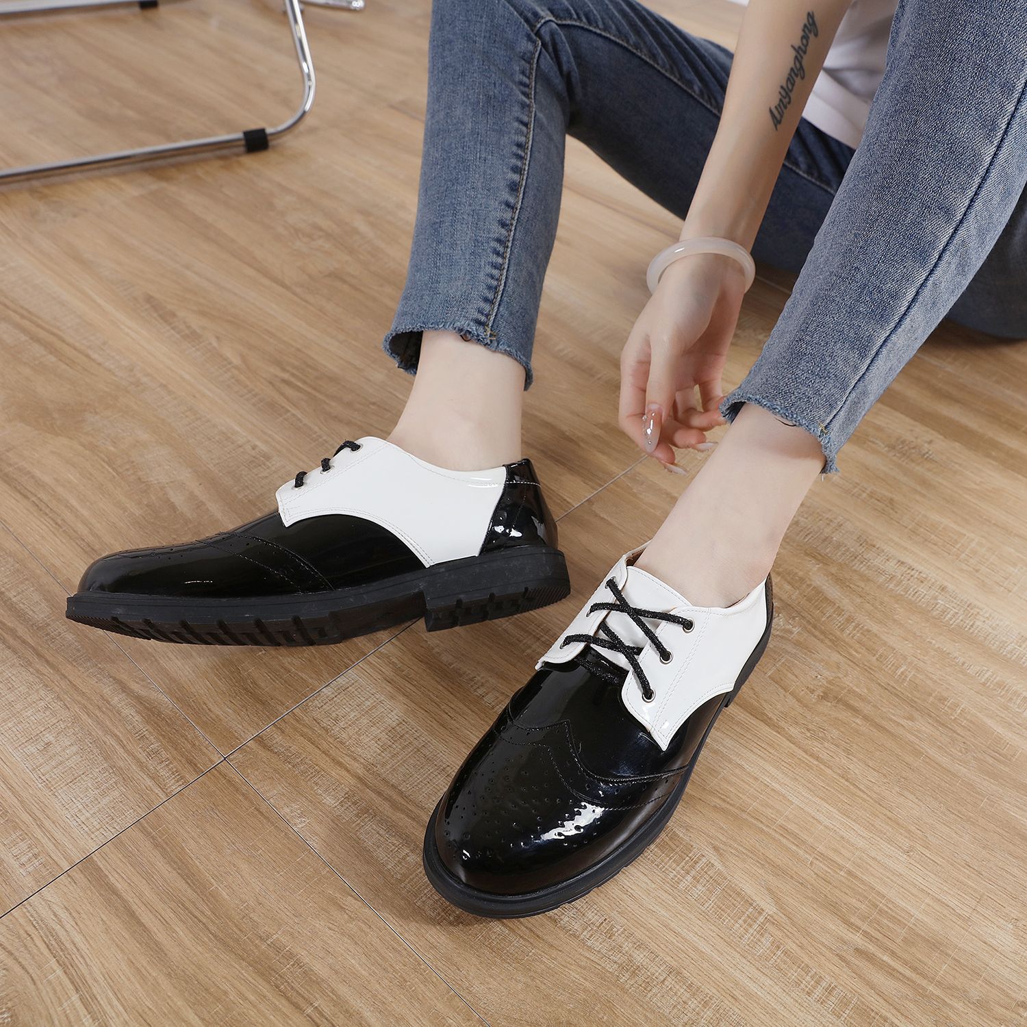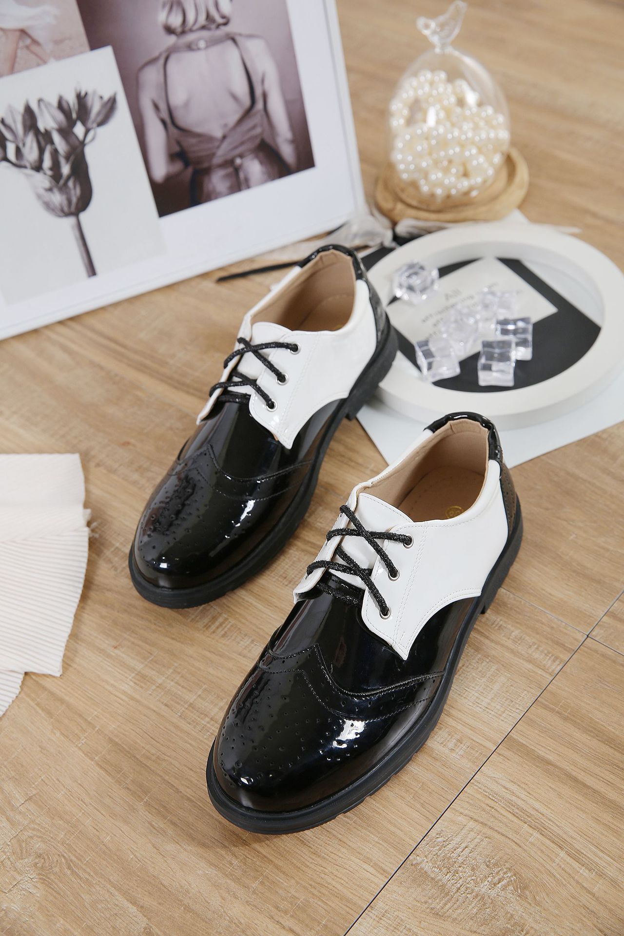 영국 스타일의 작은 가죽 신발 흑백 컬러 블록 브로그 여성 신발 조각 가죽 플랫 힐 부드러운 바닥 레이스 깊은 입 단일 신발스토어 가기