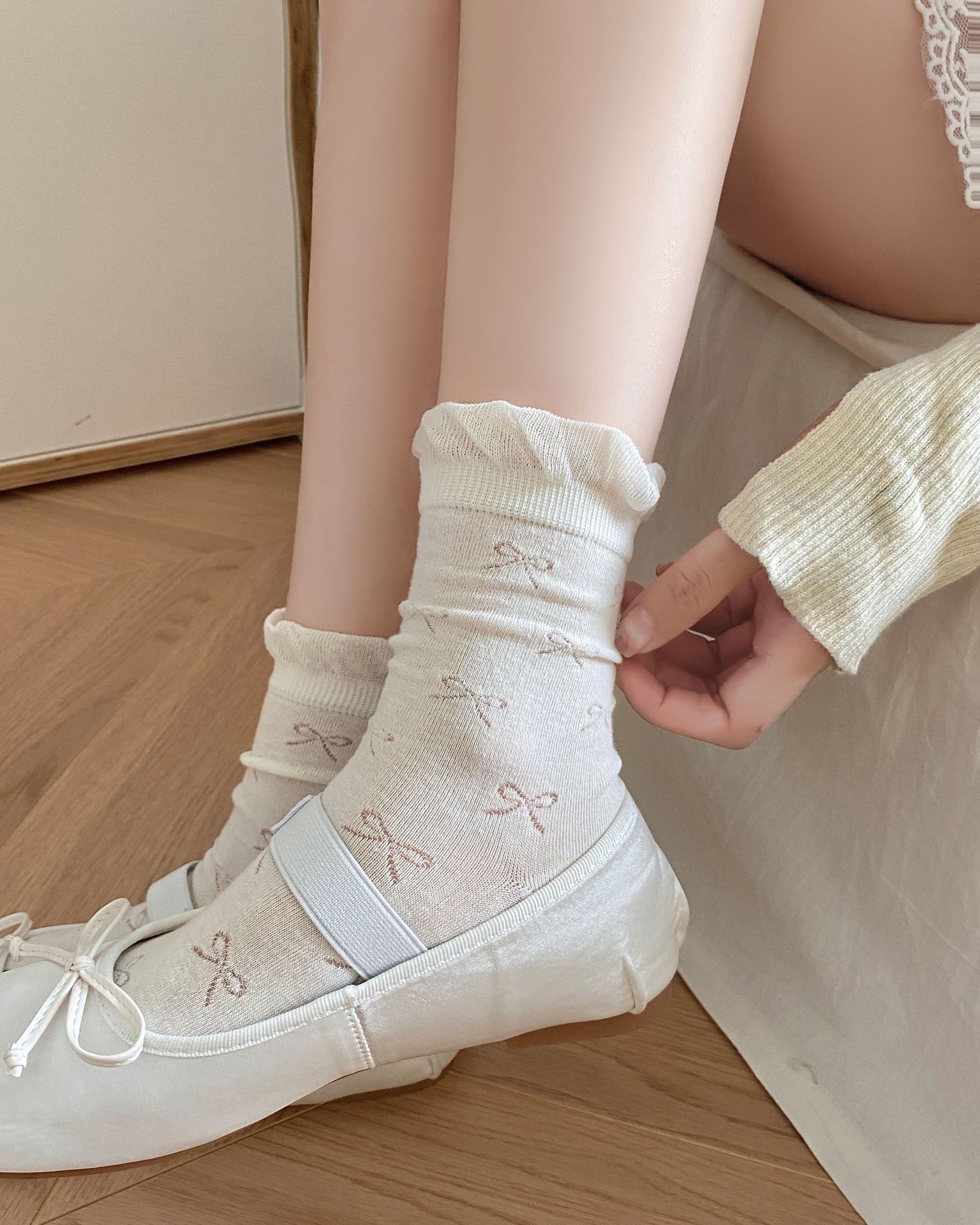 뼈없는 양말 여성의 얇은 중공 튜브 양말 활 발레 스타일 여성 양말 일본식 거품 입 레이스 더미 양말