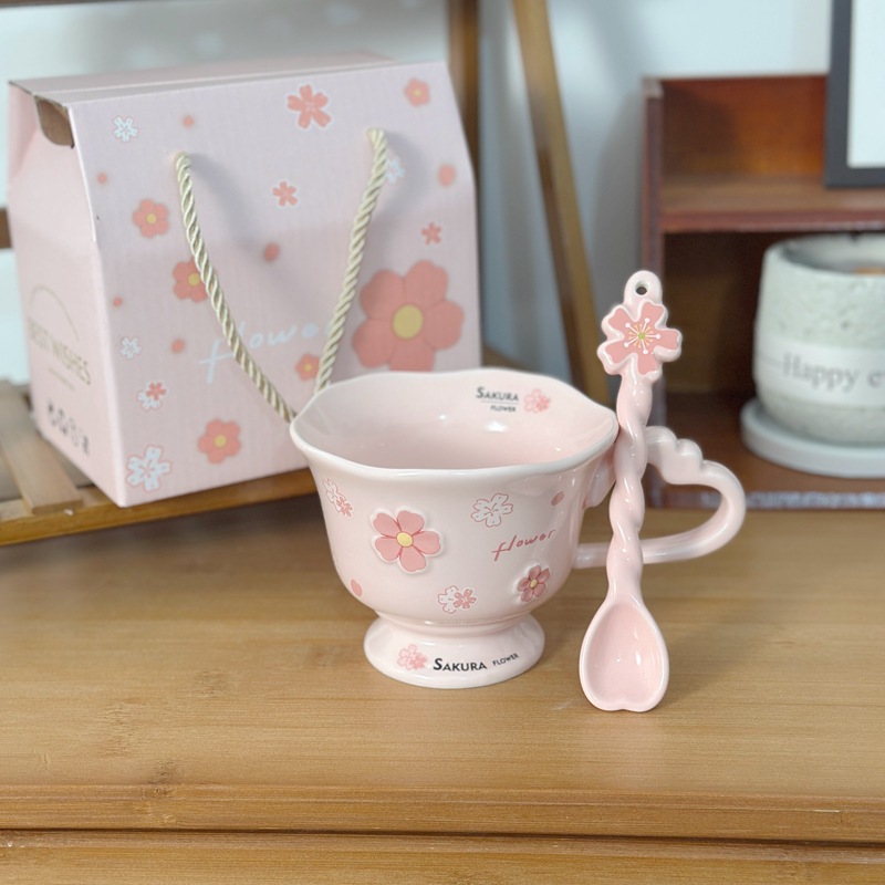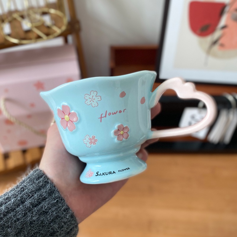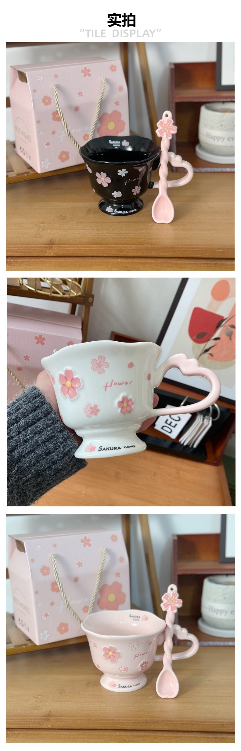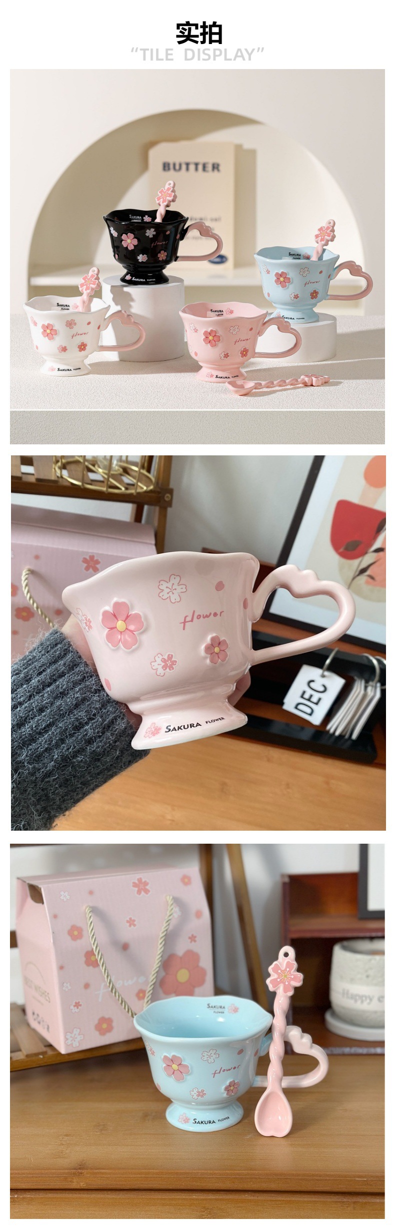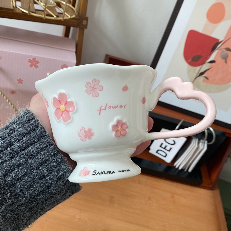 높은 뷰티 가치 벚꽃 양각 머그잔 독특한 창조적 인 핑크 가정용 세라믹 워터 컵 잔 손 선물스토어 가기