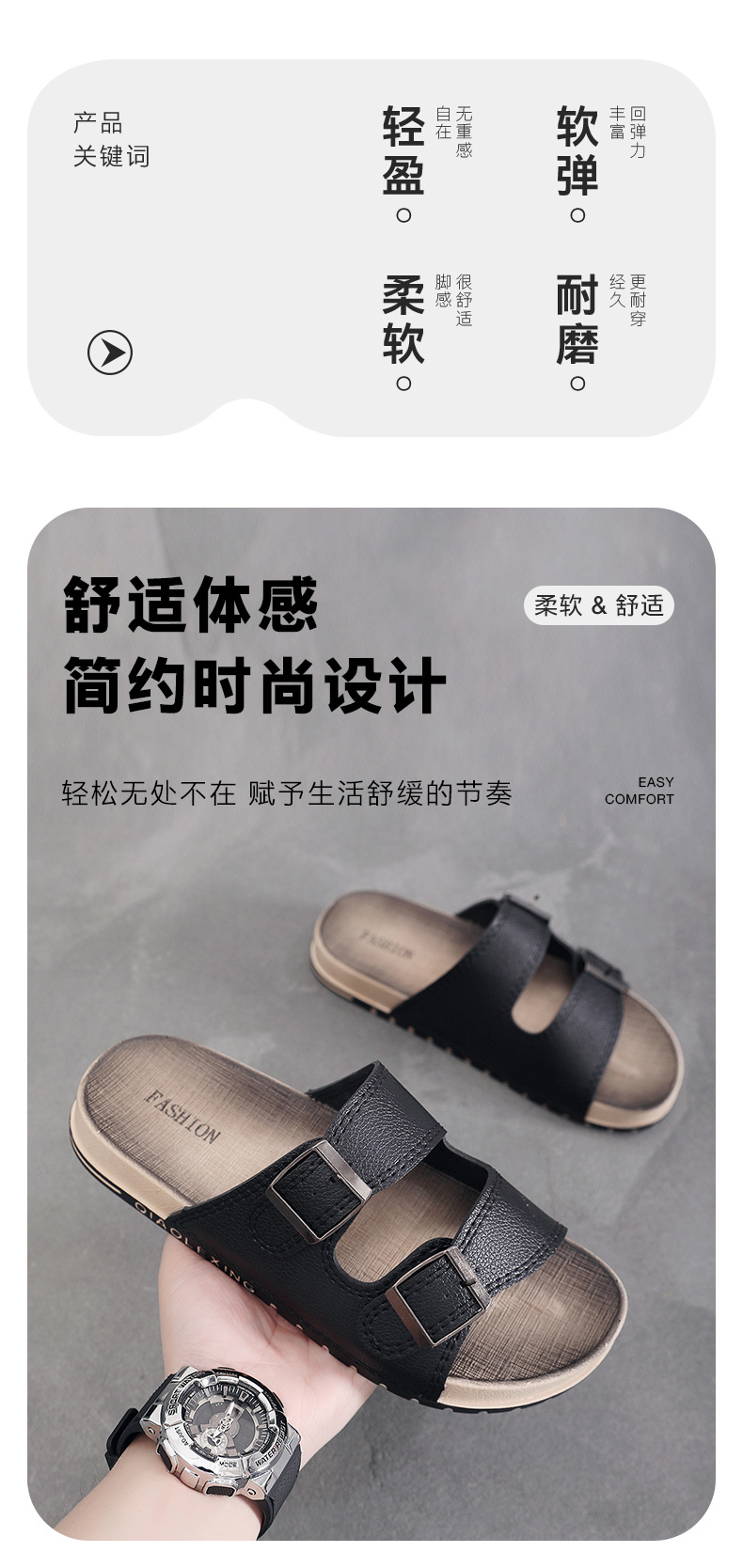 남자 여름 새로운 도착 두꺼운 유일한 미끄럼 방지 더블 브레스트 링 소프트 솔 샌들 및 슬리퍼 학생용 트렌디 비치 슈즈 남성용
