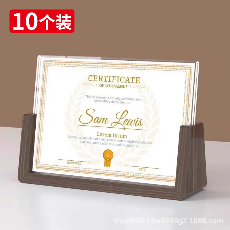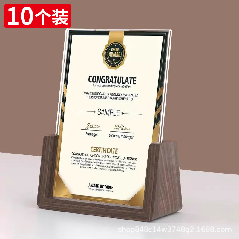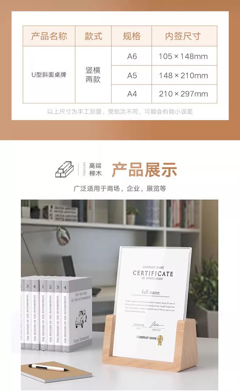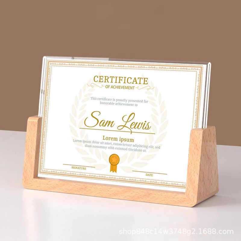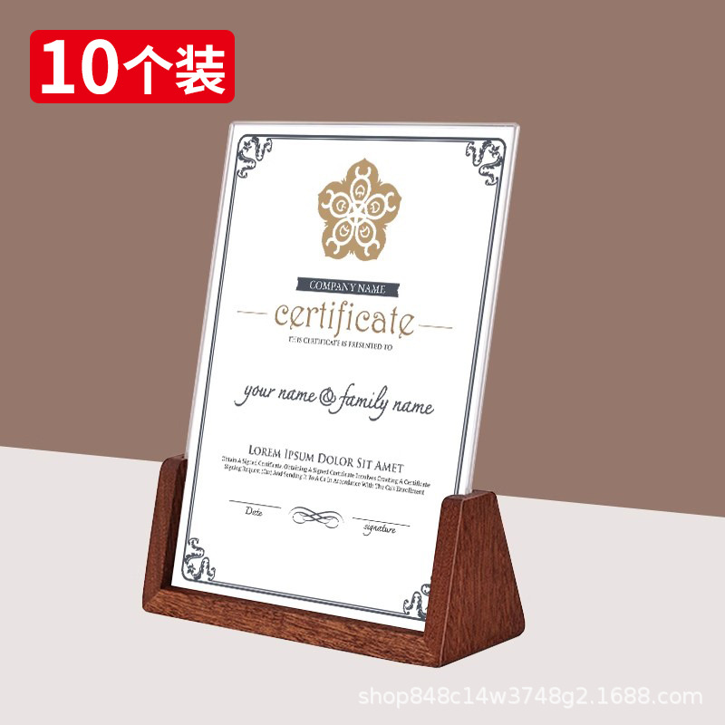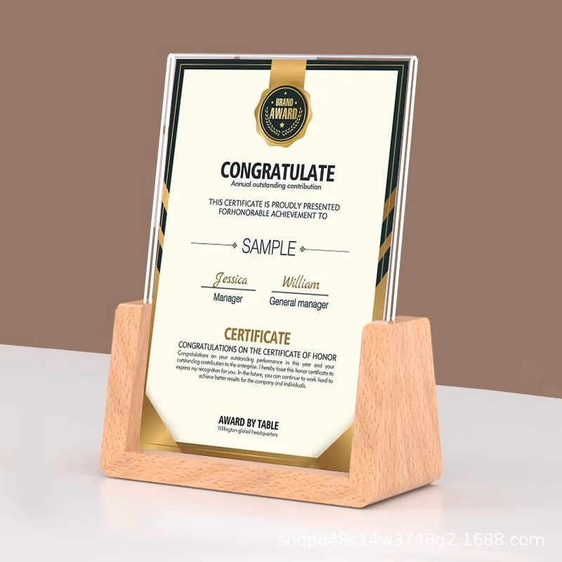 너도밤 나무 U 자형 데스크탑 A4 단계 프레임 물 브랜드 명예 인증서 아크릴 디스플레이 브랜드 나무 광고 브랜드스토어 가기