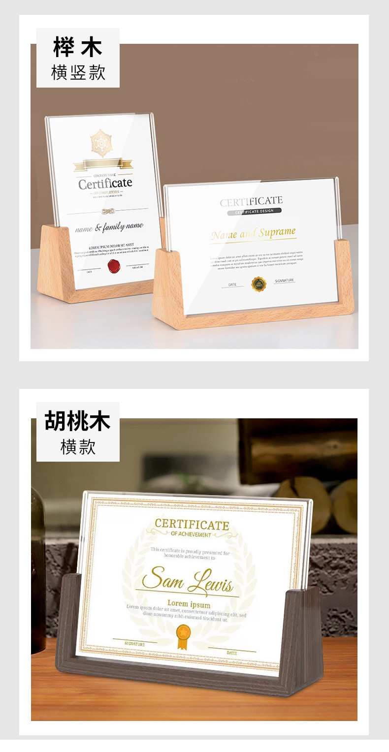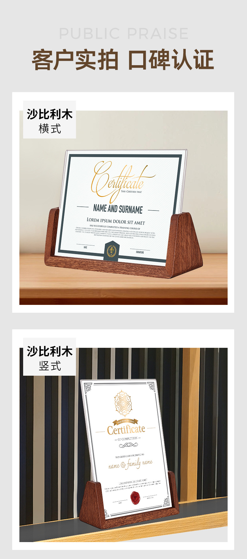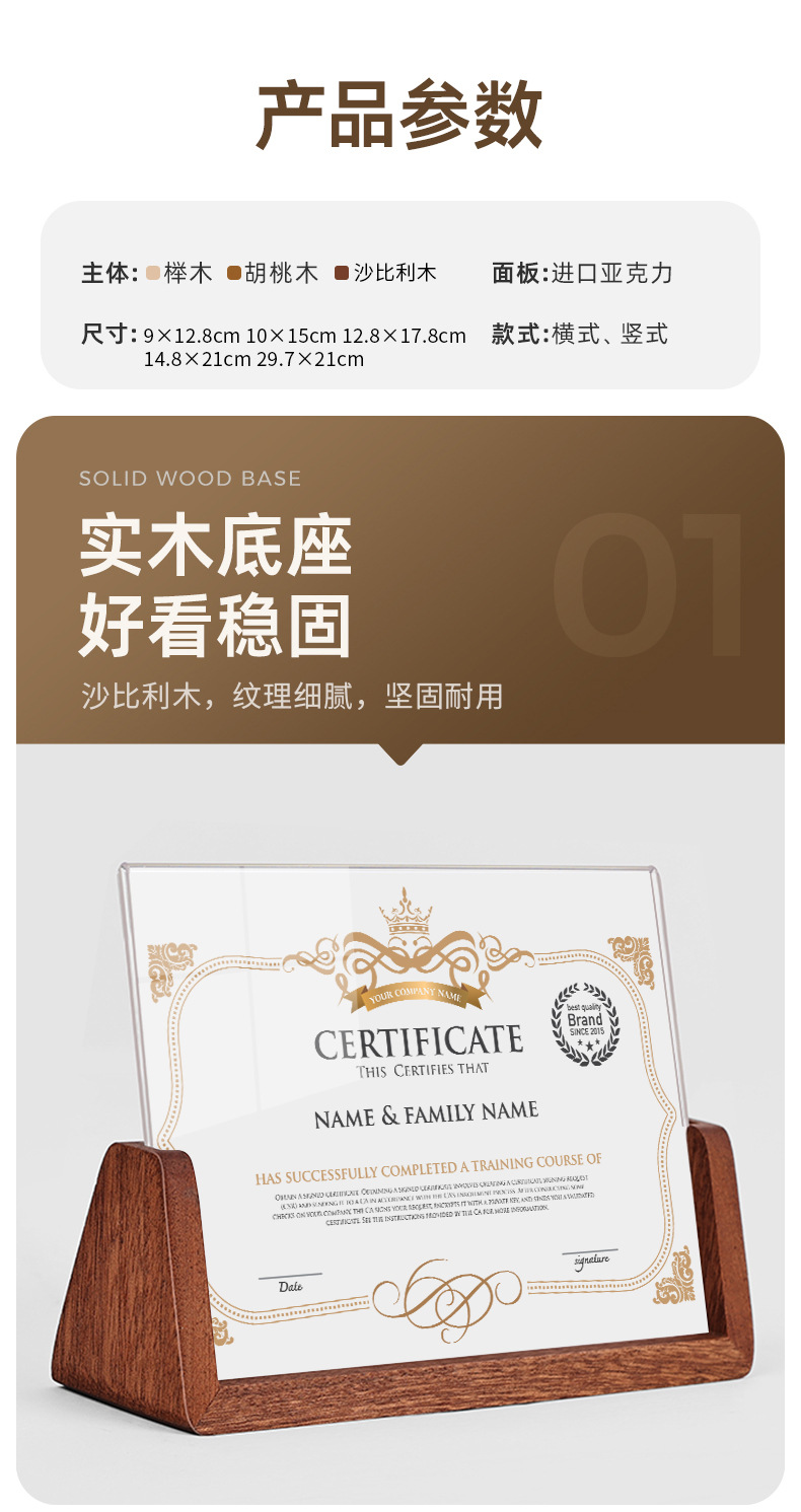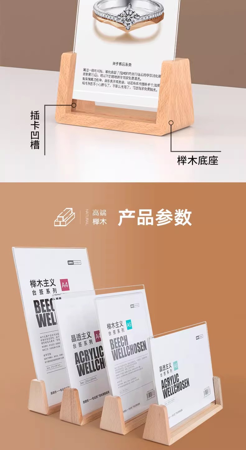 너도밤 나무 U 자형 데스크탑 A4 단계 프레임 물 브랜드 명예 인증서 아크릴 디스플레이 브랜드 나무 광고 브랜드스토어 가기