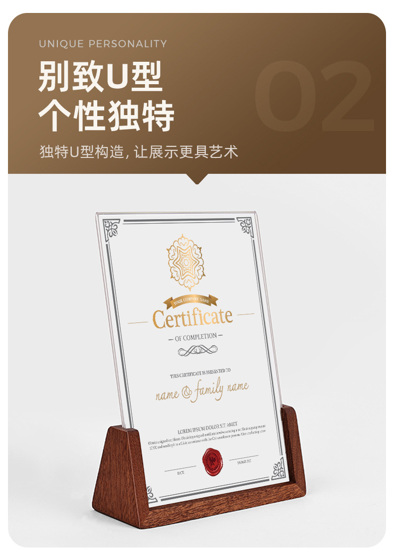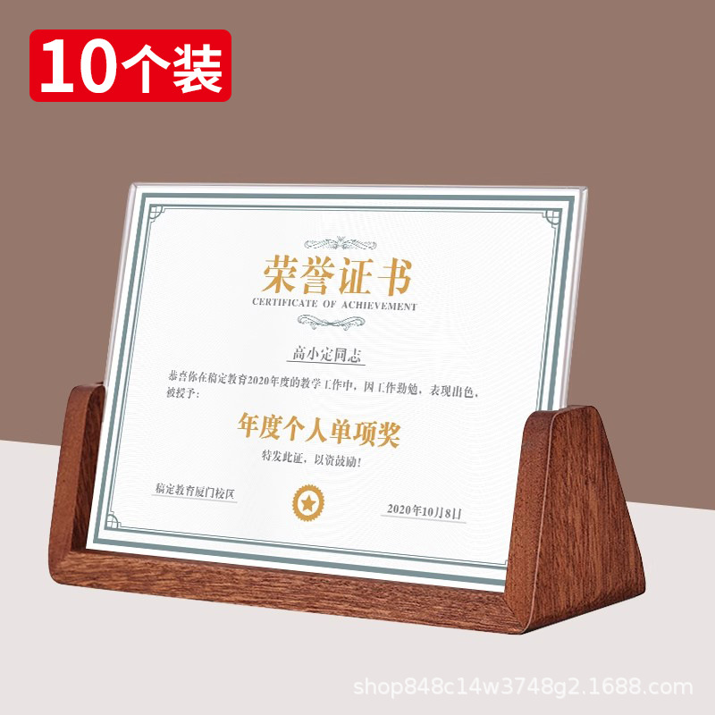너도밤 나무 U 자형 데스크탑 A4 단계 프레임 물 브랜드 명예 인증서 아크릴 디스플레이 브랜드 나무 광고 브랜드