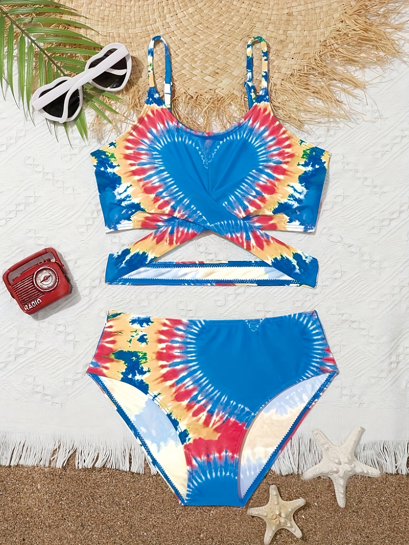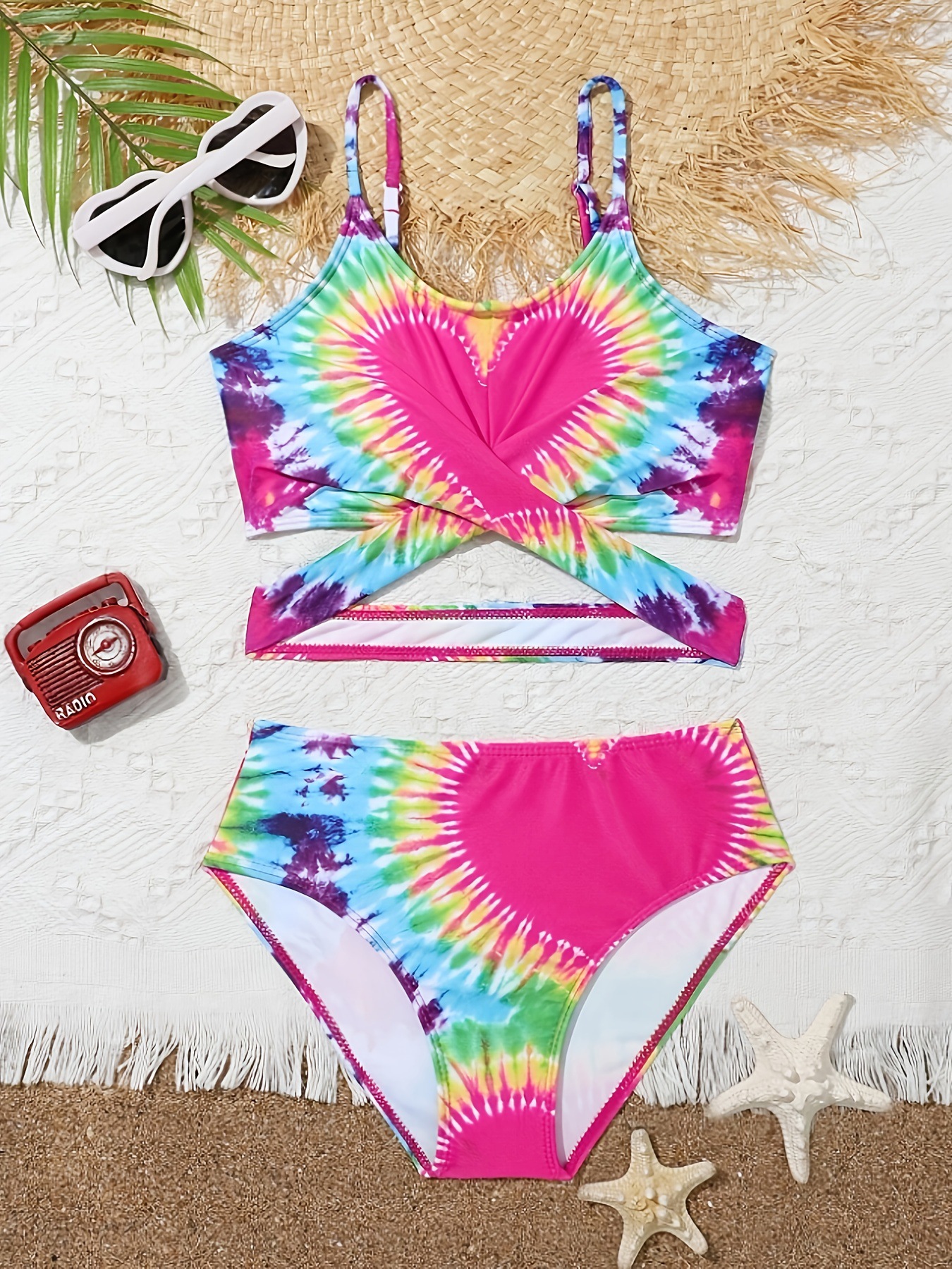 여아용 하트무늬 스위트 스타일 분리형 수영복, 중대형 아동용 수영복, 해변 및 온천 수영복, 퍼프 소매 아동용 모델
