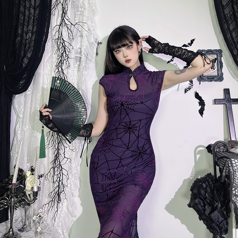 CF25029 유럽과 미국 스타일의 어두운 기질 거미 치삼 원피스 새로운 거미줄 새로운 중국 치삼 세트스토어 가기