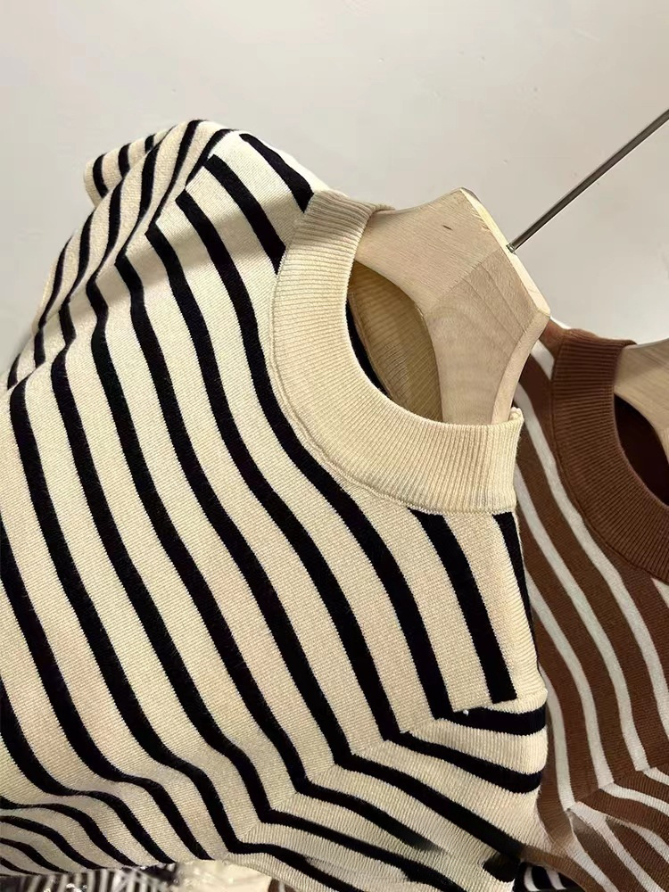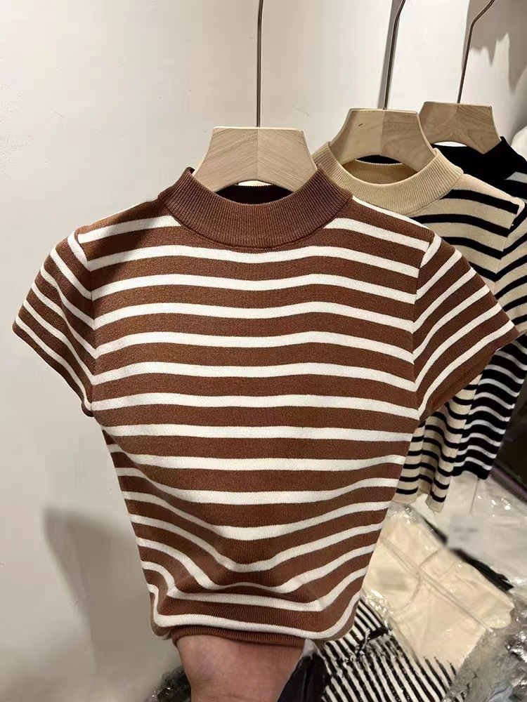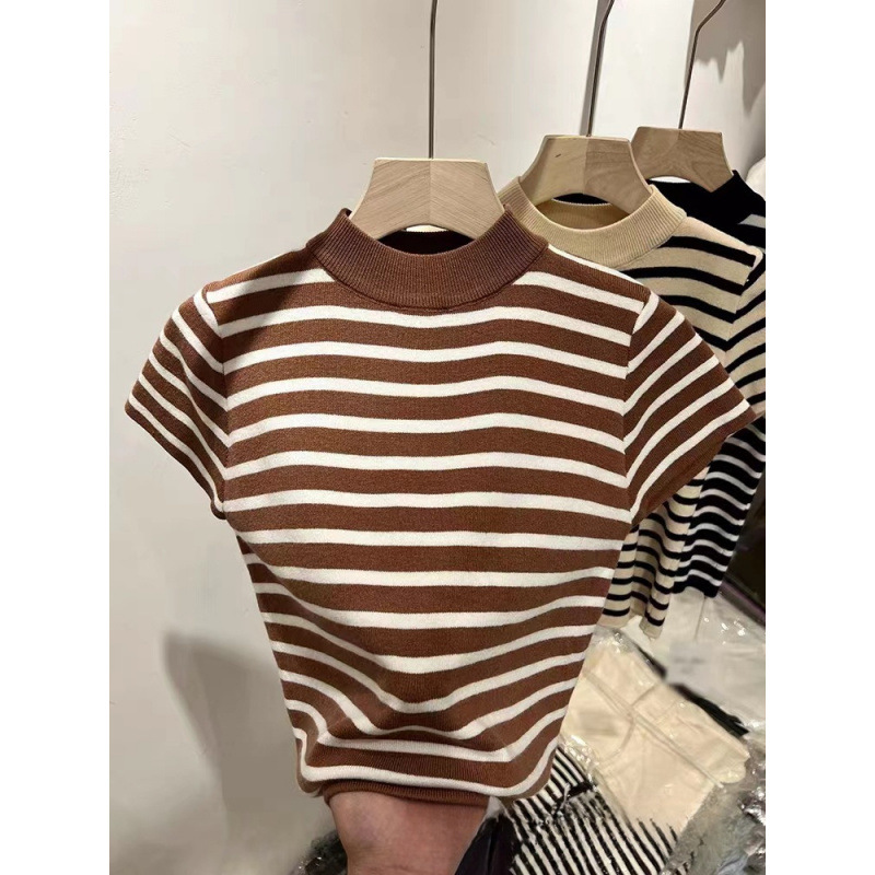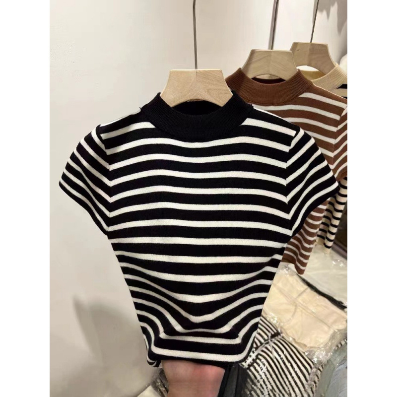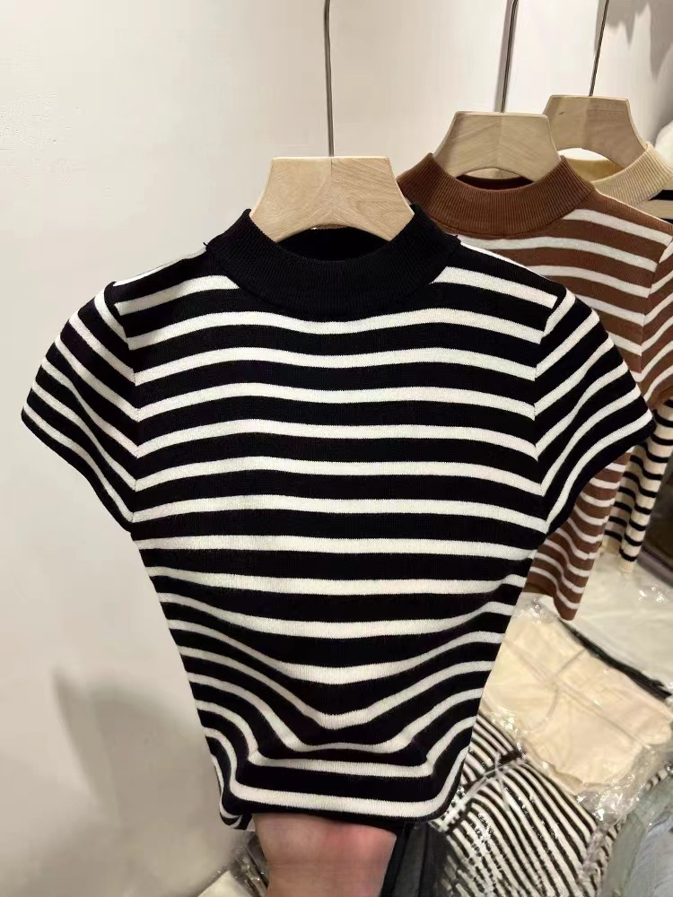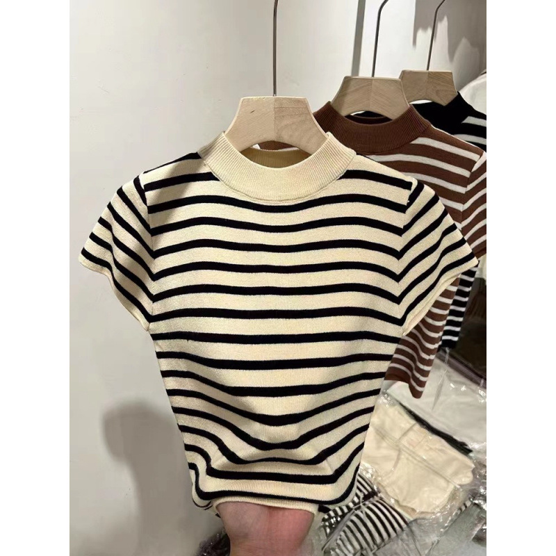 2023 가을 새 반 높이 칼라 스트라이프베이스 스웨터 여성용 슬림핏 슬리밍 반팔 아이스 실크 숄더 티셔츠
