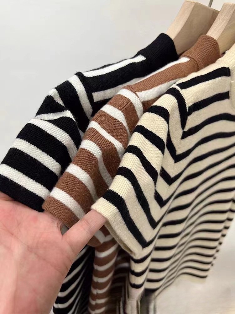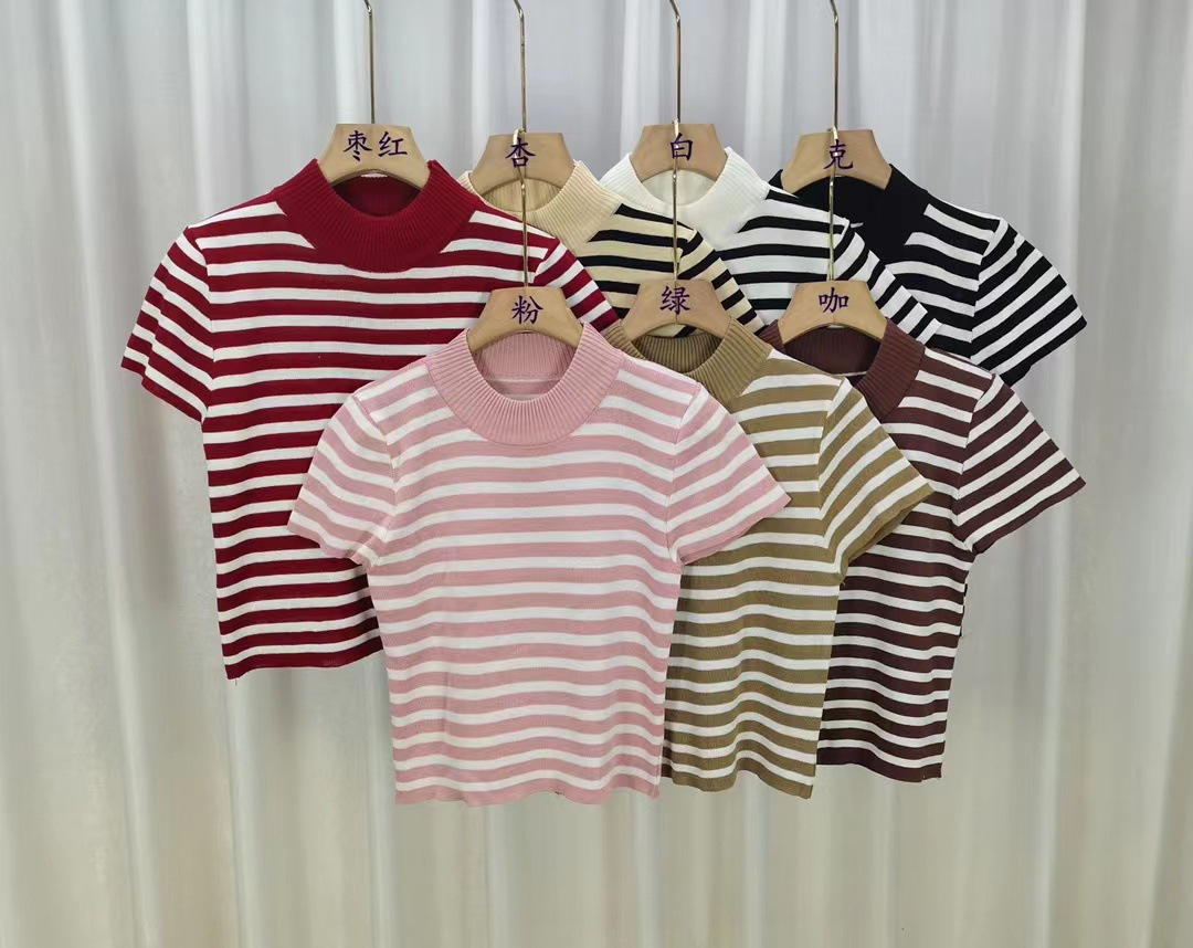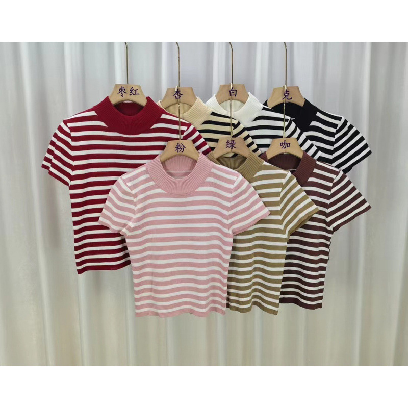 2023 가을 새 반 높이 칼라 스트라이프베이스 스웨터 여성용 슬림핏 슬리밍 반팔 아이스 실크 숄더 티셔츠스토어 가기