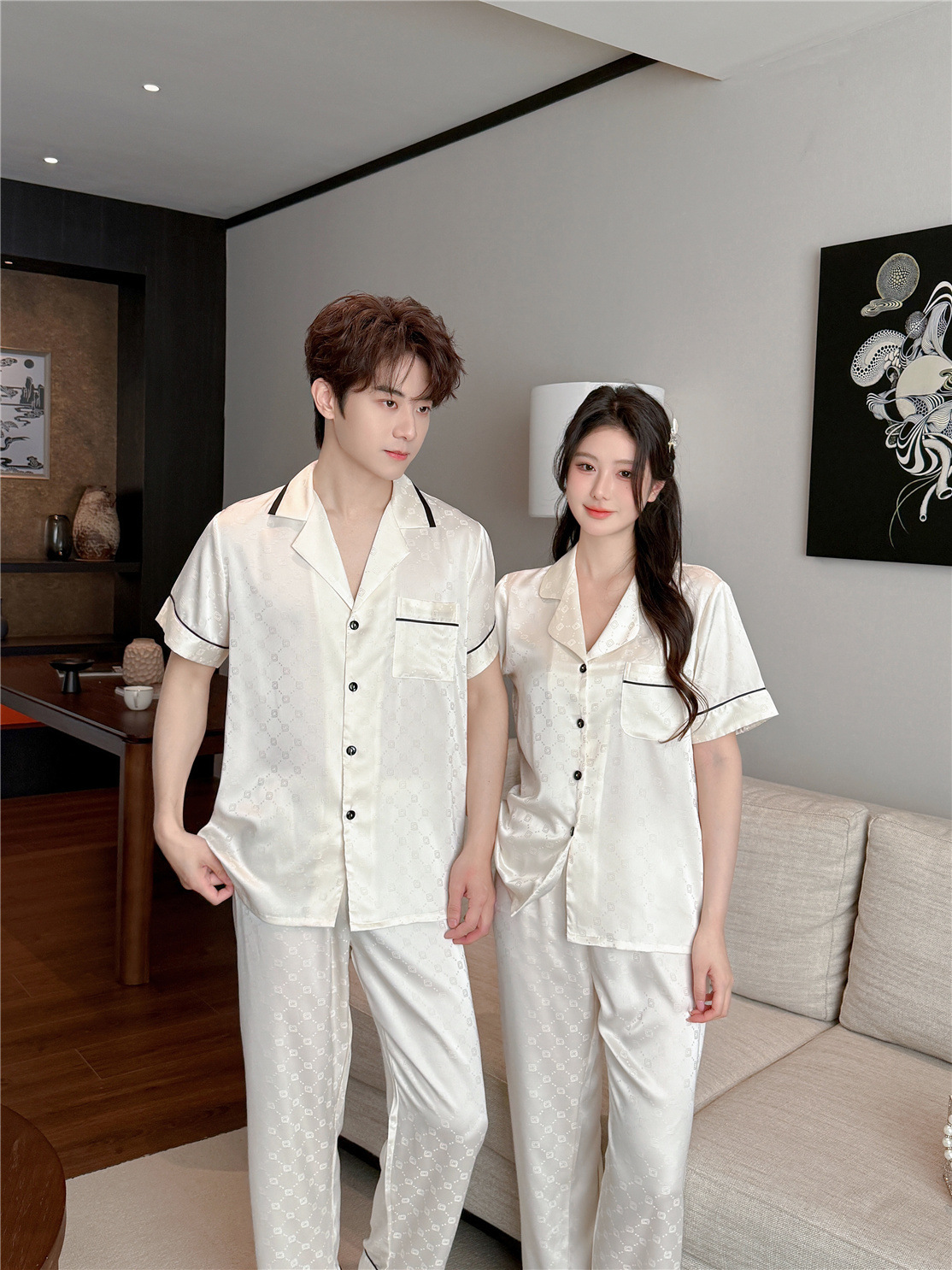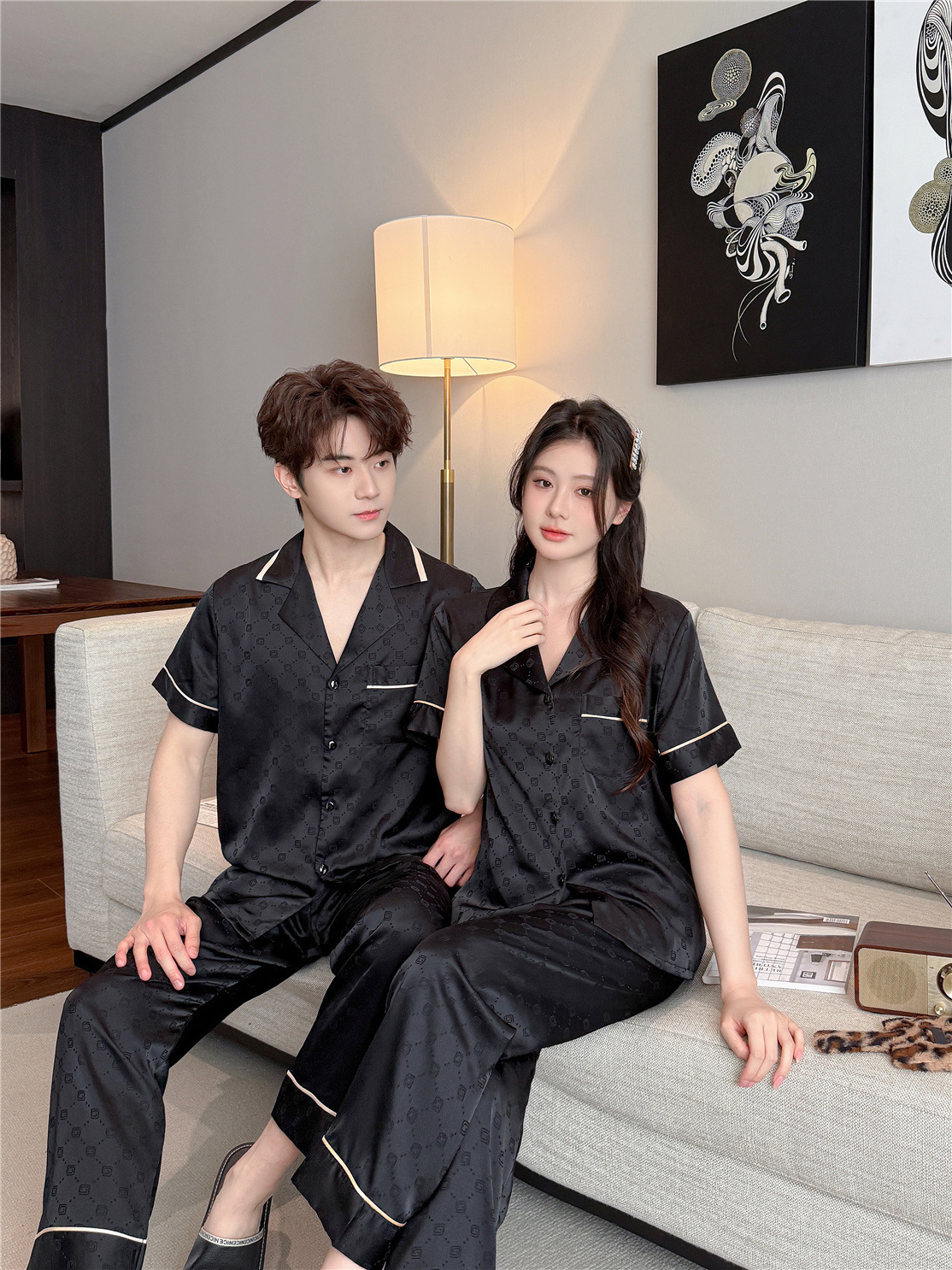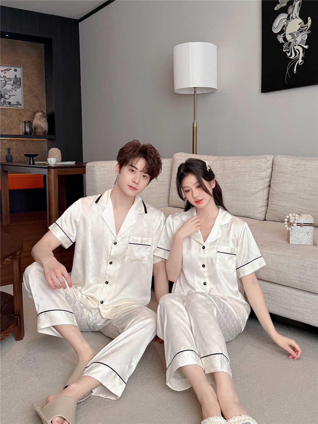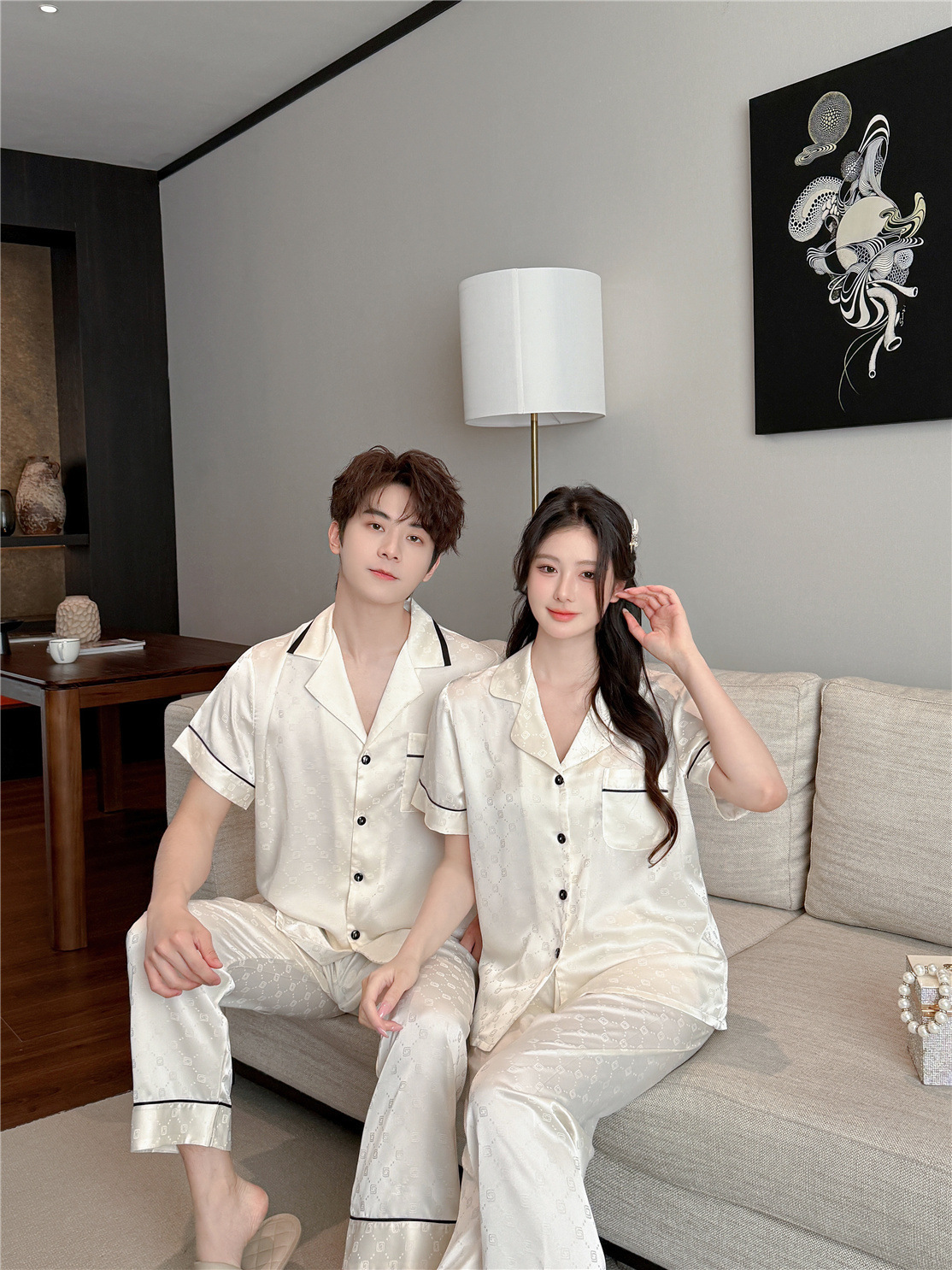 커플 잠옷 여성의 여름 아이스 실크 얇은 2025 새로운 높은 감각 짧은 소매 바지 남성용 홈 웨어