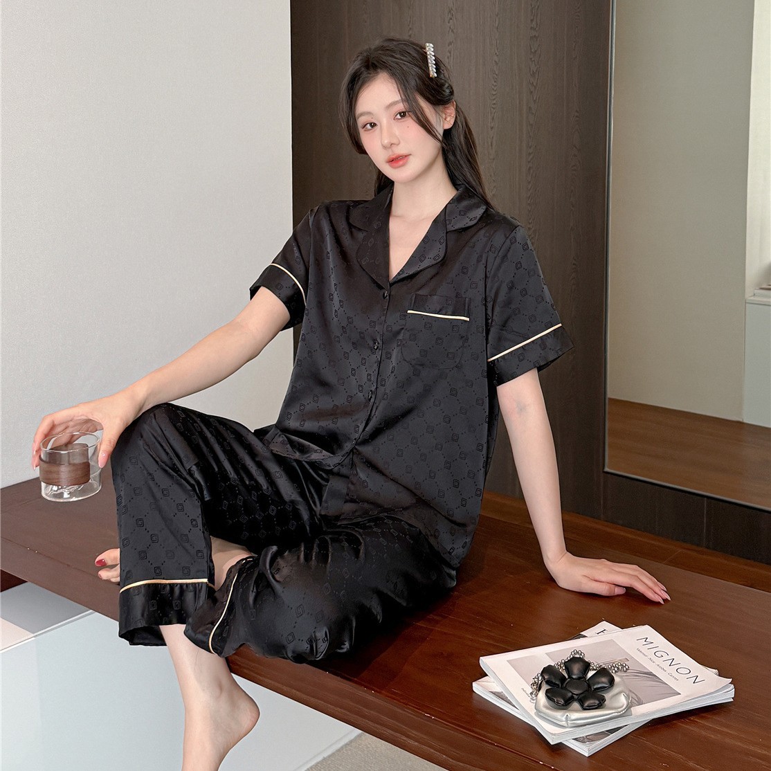 커플 잠옷 여성의 여름 아이스 실크 얇은 2025 새로운 높은 감각 짧은 소매 바지 남성용 홈 웨어스토어 가기