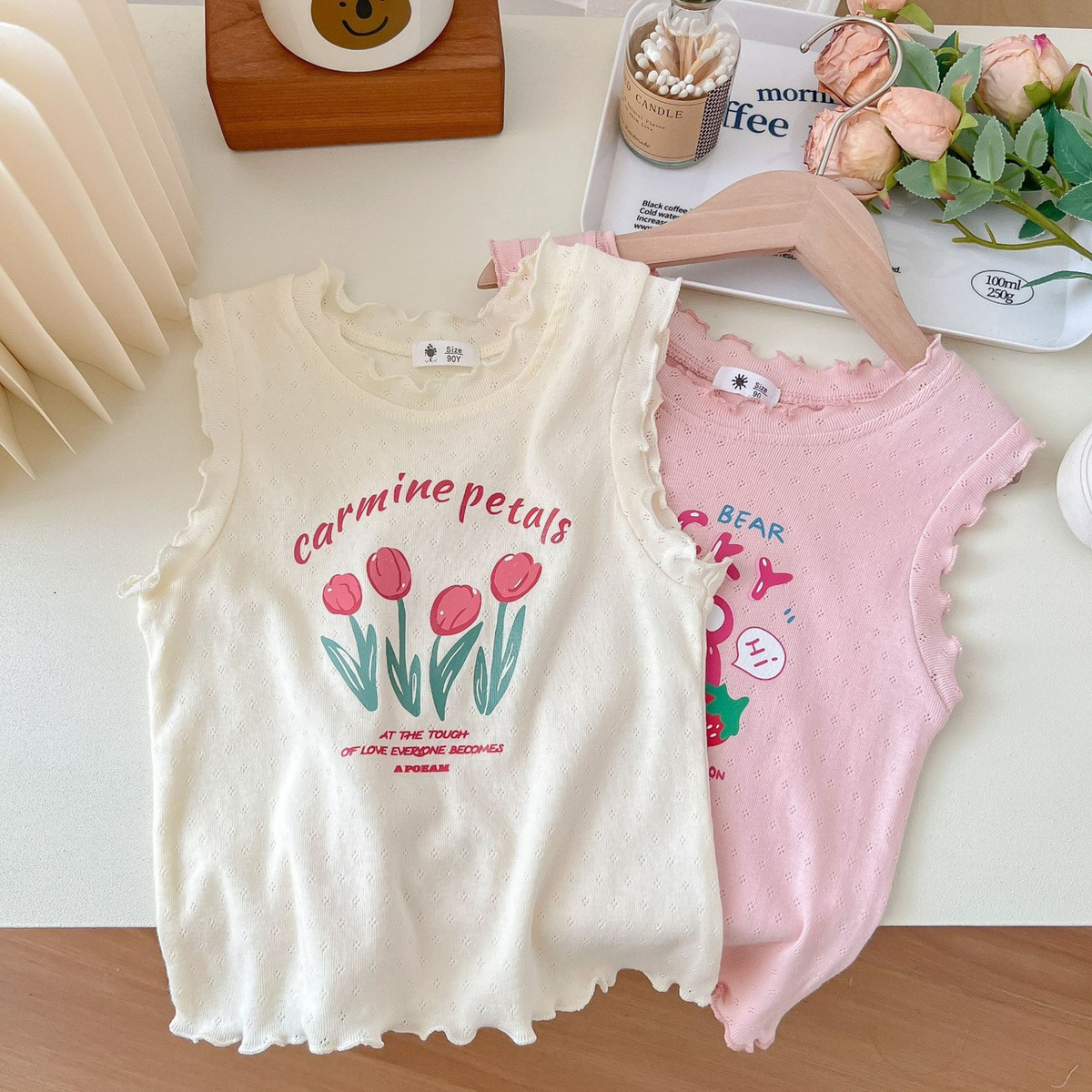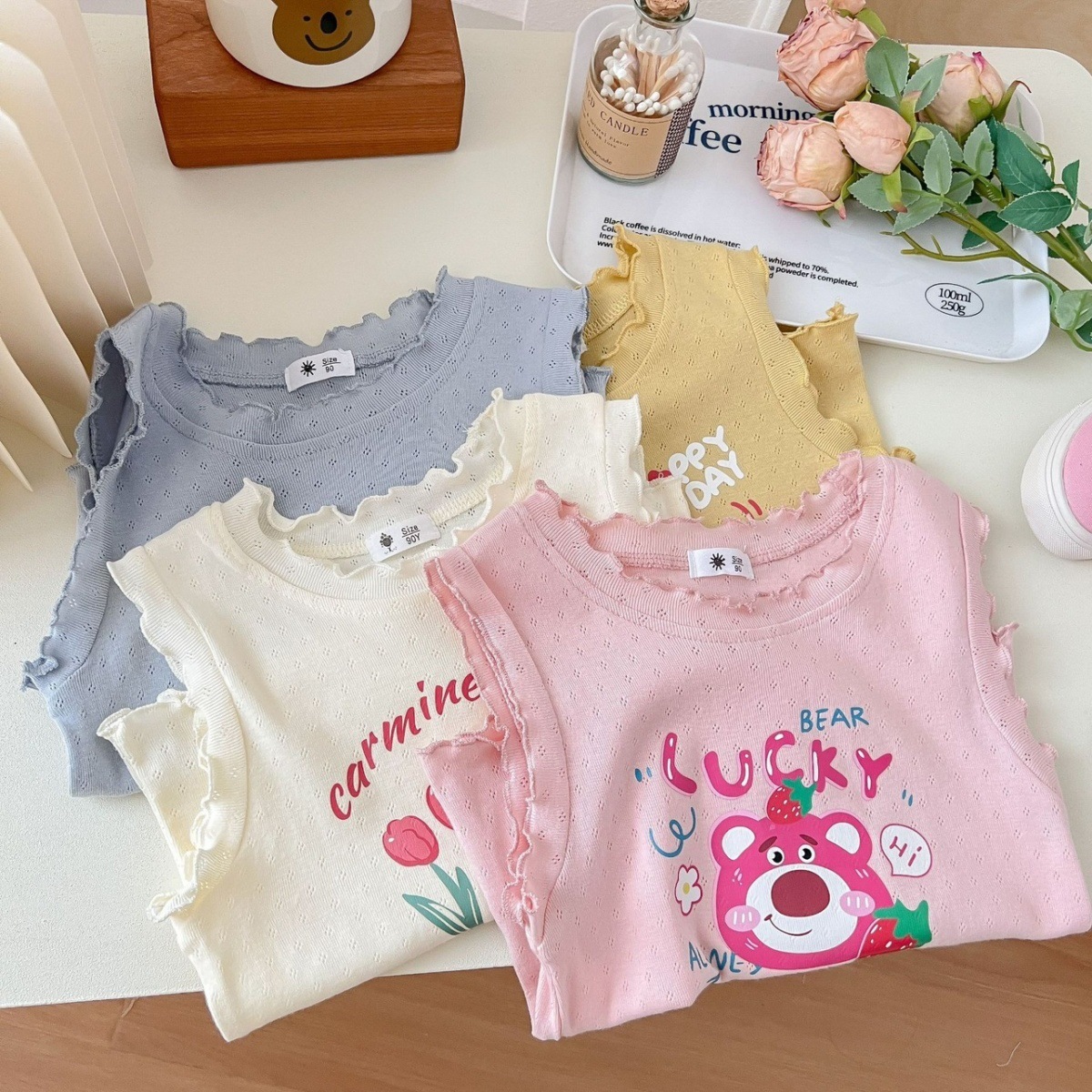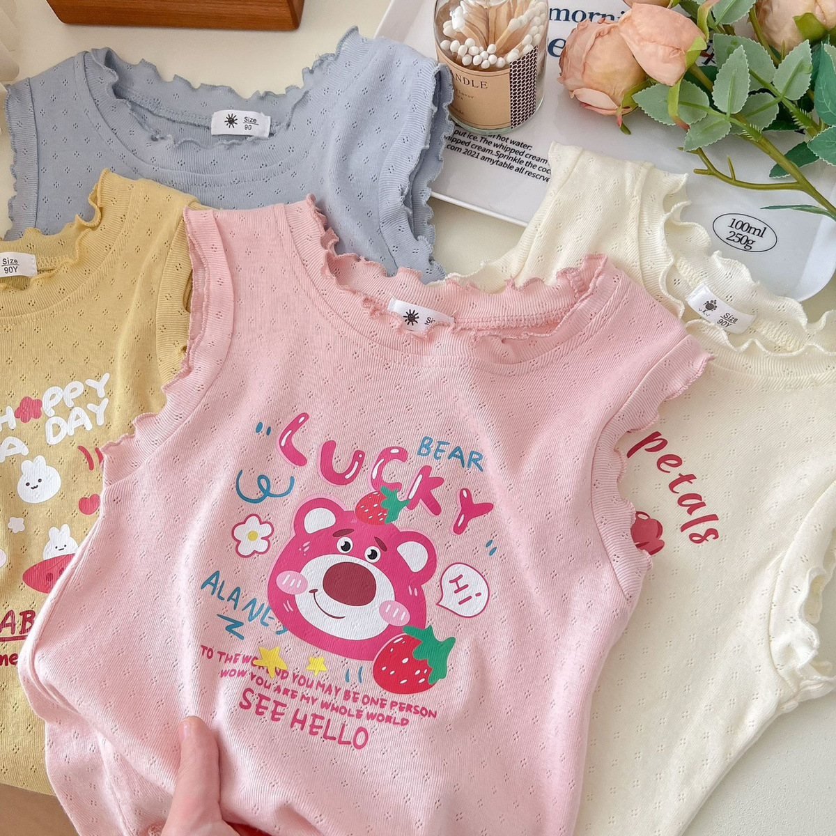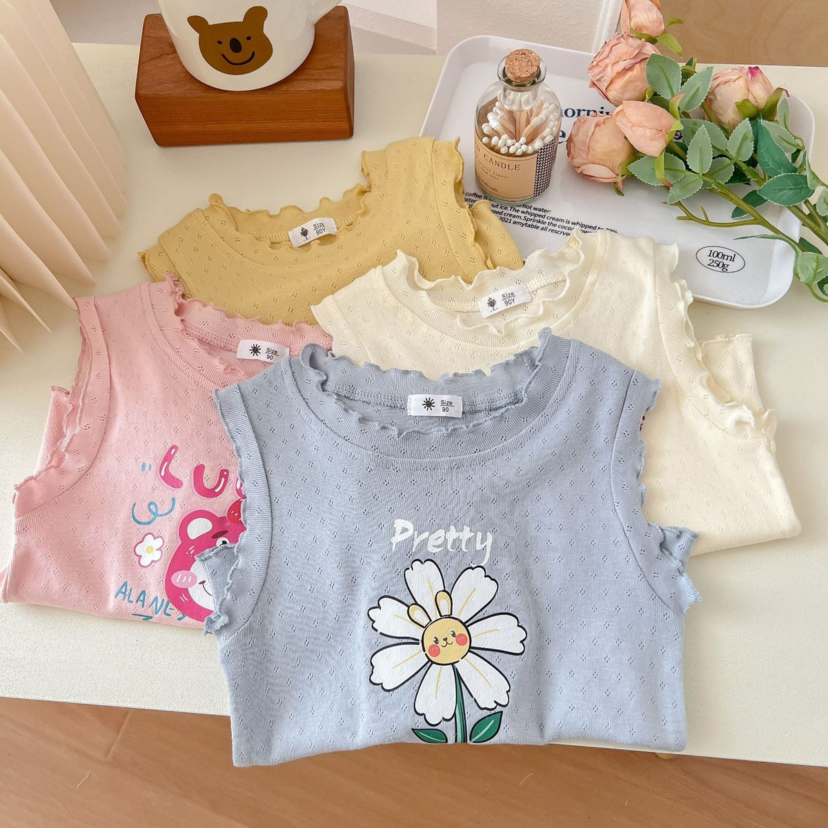 여름 새로운 25 여름 어린이 레이스 귀여운 작은 조끼 소녀 아기 인쇄 만화 좋은 면 민소매 조끼스토어 가기